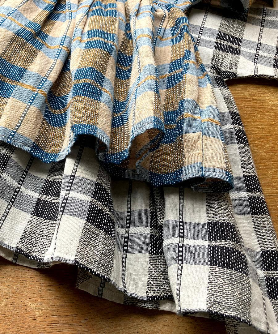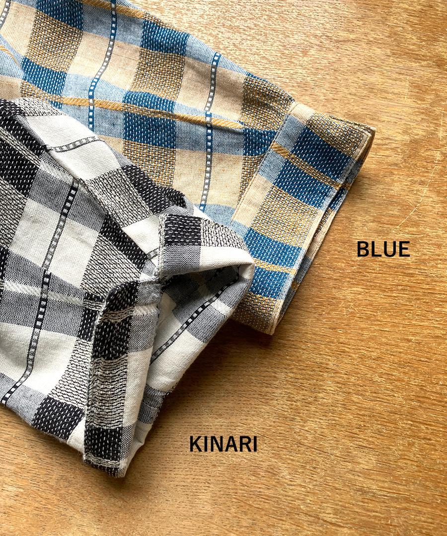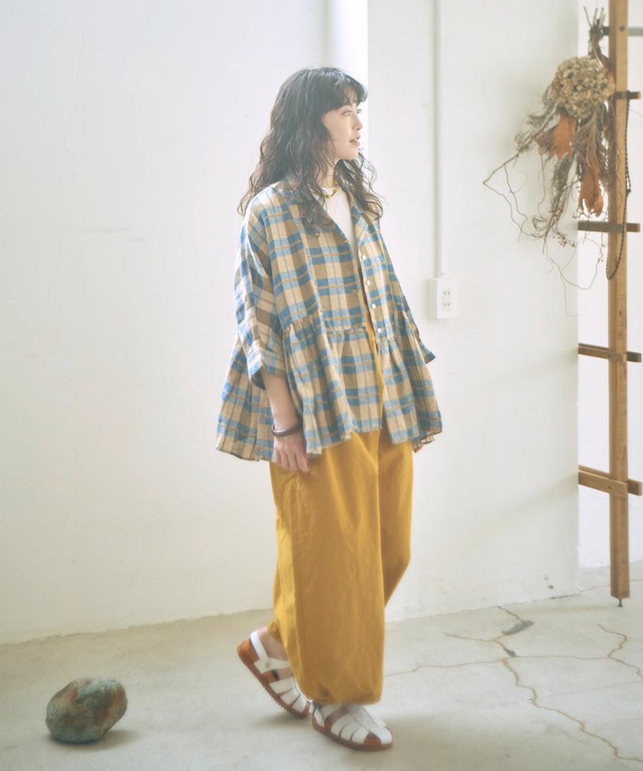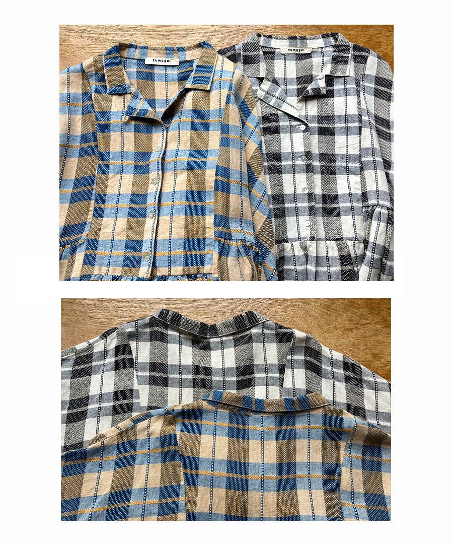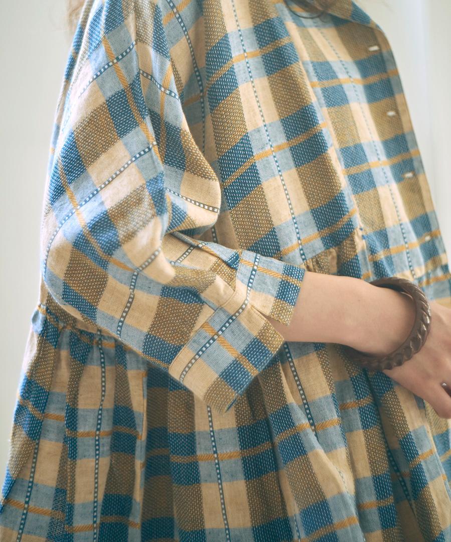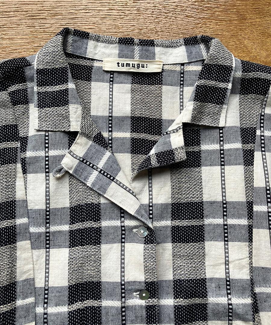 インドで丁寧に織り上げられた格子織りの生地を、糸の段階から染め上げる「先染め」で仕上げたチェック柄ブラウス。ツムグオリジナルデザインです。