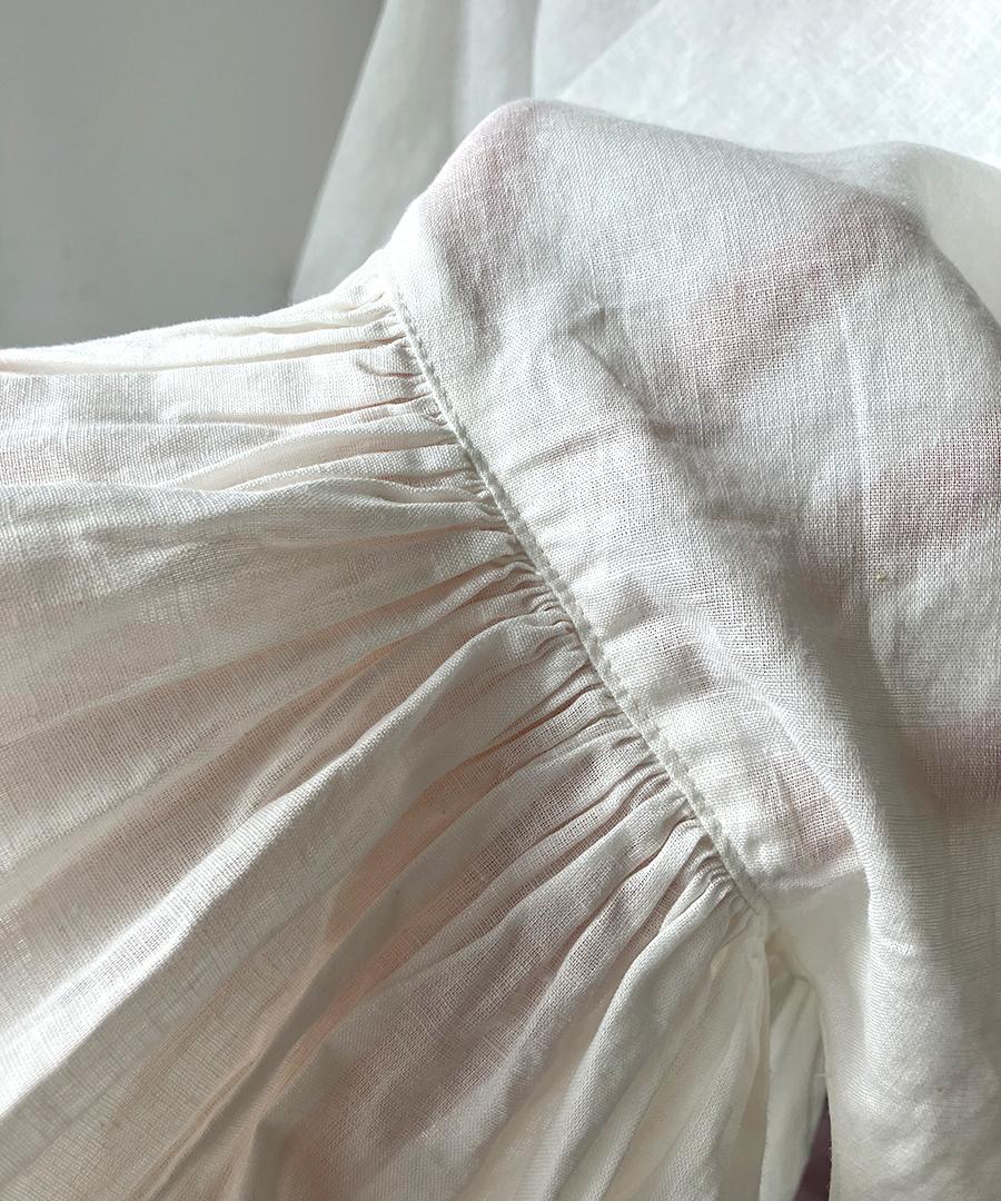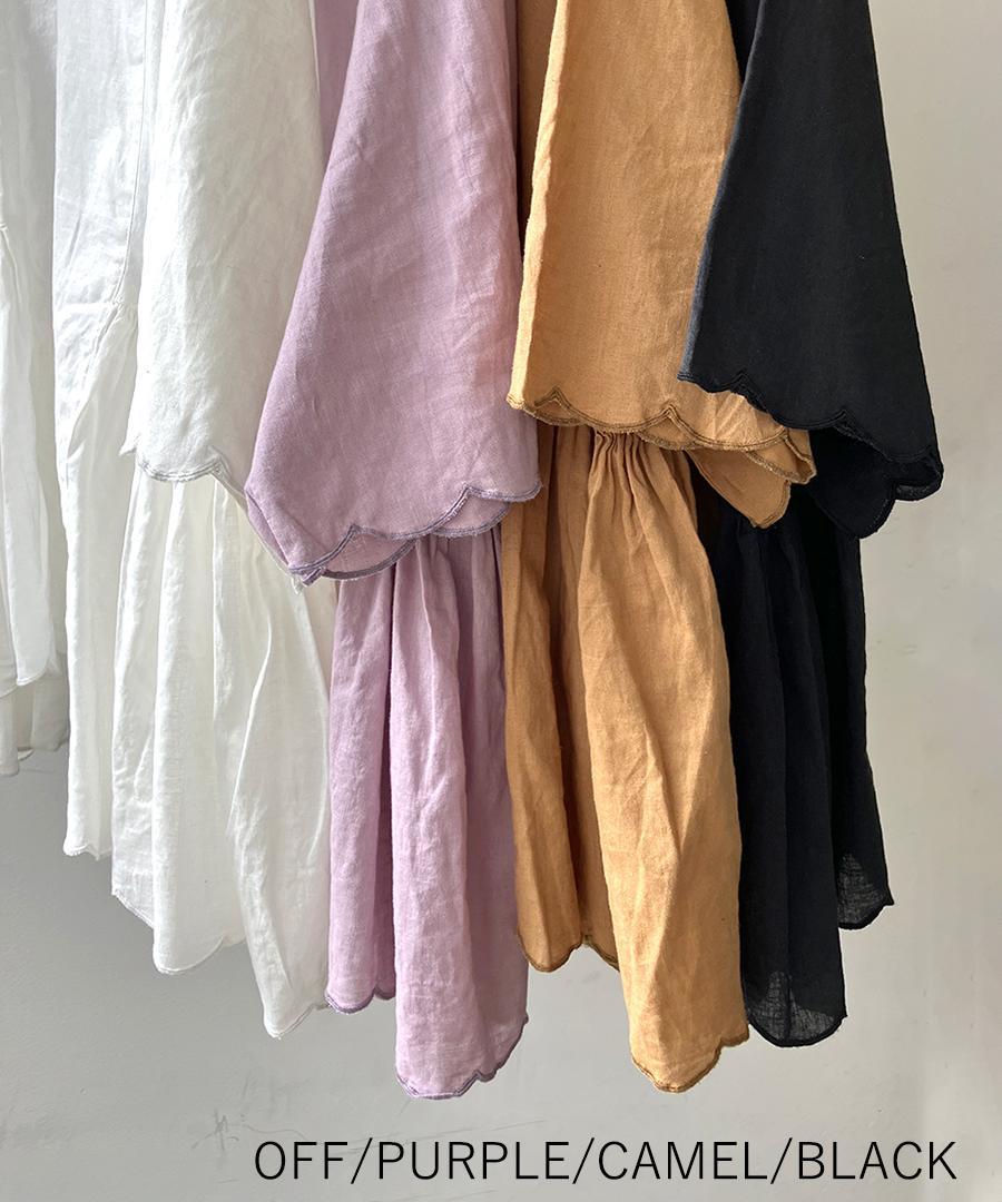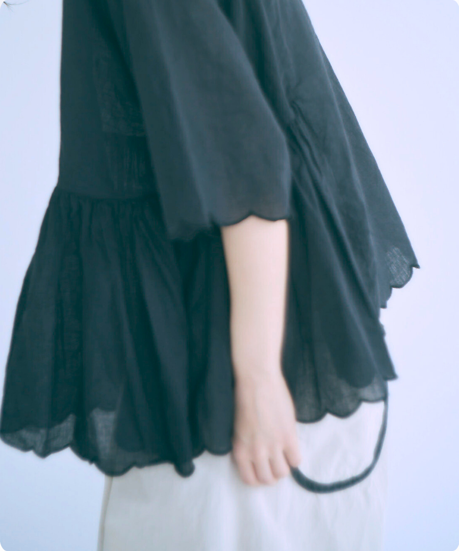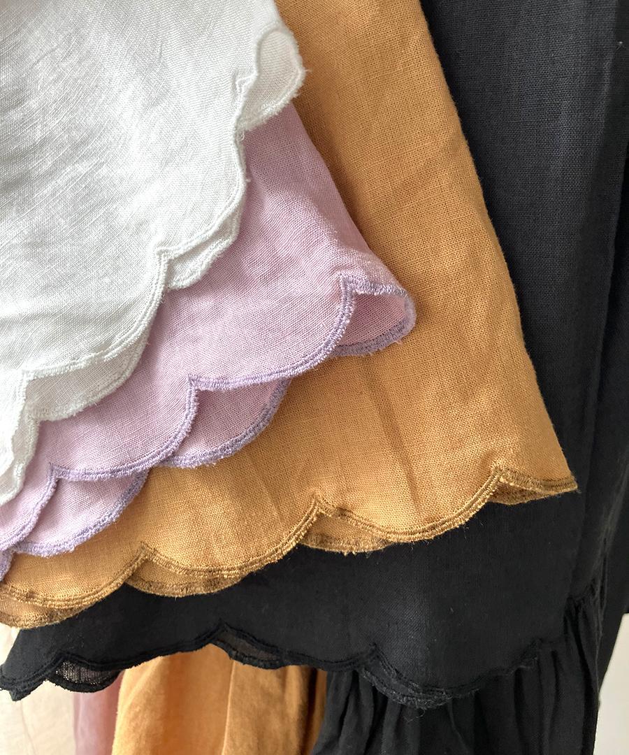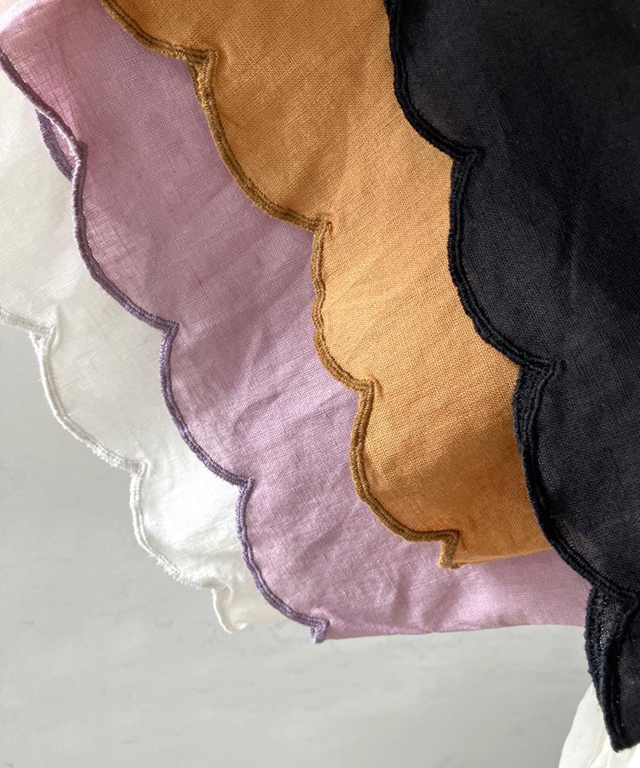 薄手のコットンリネンボイル生地を使用し、オリジナルのスカラップ柄をパーツに沿って刺繍しました。