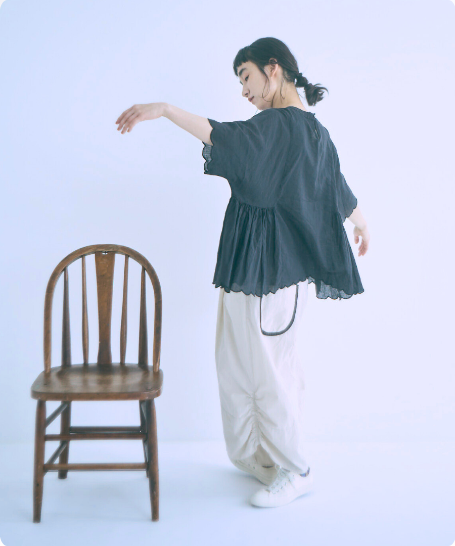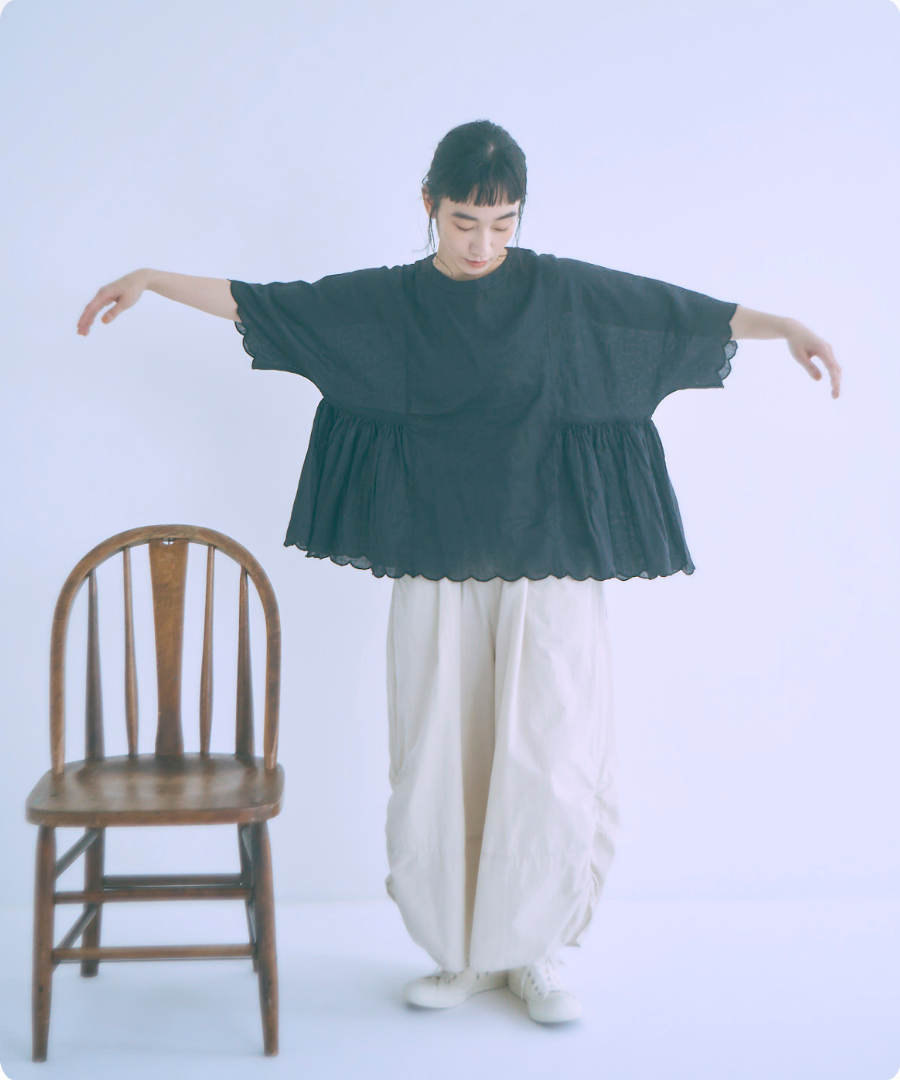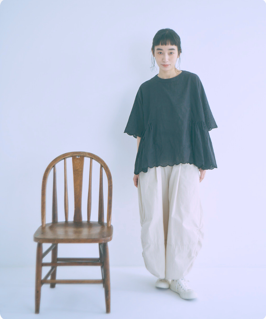 涼しげな素材感と、さりげなくも印象的なスカラップ刺繍、リラックス感のあるシルエットが魅力のプルオーバー。