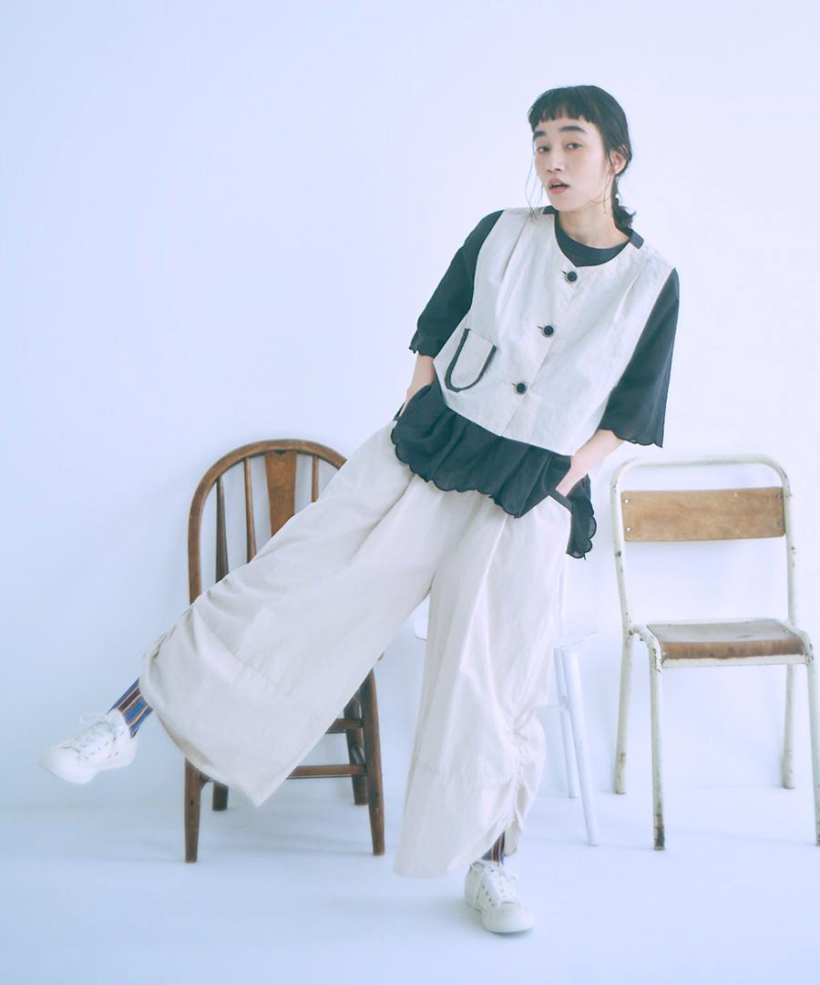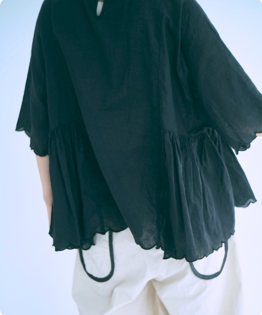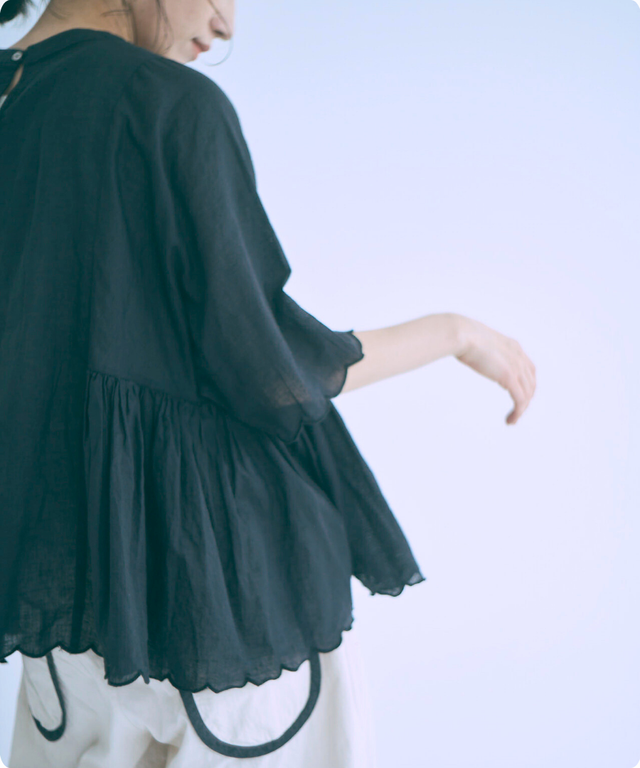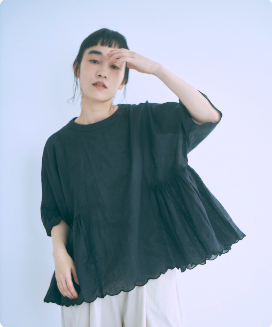 涼しげな素材感と、さりげなくも印象的なスカラップ刺繍、リラックス感のあるシルエットが魅力のプルオーバー。