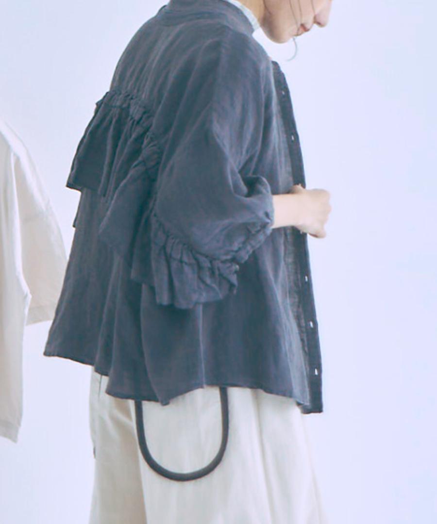 ボタンを留めてフリルを主役にしたブラウスとしてはもちろん、前を開けて羽織りとして着用すれば、Tシャツやタンクトップの上に軽やかなレイヤードスタイルが楽しめます。