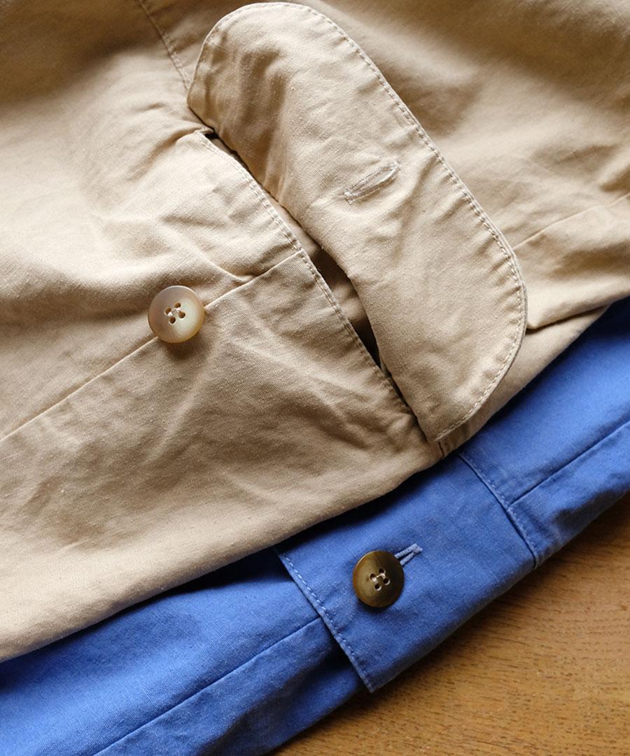 倉敷染めのヘンプ混高密度ウェザー素材は、耐久性がありながらも軽やかで柔らかな肌触り。