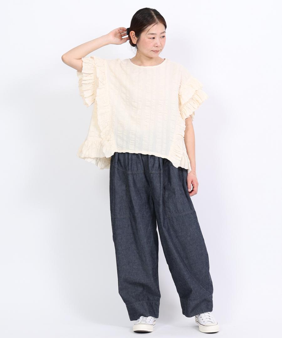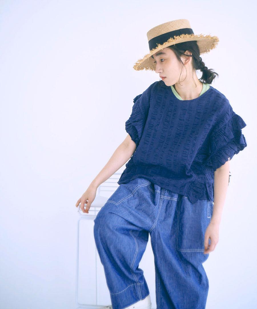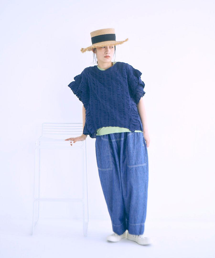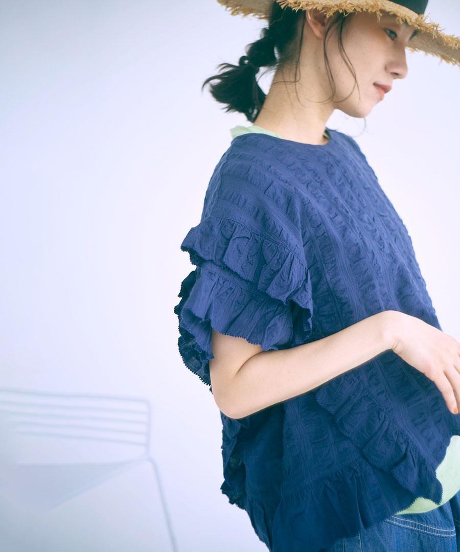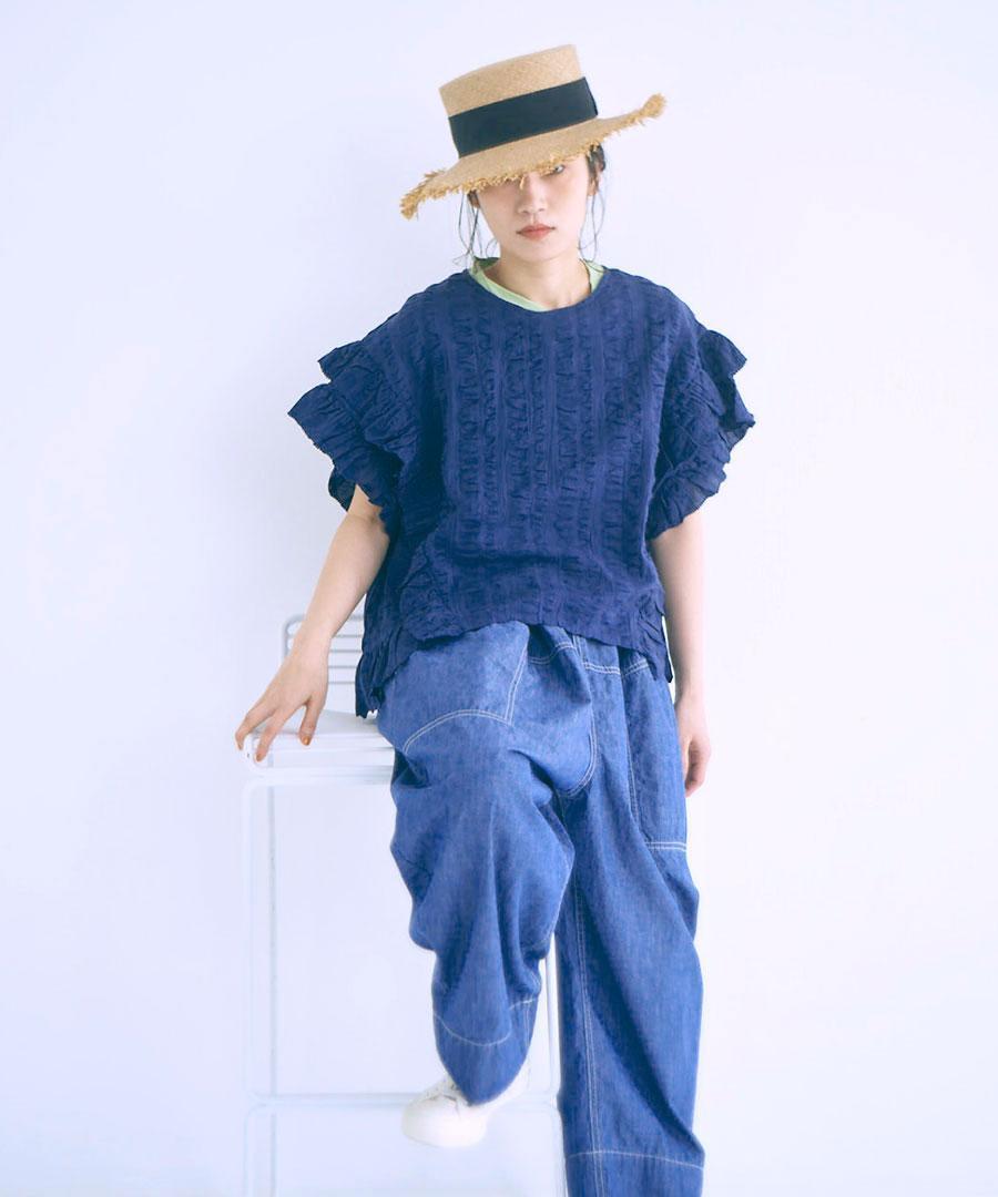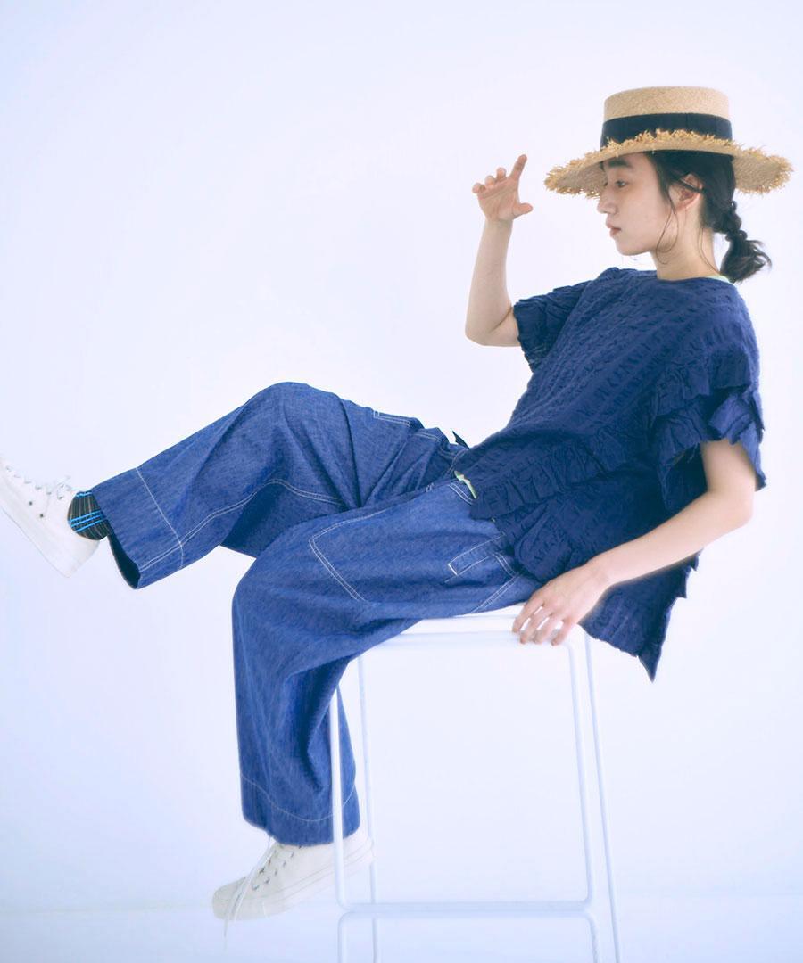 随所にあしらわれたフリルが、シンプルなシルエットの中に華やかさとフェミニンな印象をプラス。