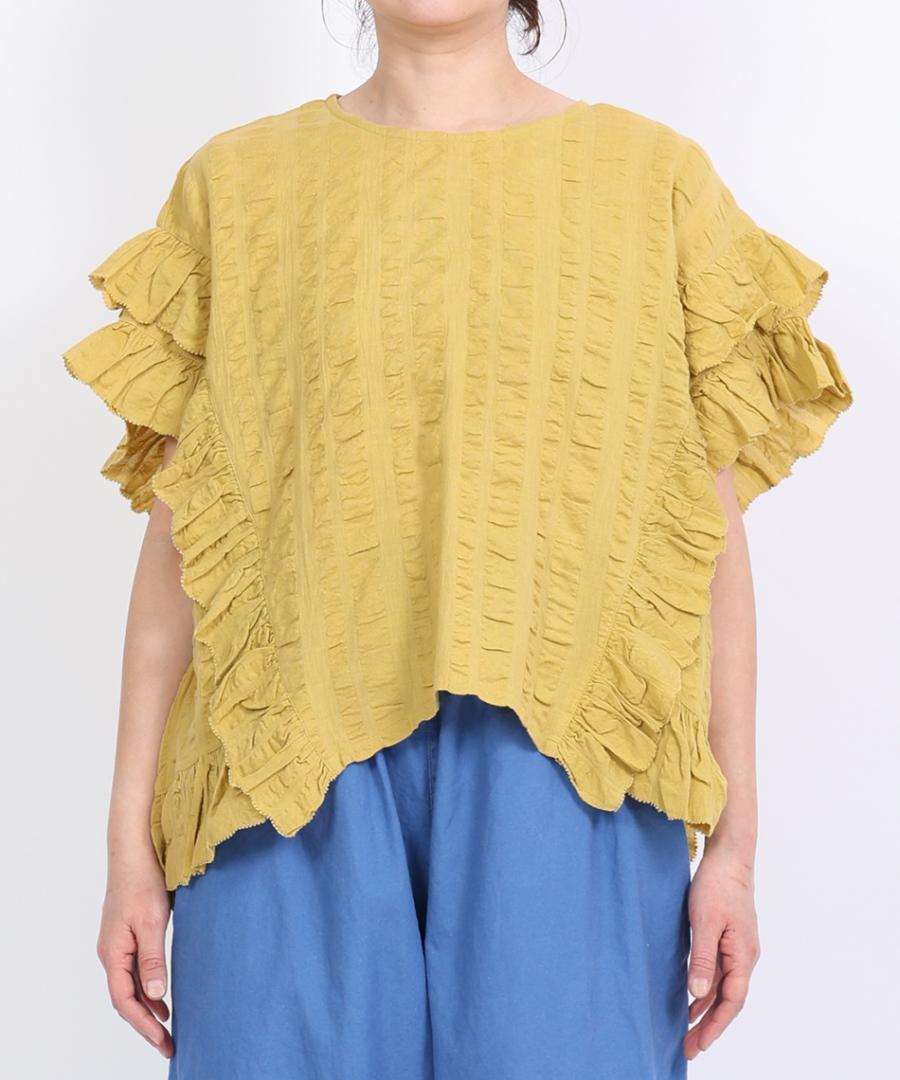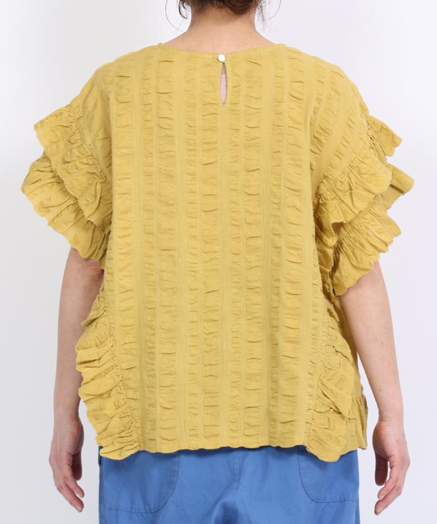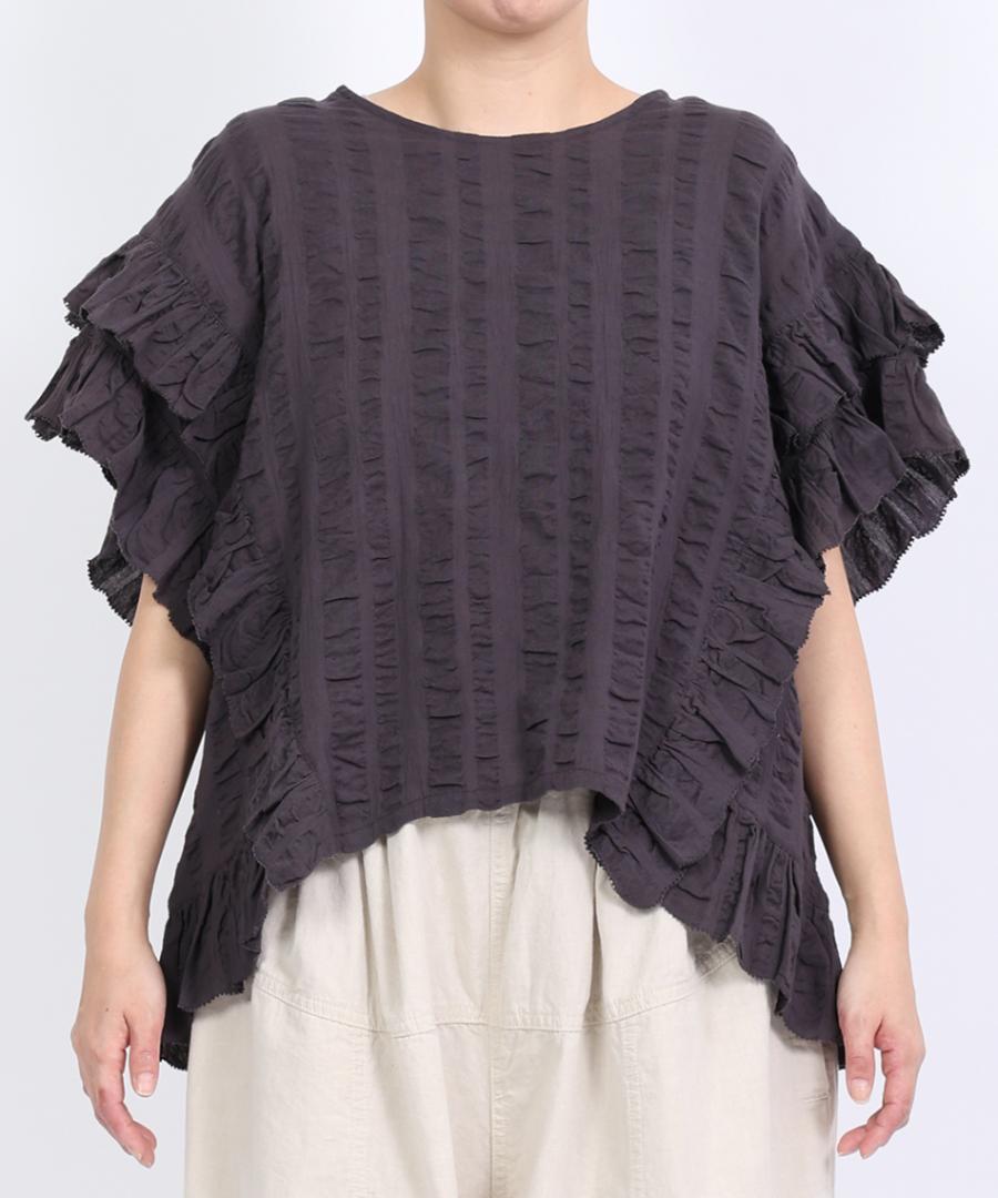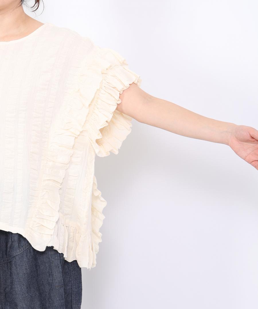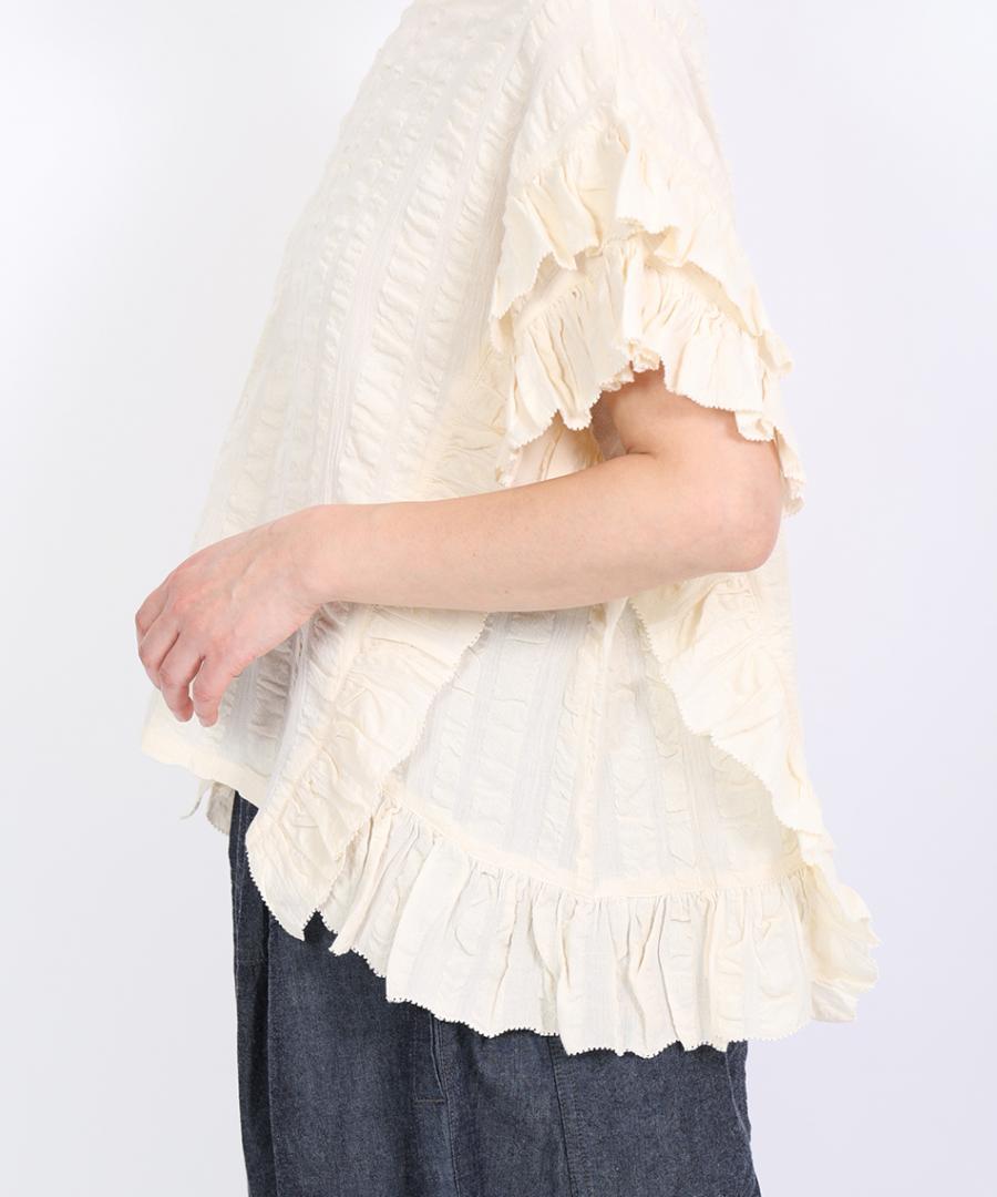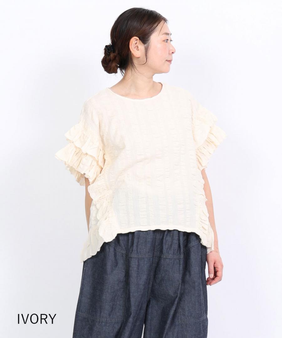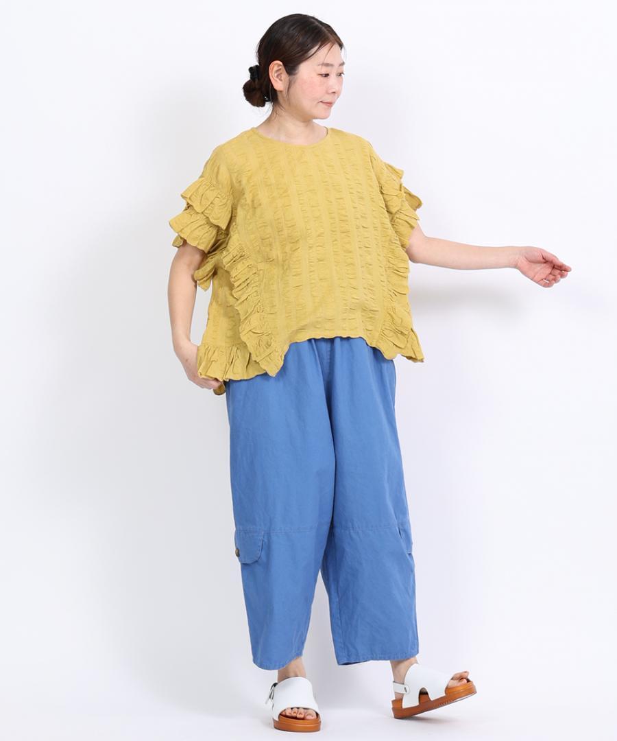 随所にあしらわれたフリルが、シンプルなシルエットの中に華やかさとフェミニンな印象をプラス。