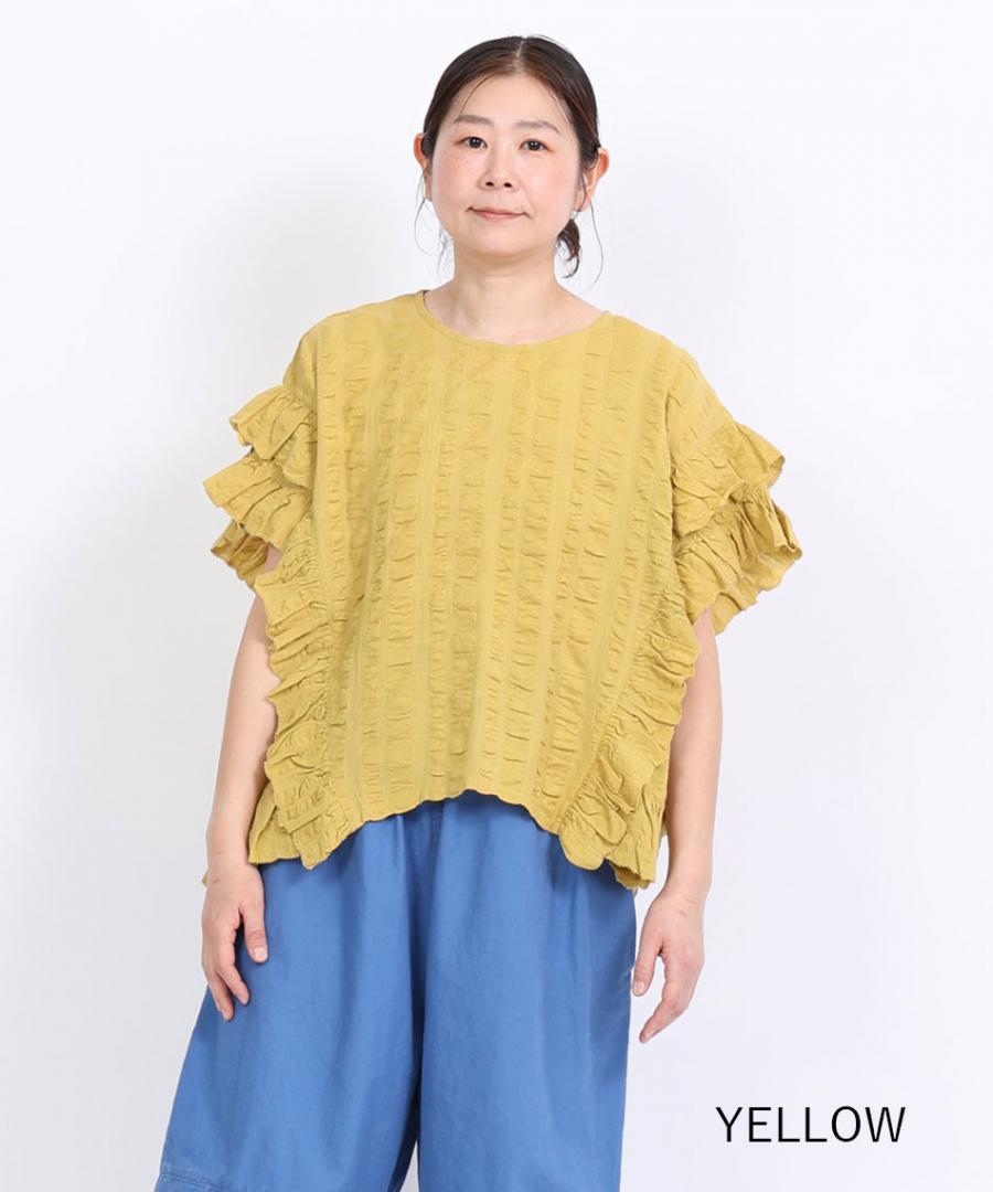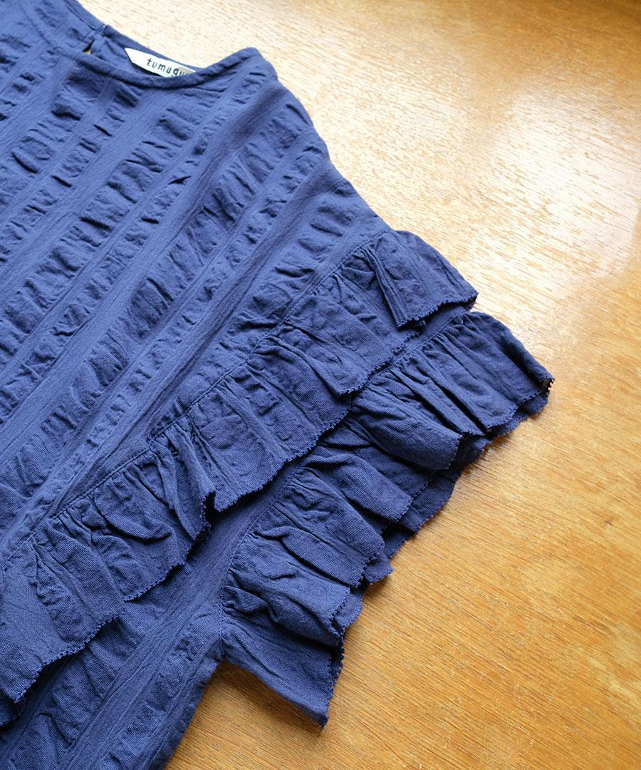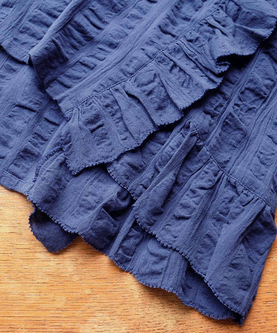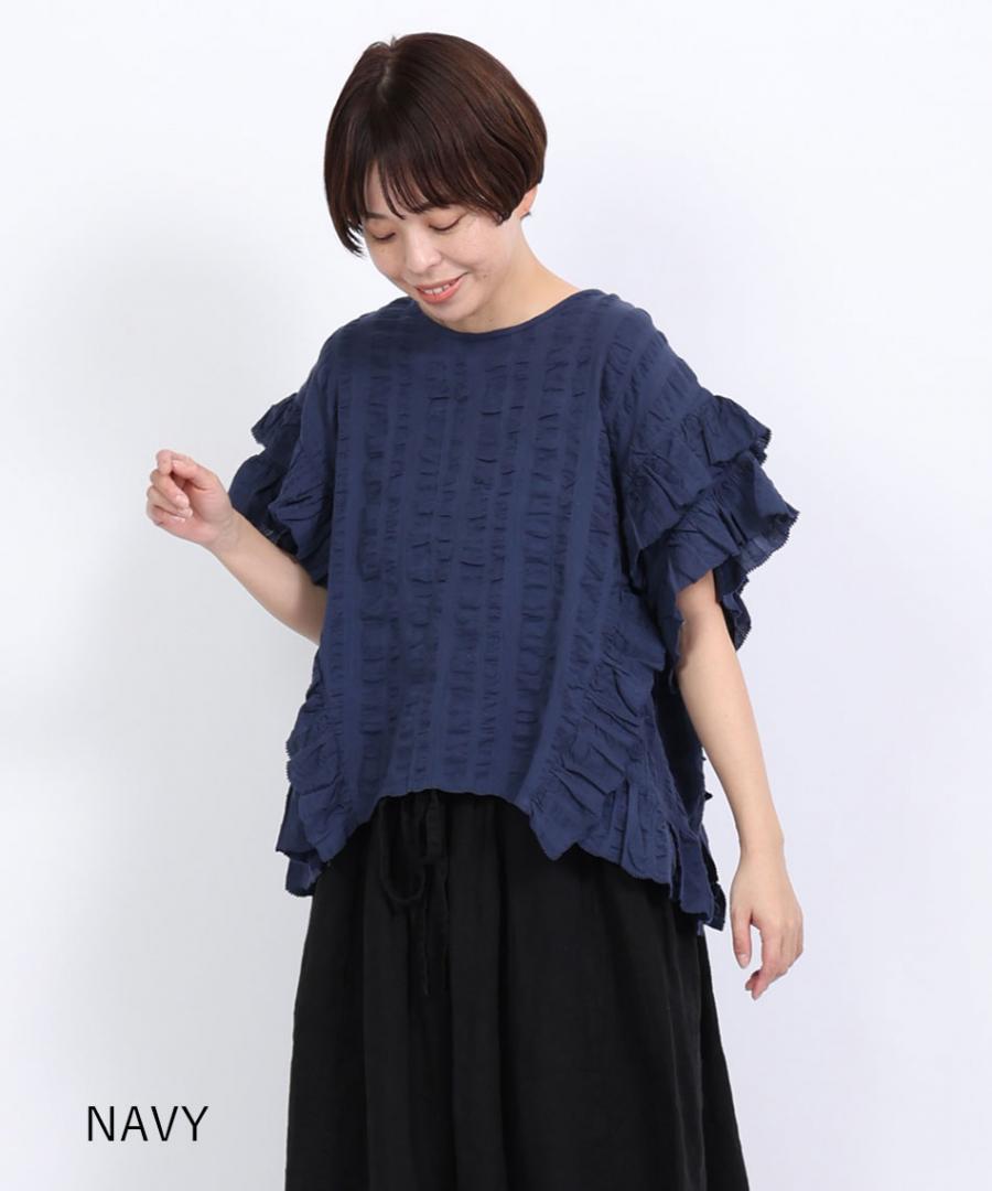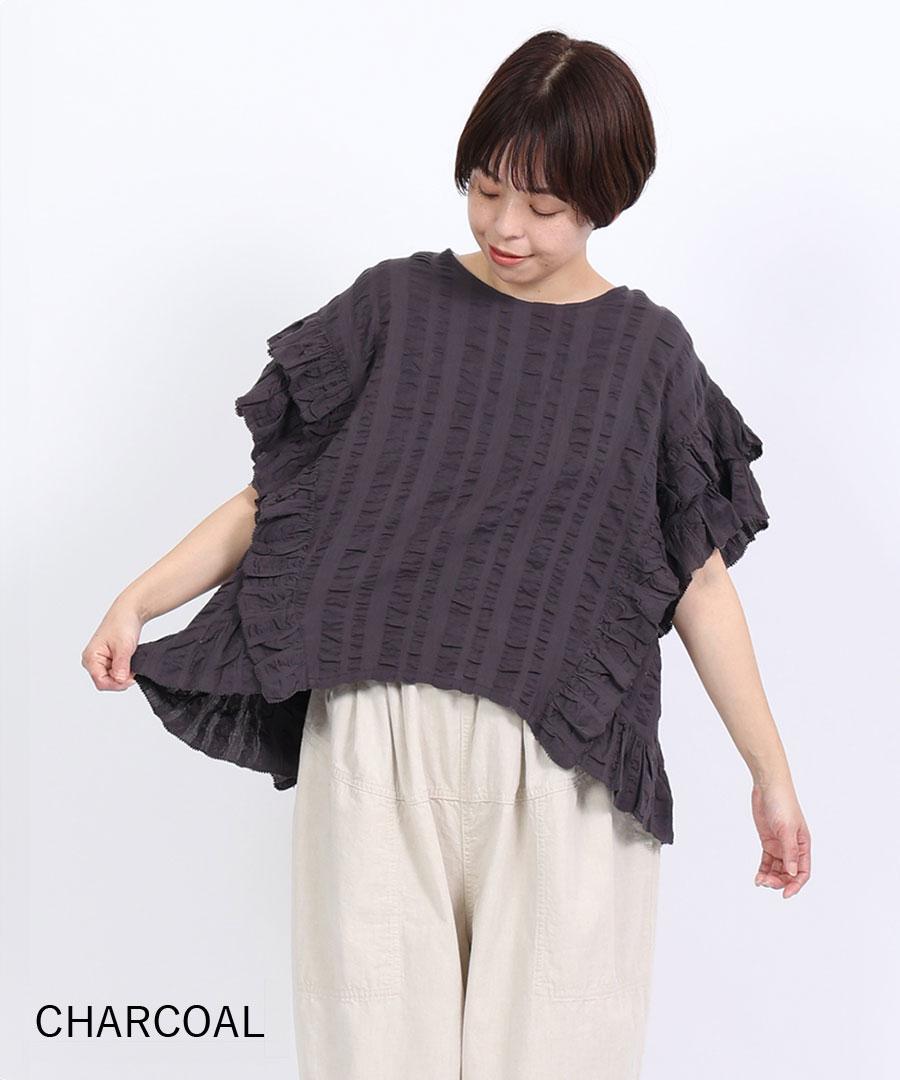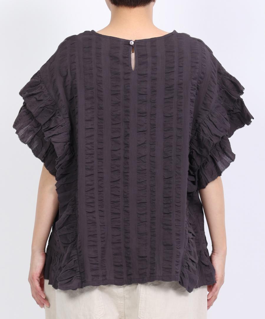 随所にあしらわれたフリルが、シンプルなシルエットの中に華やかさとフェミニンな印象をプラス。