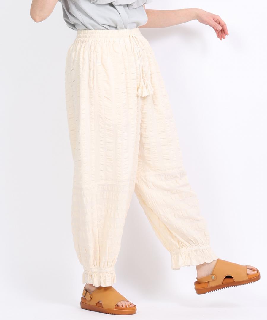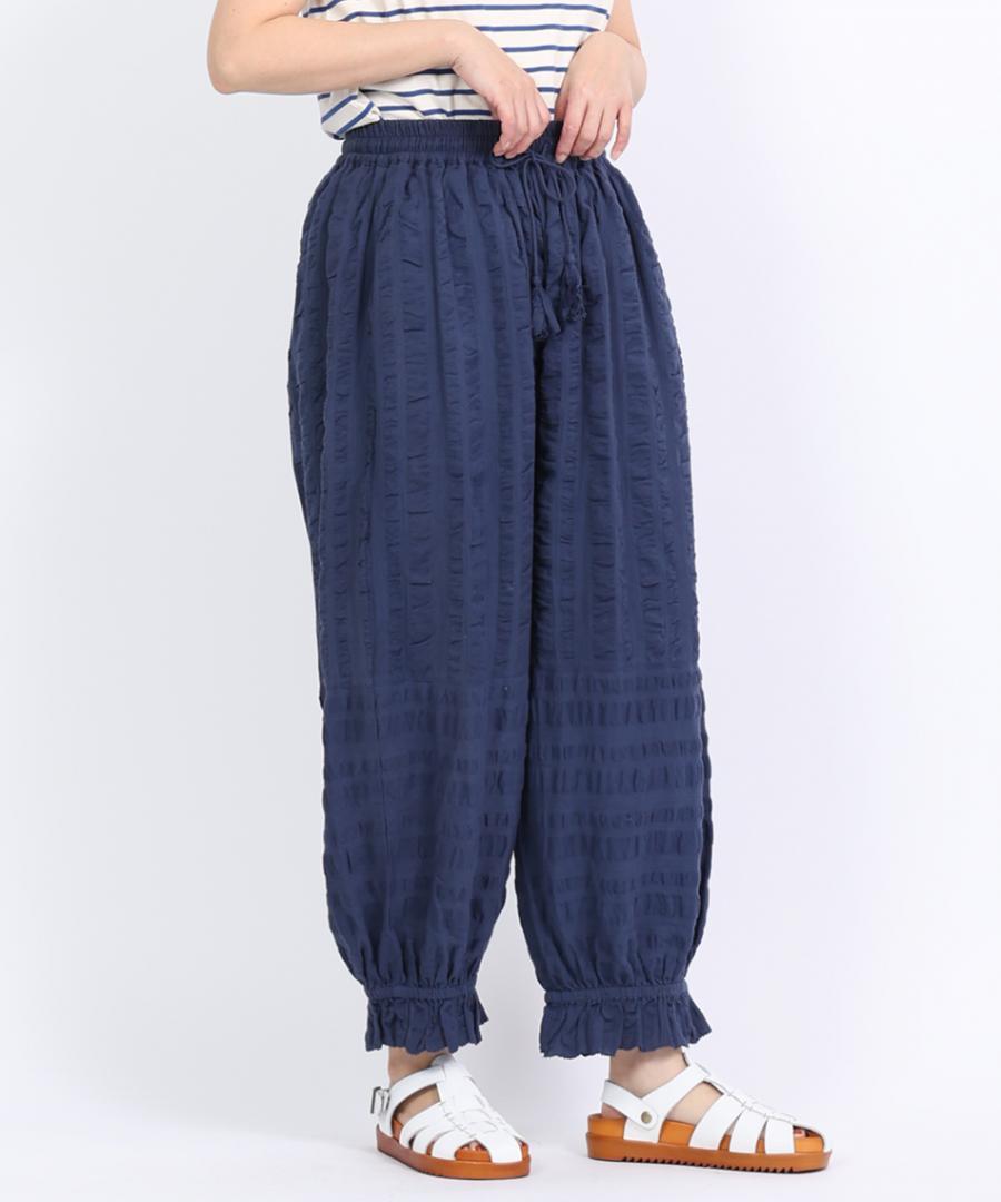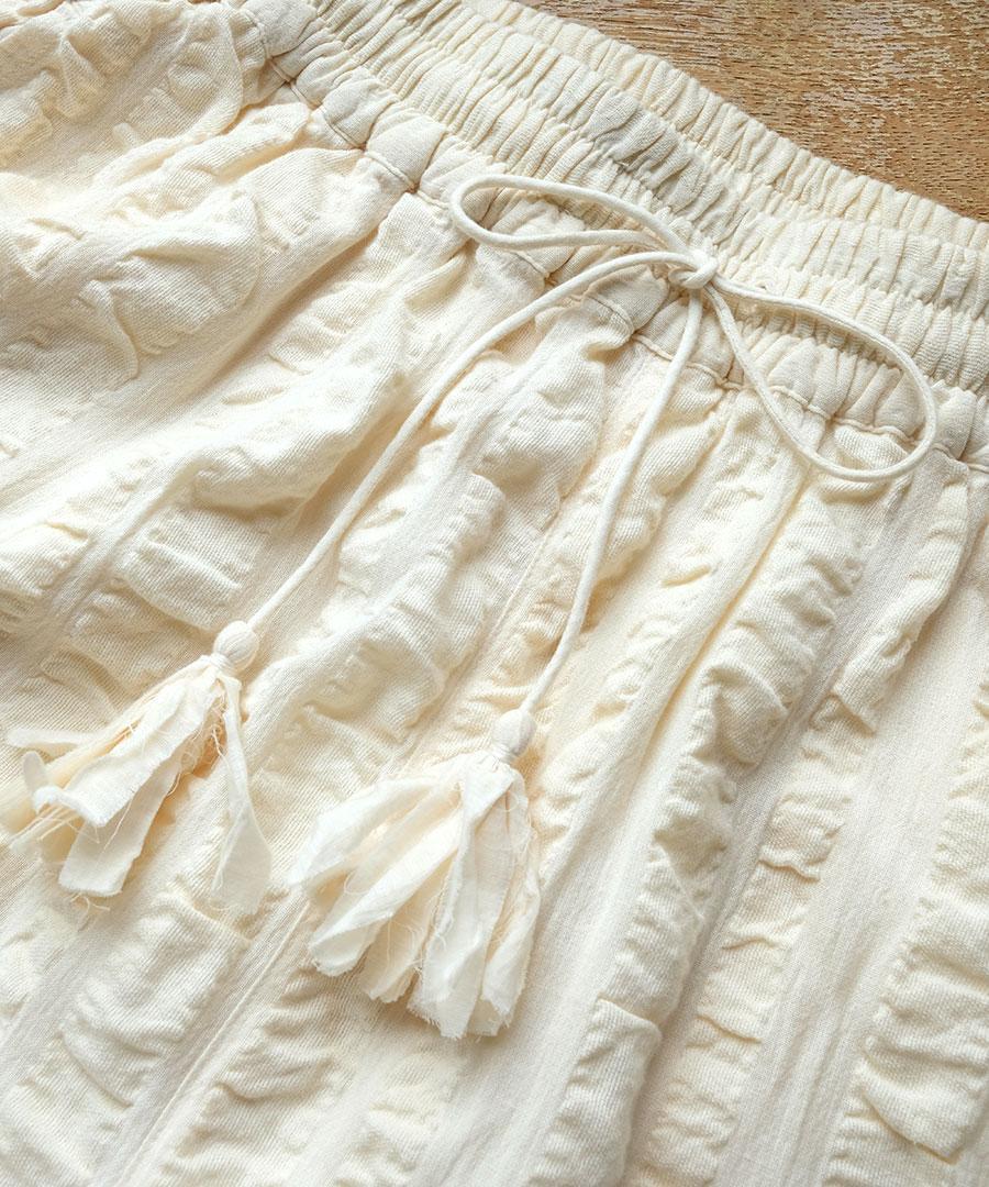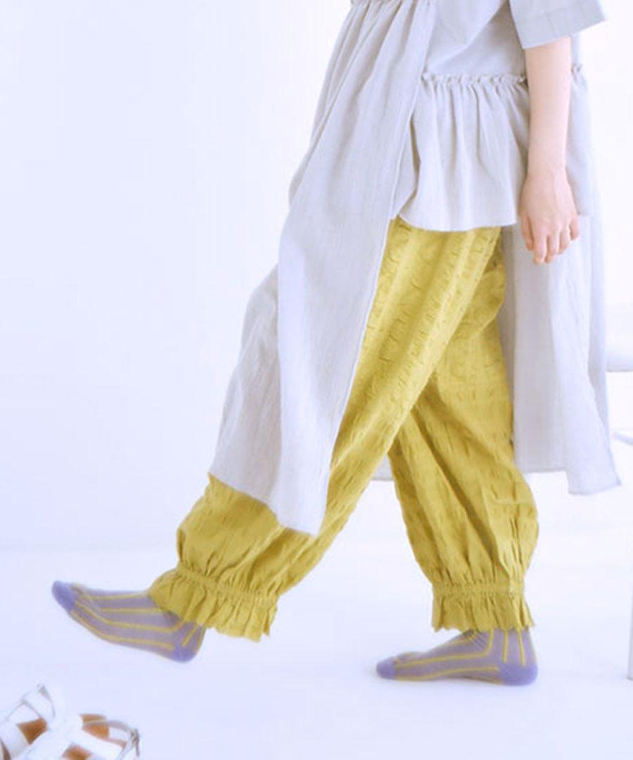 裾にはゴムシャーリングと可愛らしいフリルがあしらわれており、カジュアルながらもフェミニンな印象で足元に軽やかなアクセントを加えてくれます。