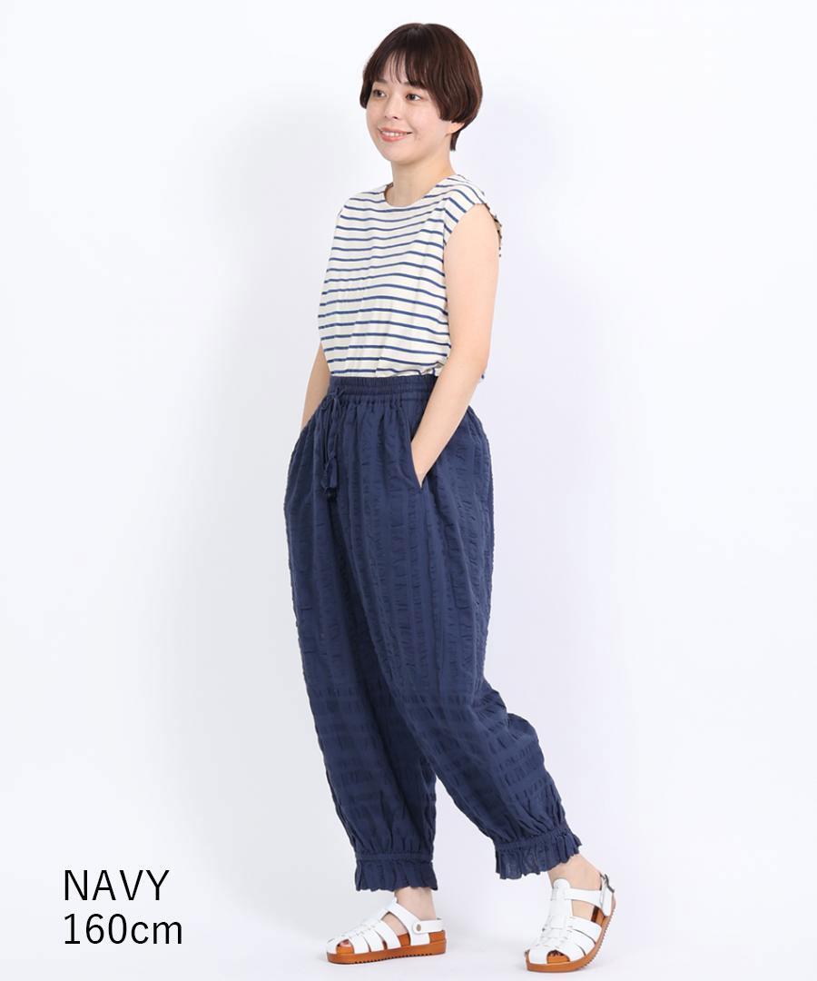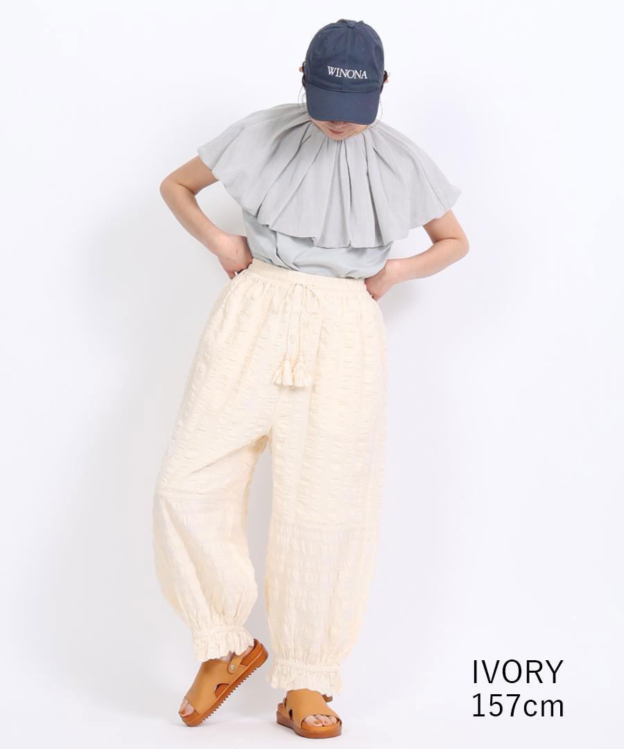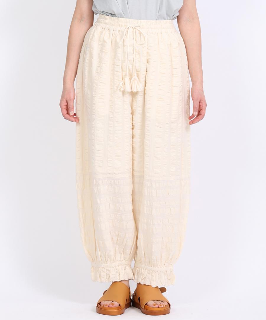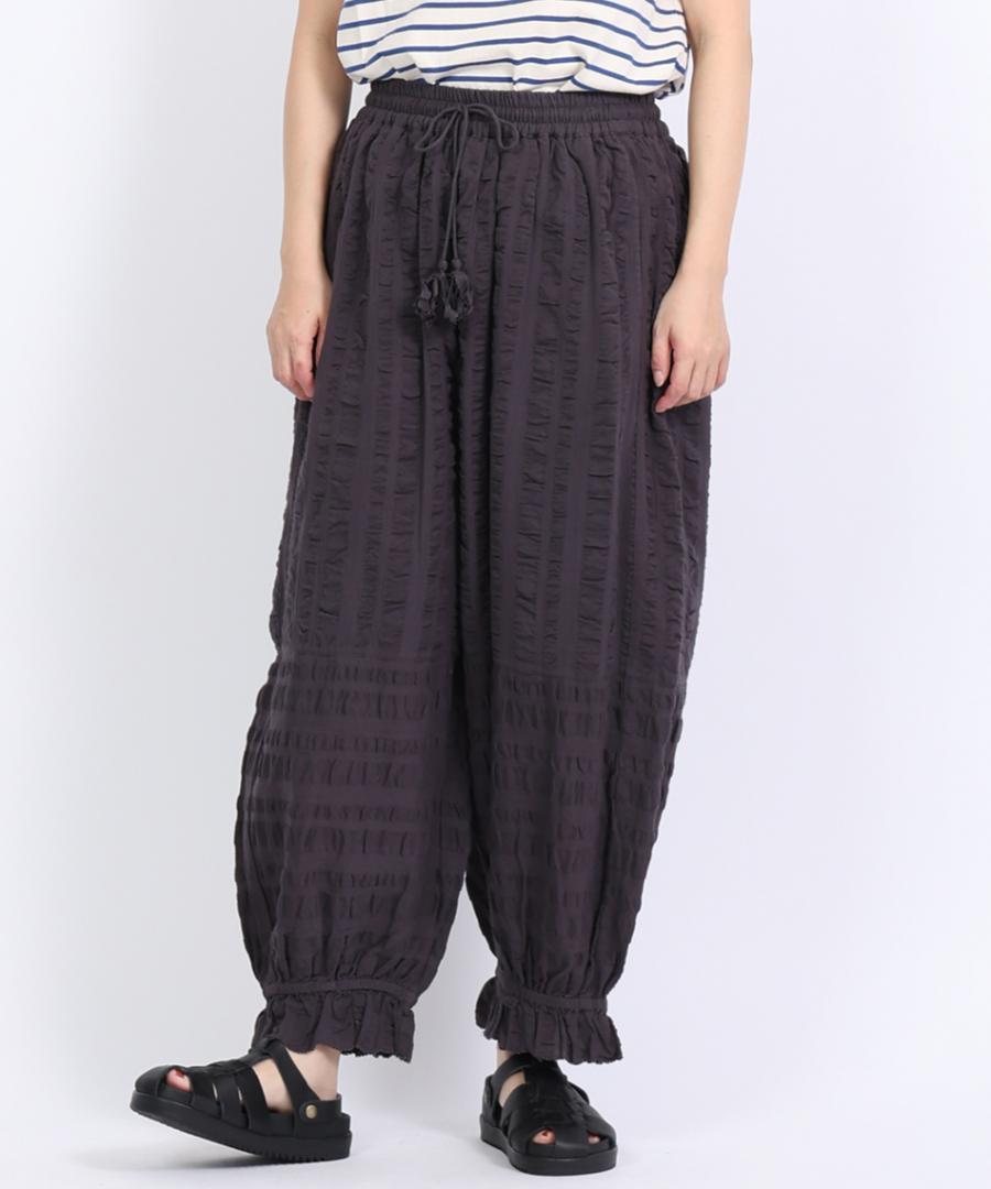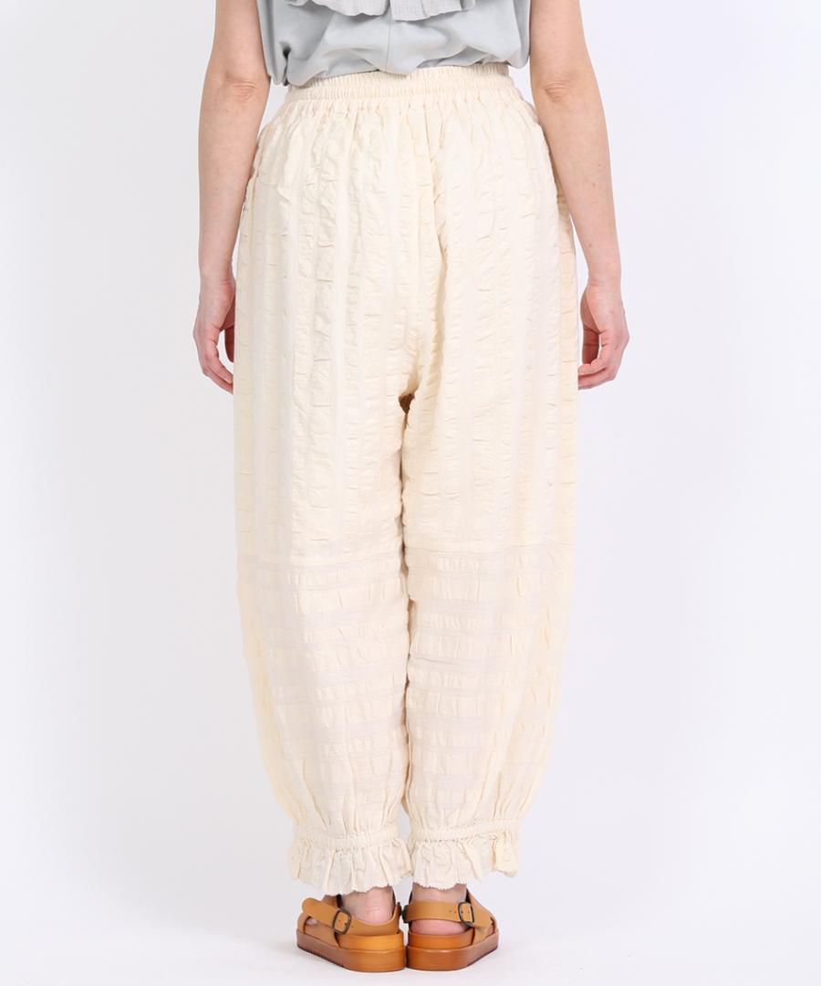 裾にはゴムシャーリングと可愛らしいフリルがあしらわれており、カジュアルながらもフェミニンな印象で足元に軽やかなアクセントを加えてくれます。