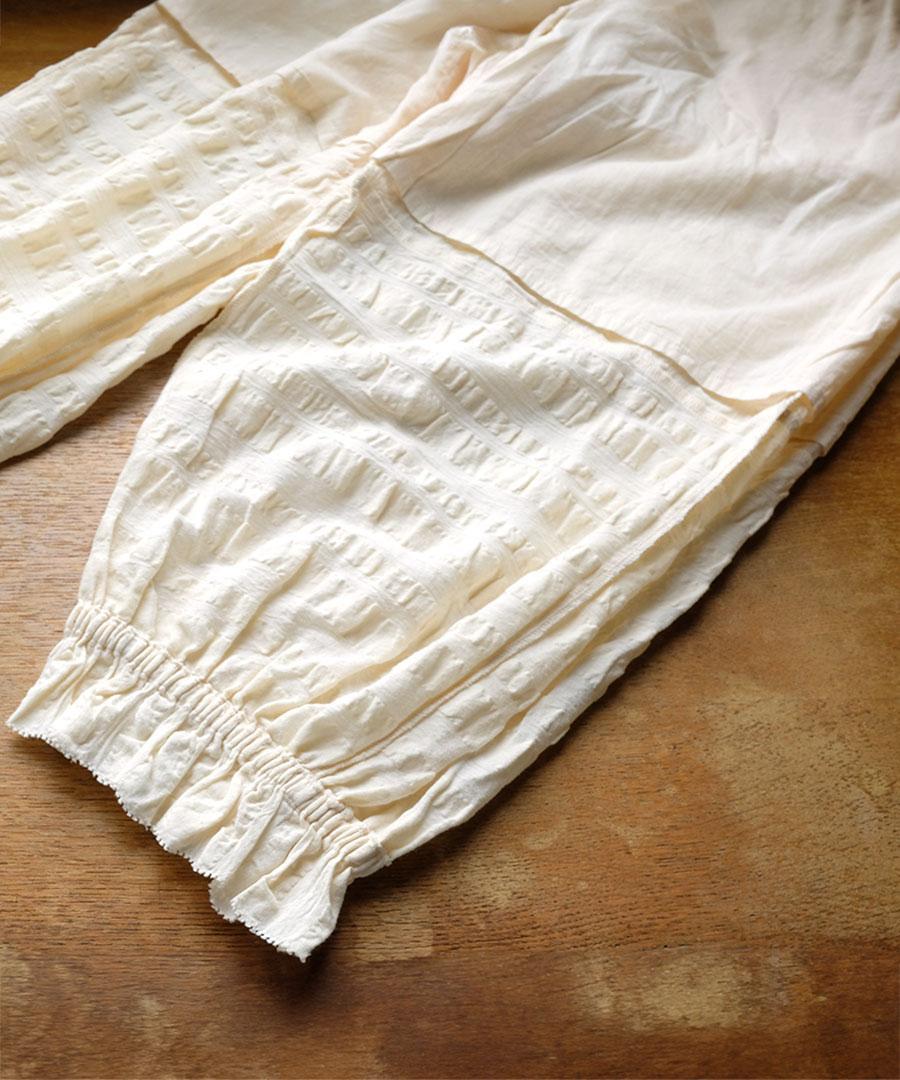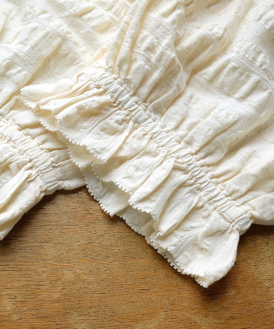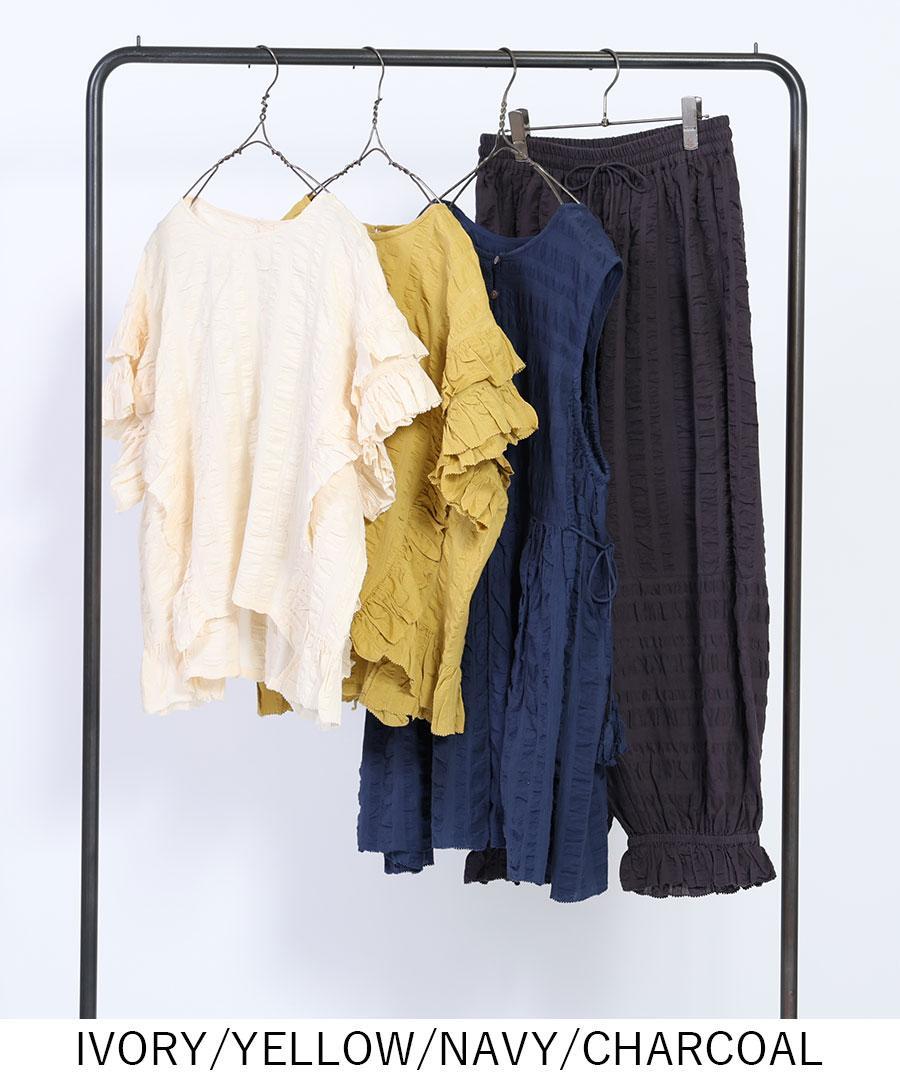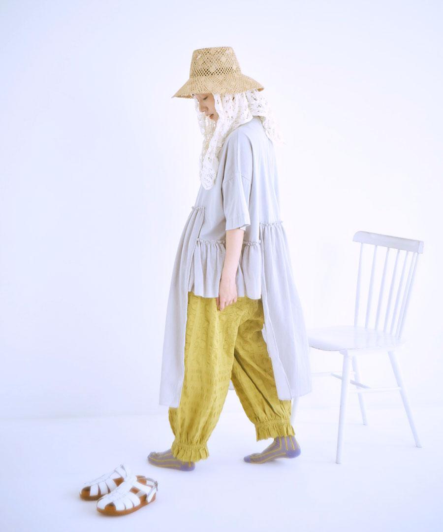 裾にはゴムシャーリングと可愛らしいフリルがあしらわれており、カジュアルながらもフェミニンな印象で足元に軽やかなアクセントを加えてくれます。