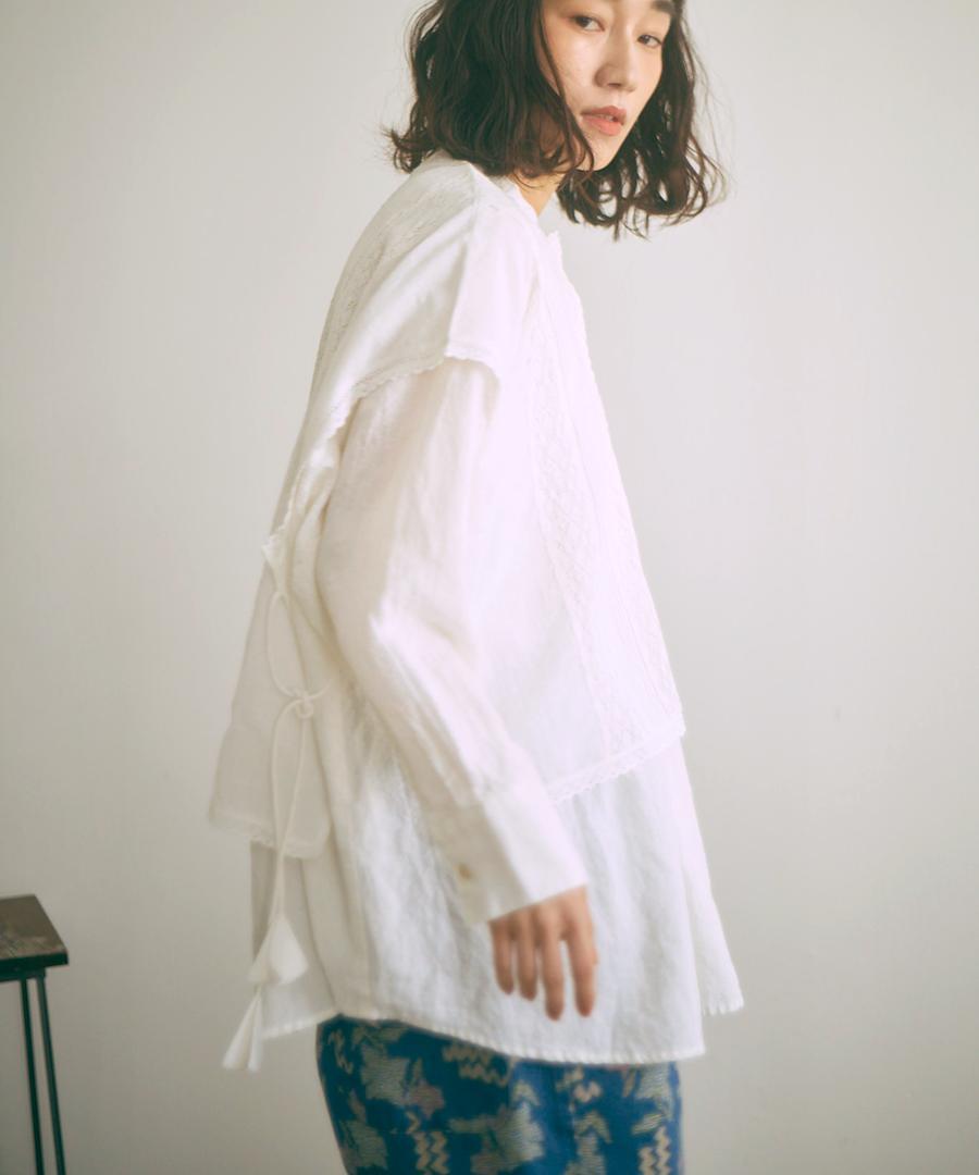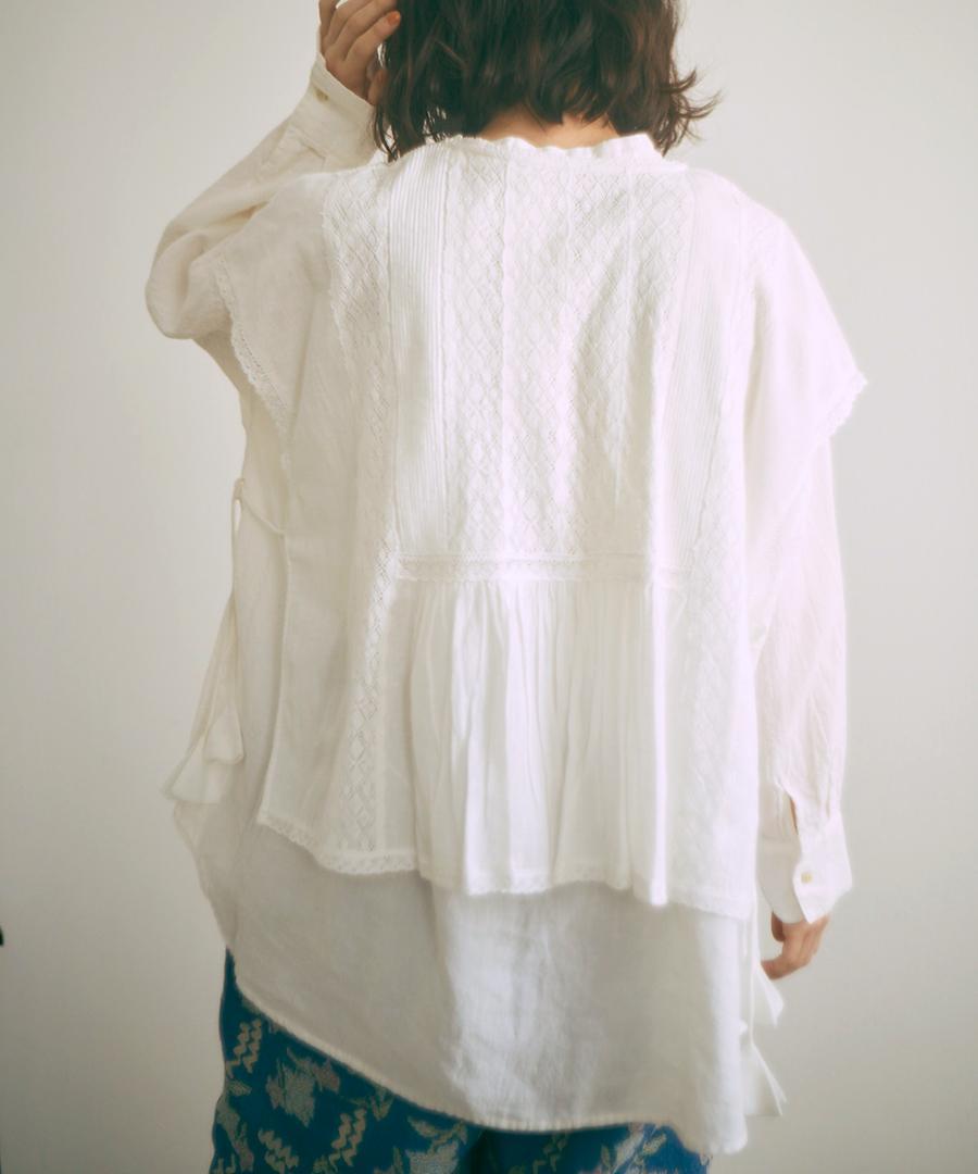胸元から肩、袖にかけて繊細なレースやピンタックをふんだんに施した贅沢な仕上がり。