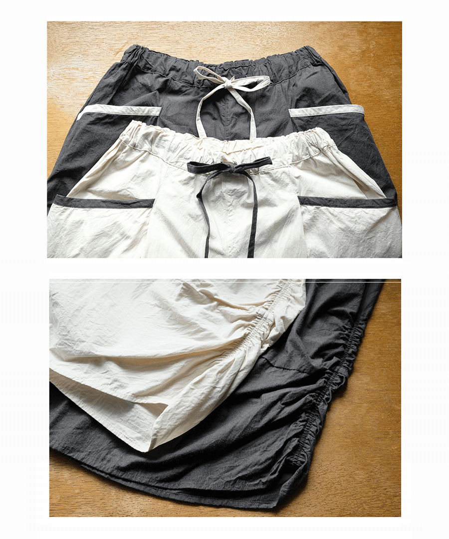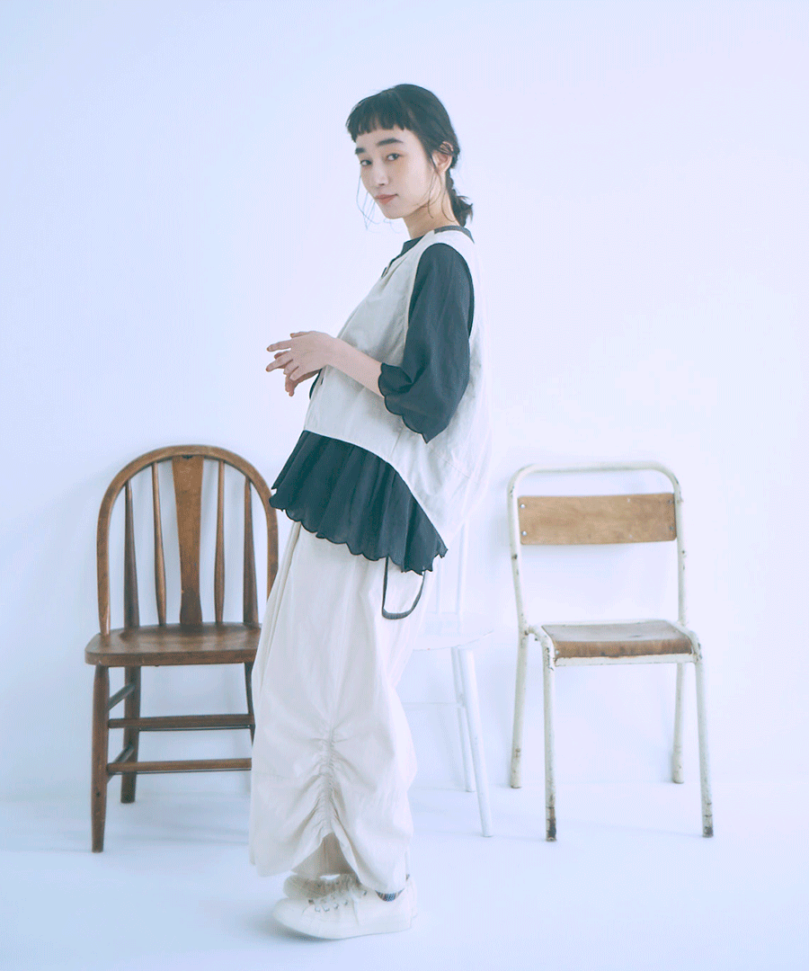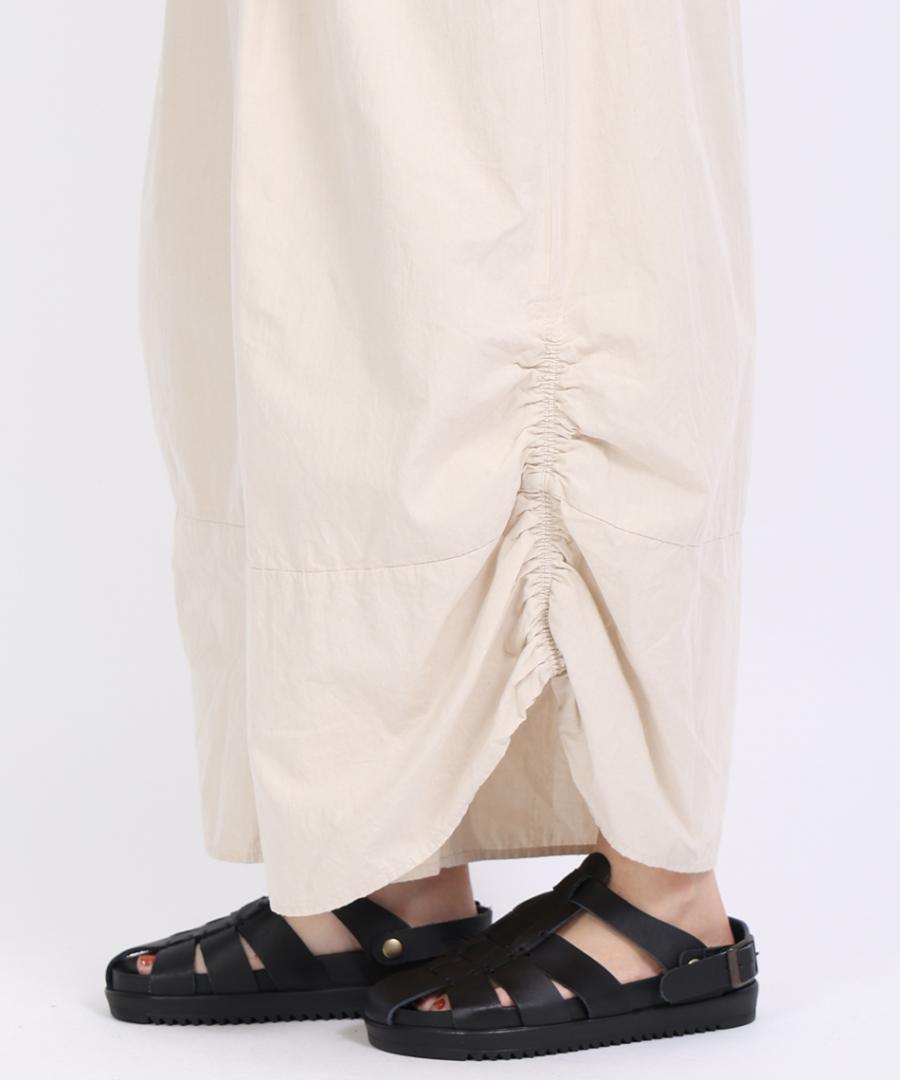裾の脇部分にゴムシャーリングが施されており、ユニークで動きのあるシルエットが特徴です。