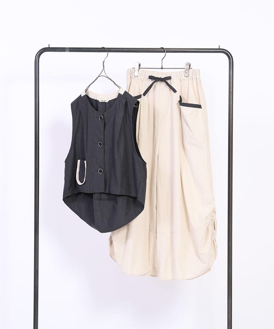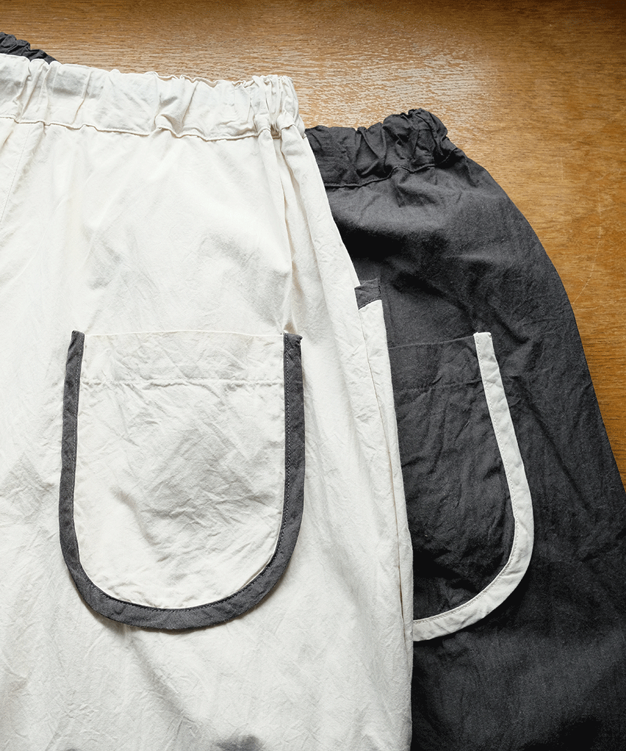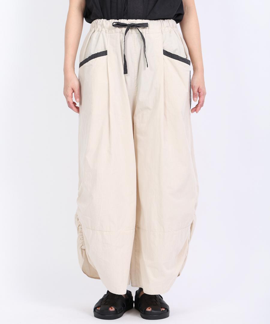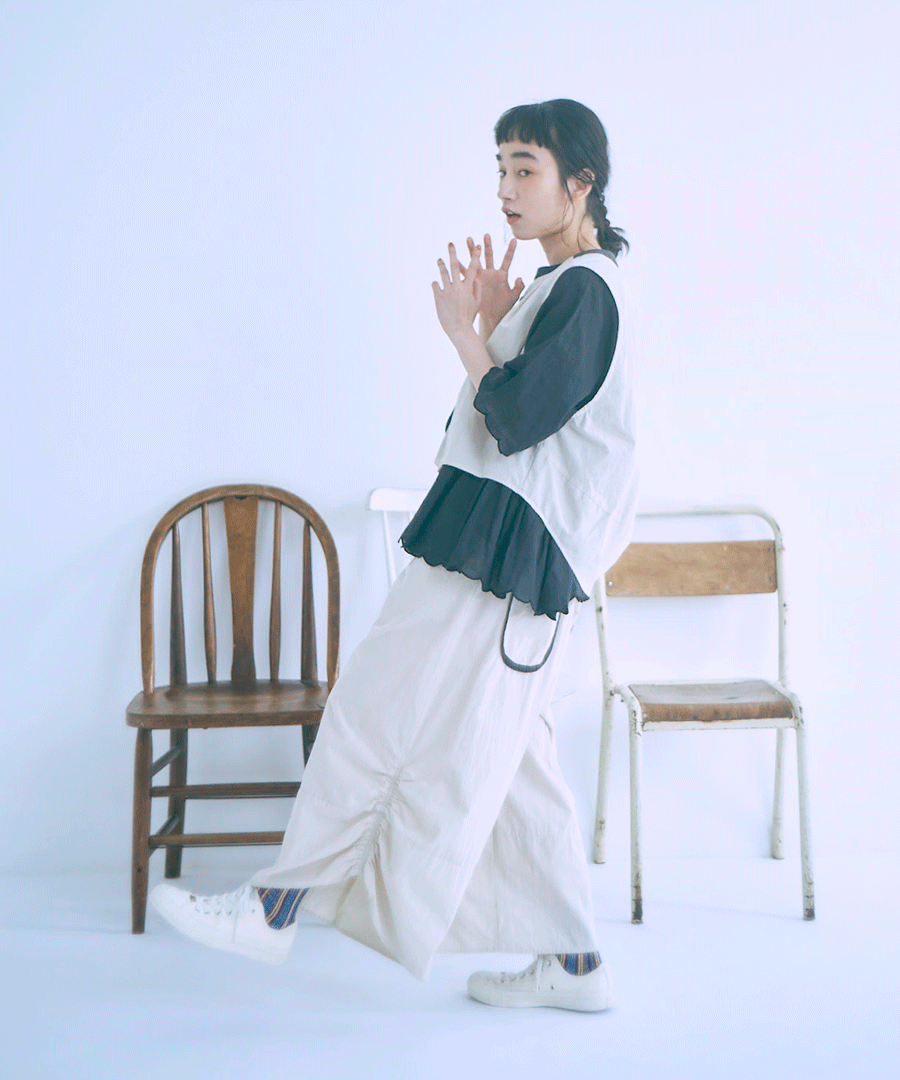 裾の脇部分にゴムシャーリングが施されており、ユニークで動きのあるシルエットが特徴です。