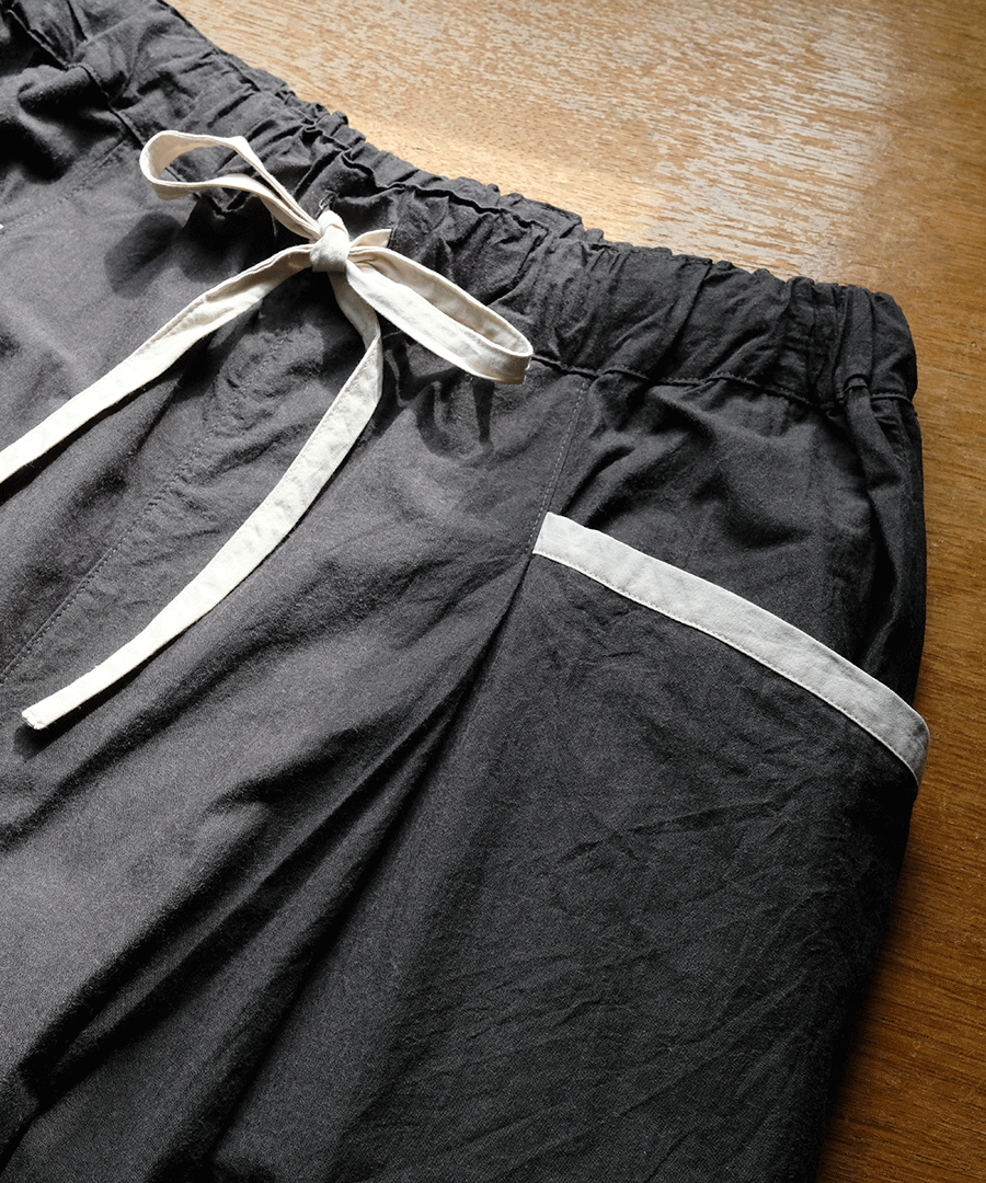 ウエストはゴム仕様で、さらにドローストリング(紐)で調節が可能となっており、好みのフィット感に調整できます。
