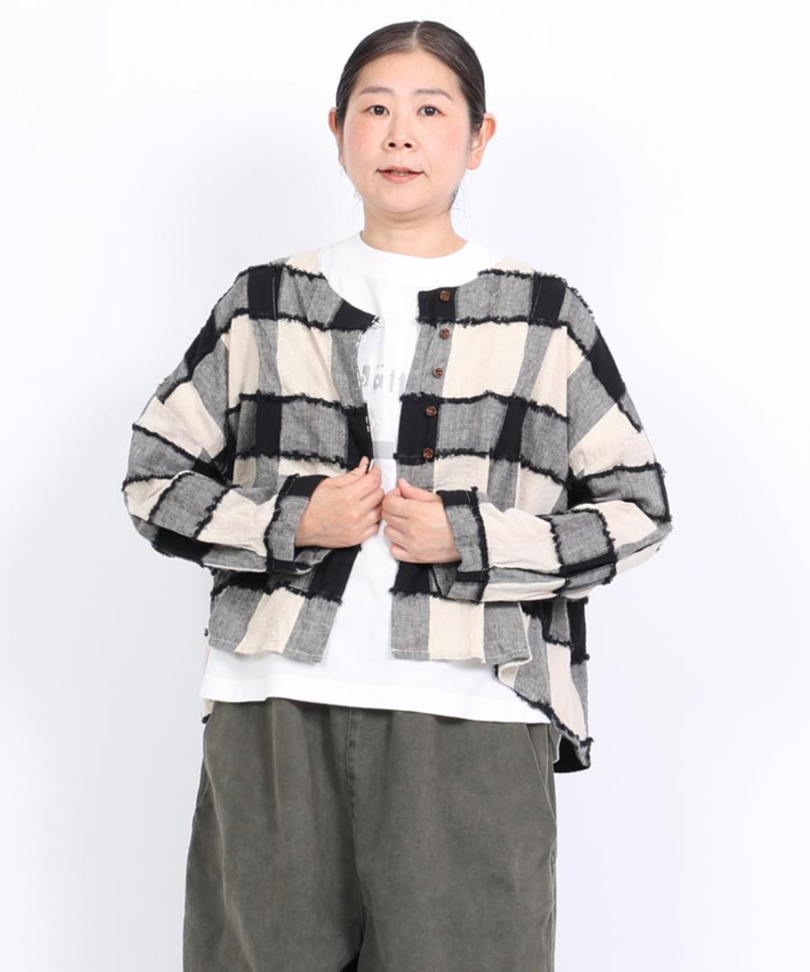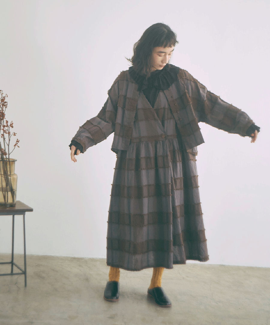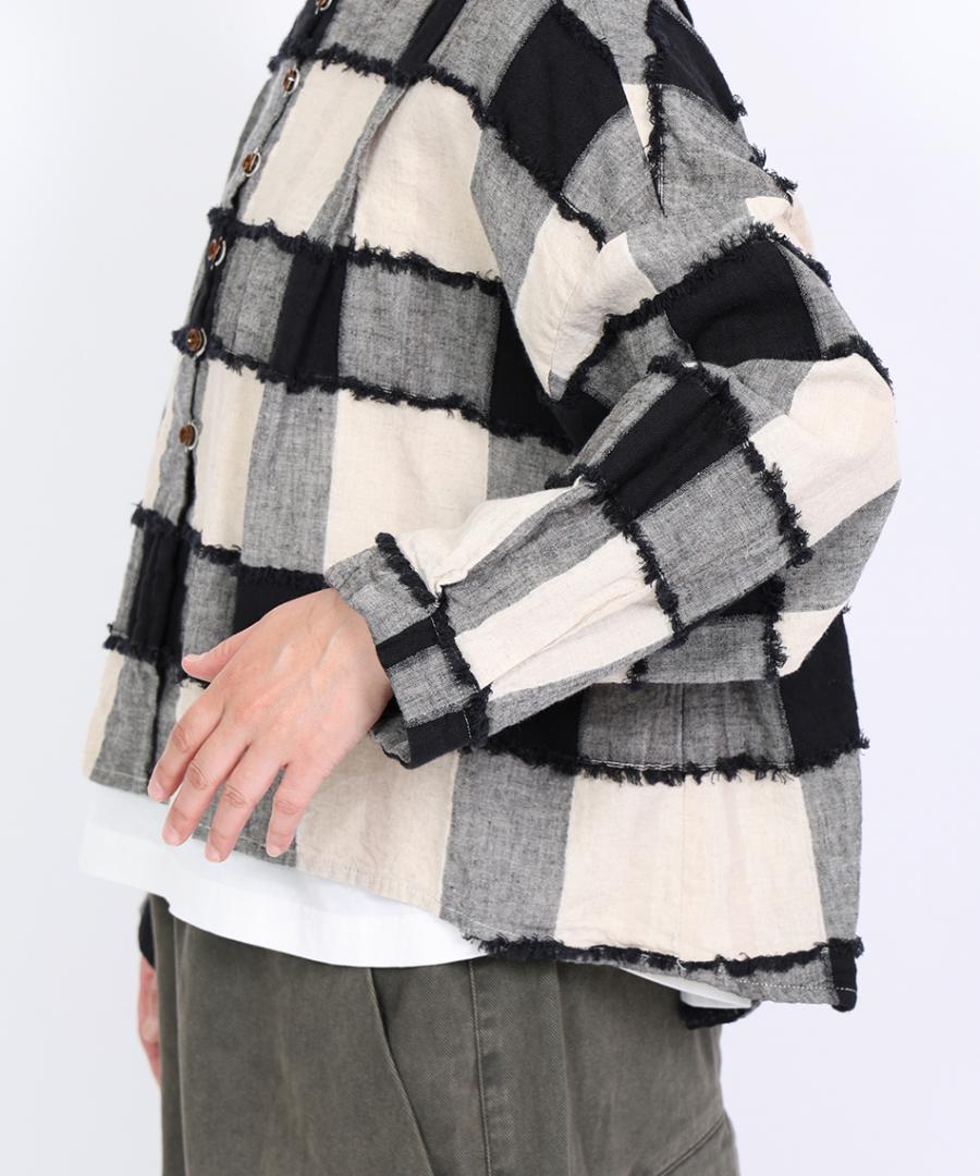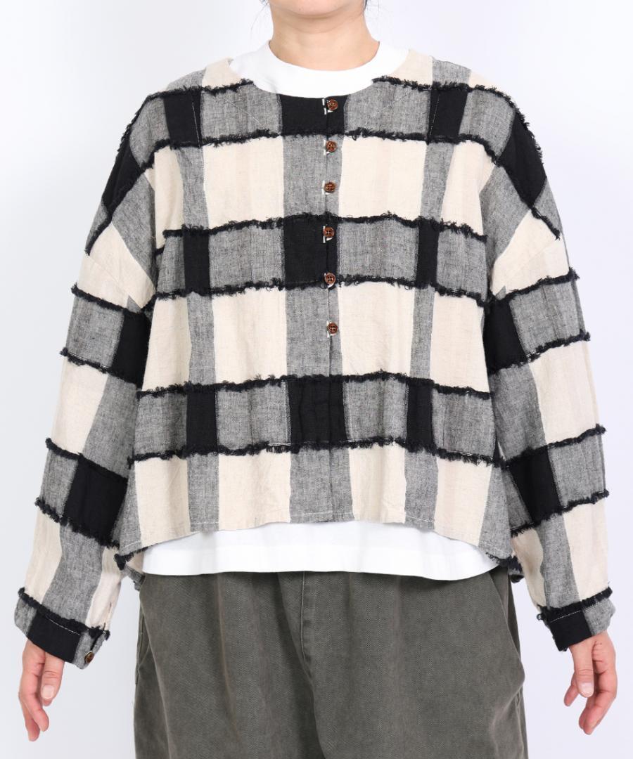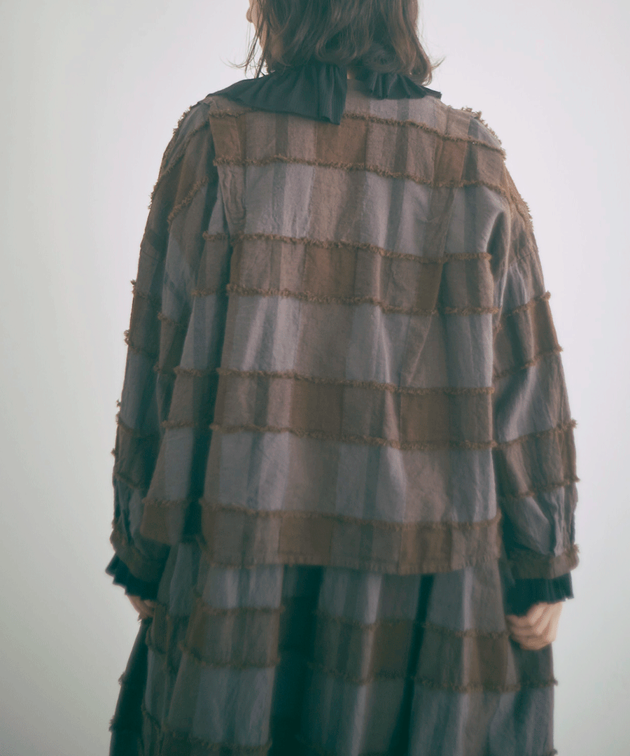 ブロックチェック柄カットジャガード生地で仕立てたボレロブラウス。