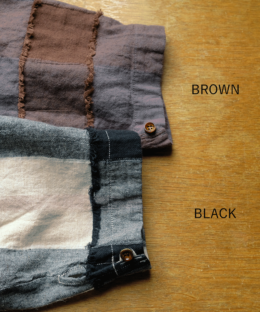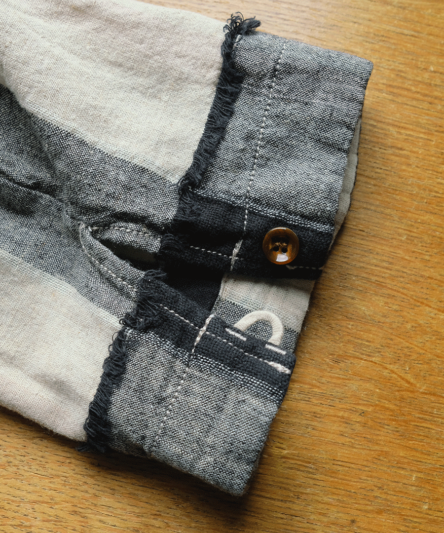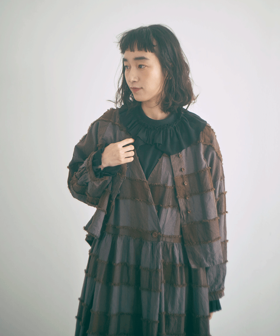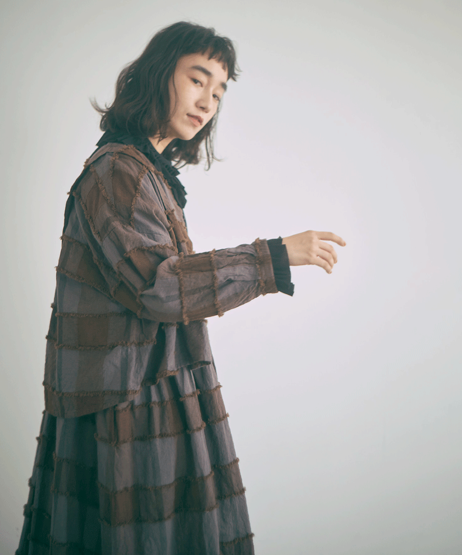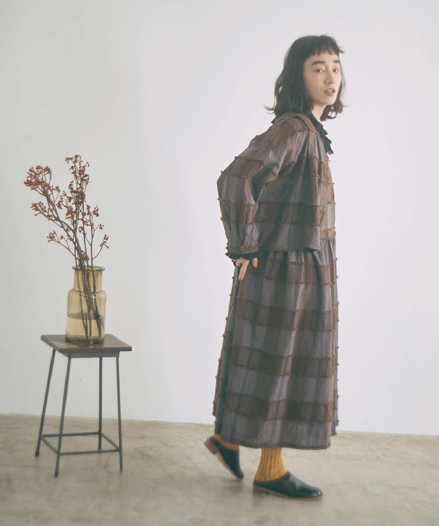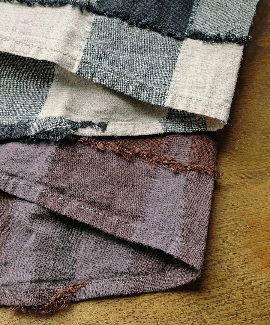 ブロックチェック柄をジャガード織りで表現し、表面に浮き出た糸をカットすることで、フリンジの様な毛羽立ちのある立体感が生まれています。