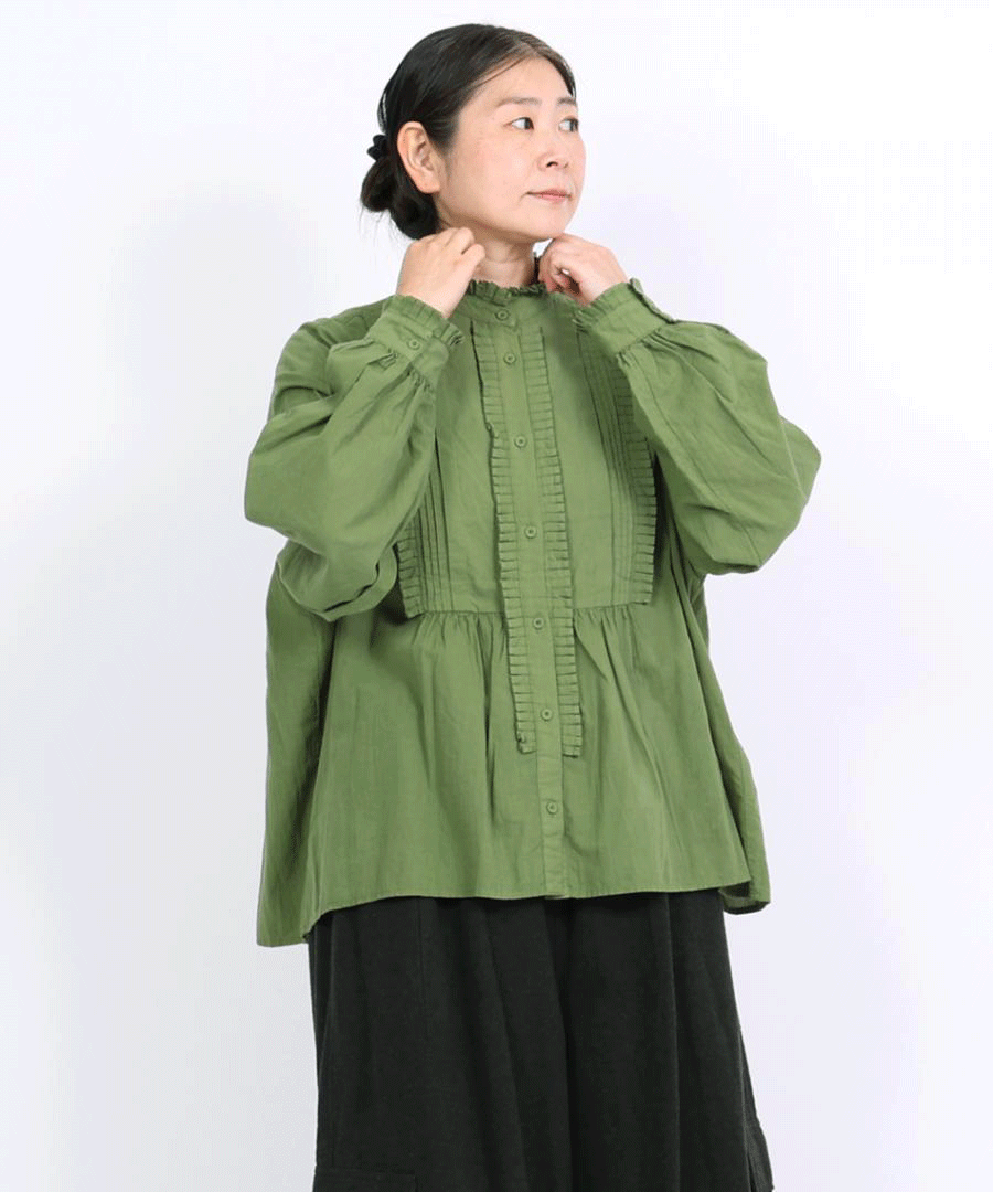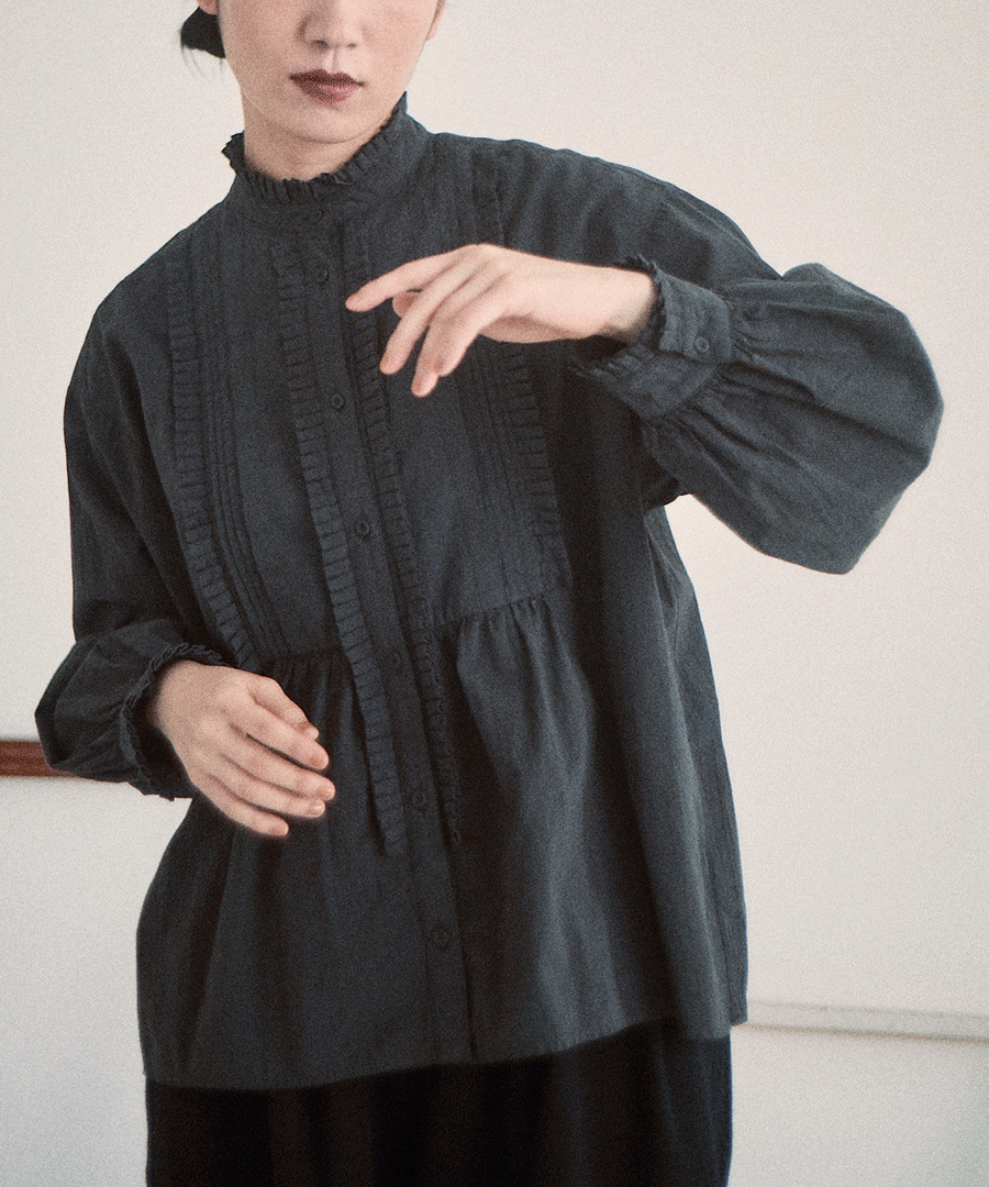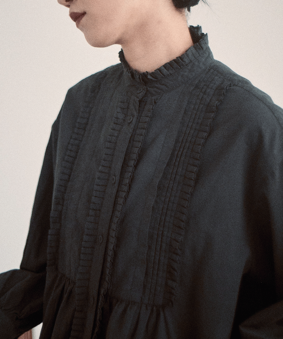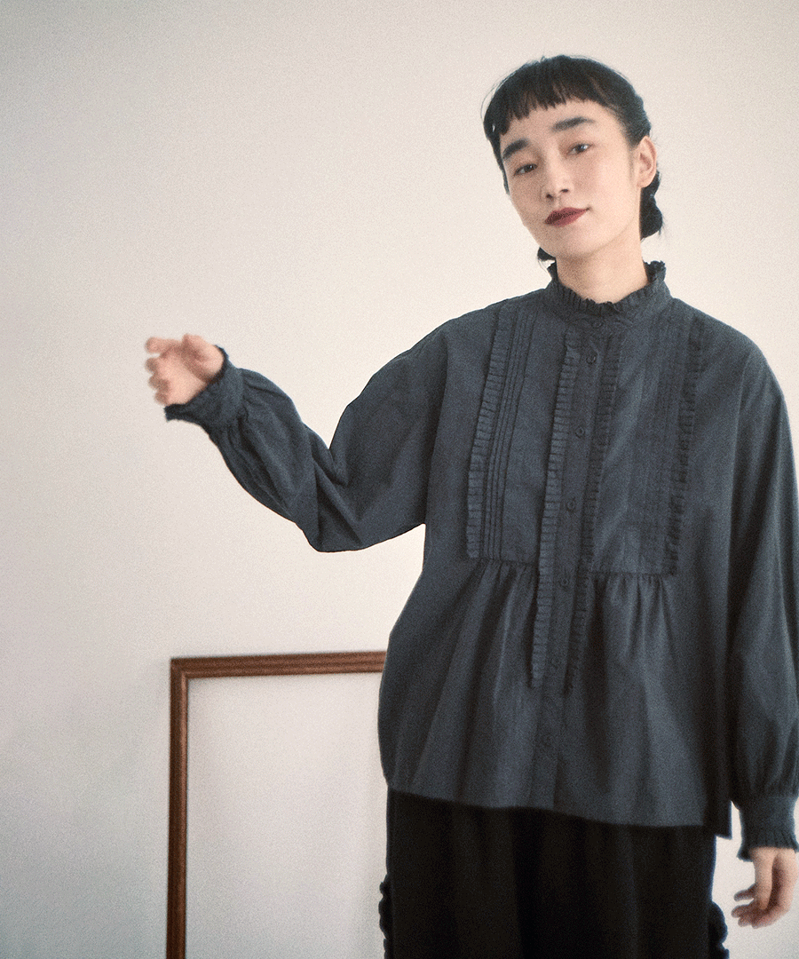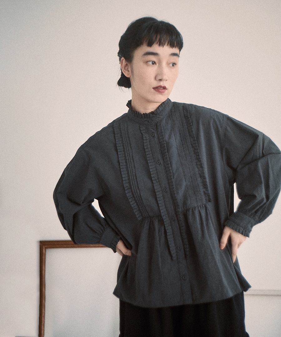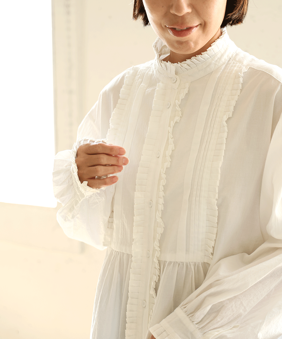 高めのスタンドカラーがきちんと感がありながらも、フロントに施された細かいタックとフリルで華やかに。