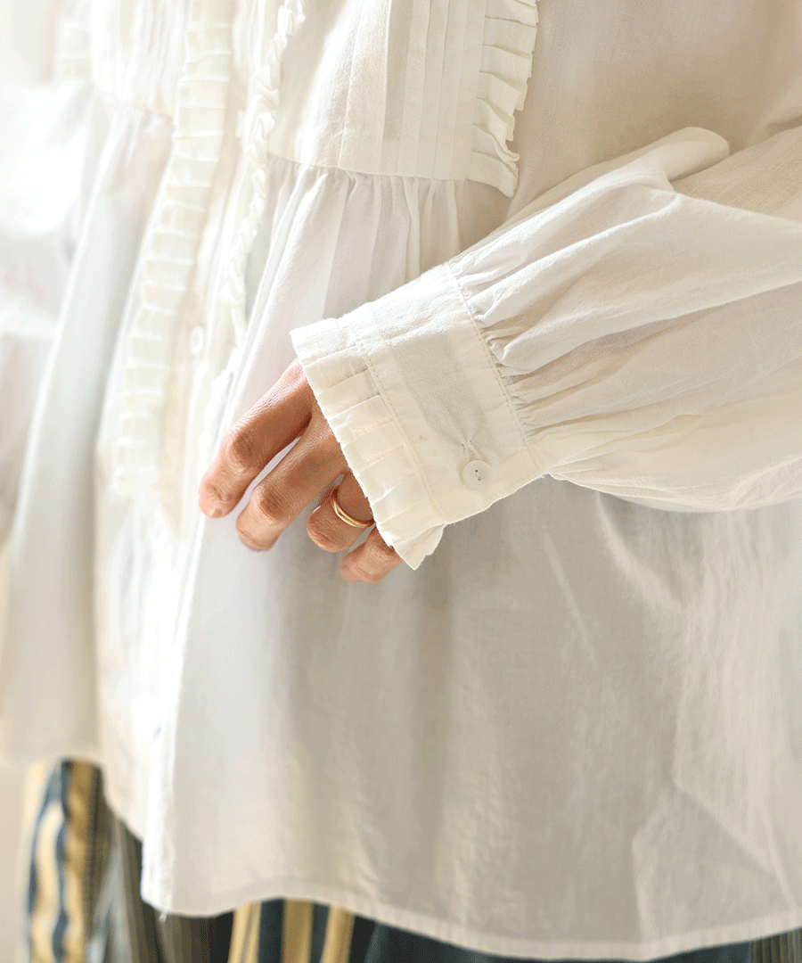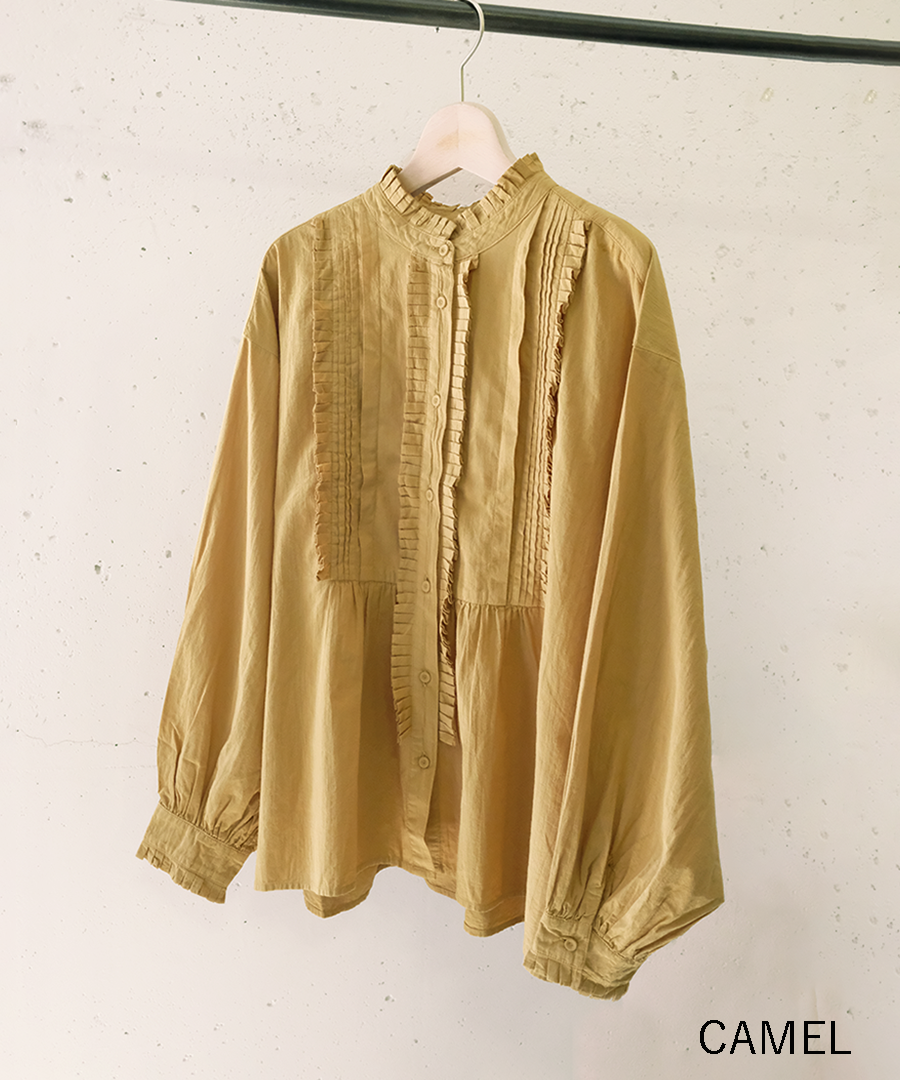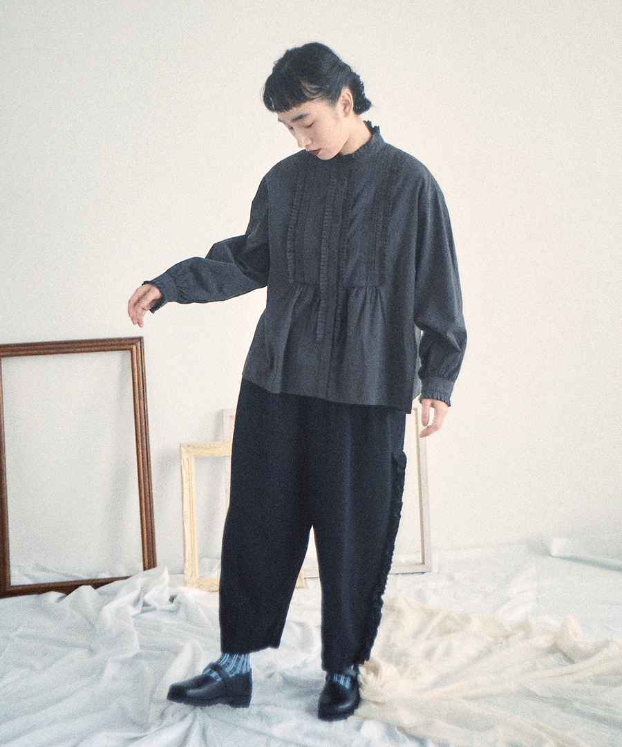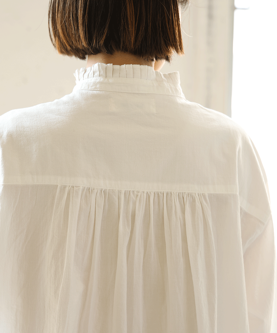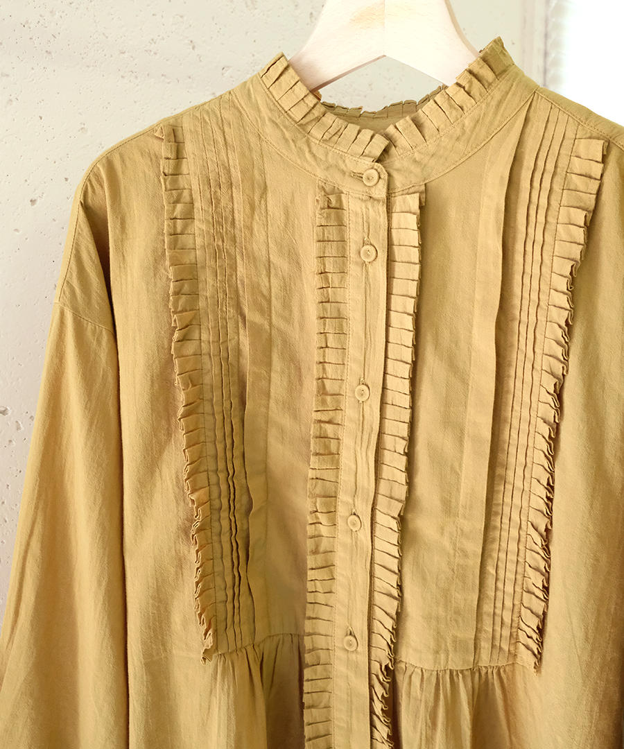 高めのスタンドカラーがきちんと感がありながらも、フロントに施された細かいタックとフリルで華やかに。