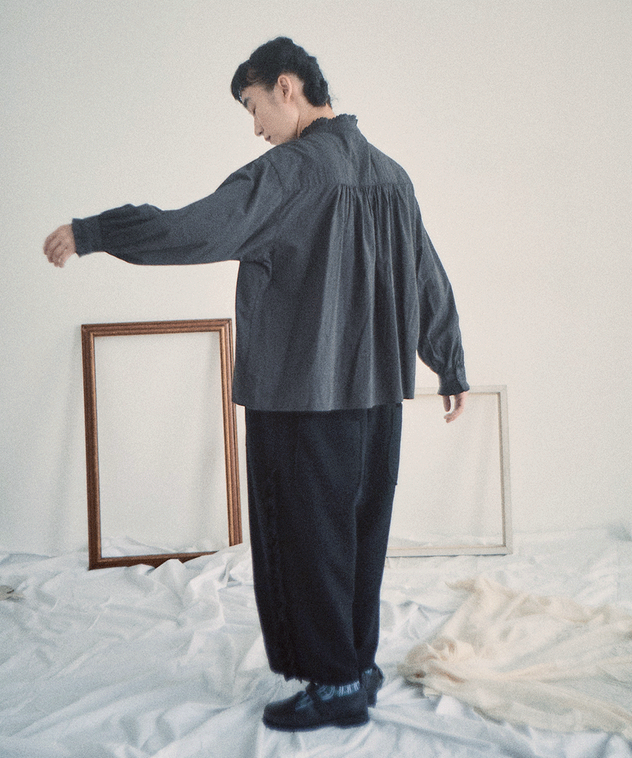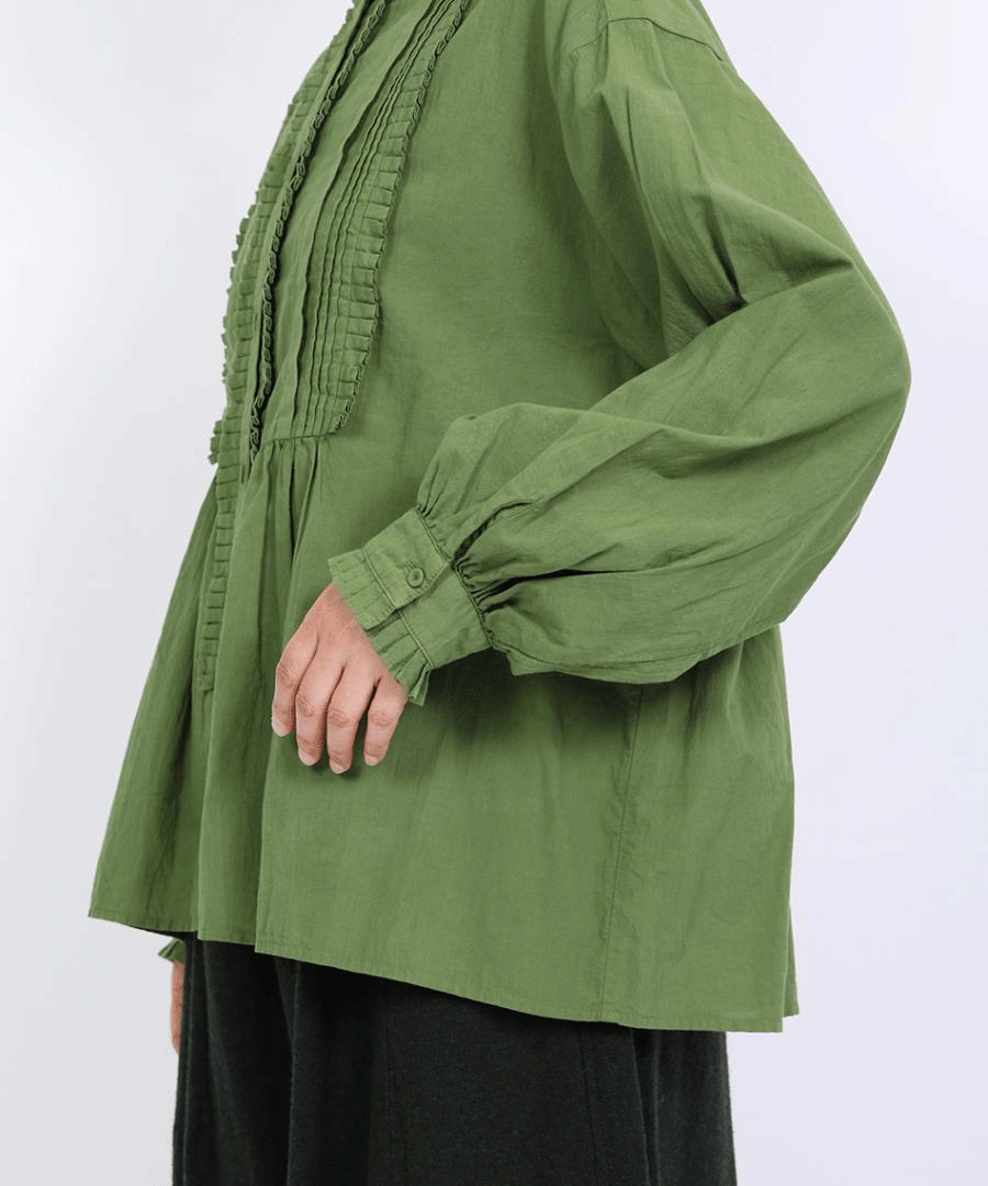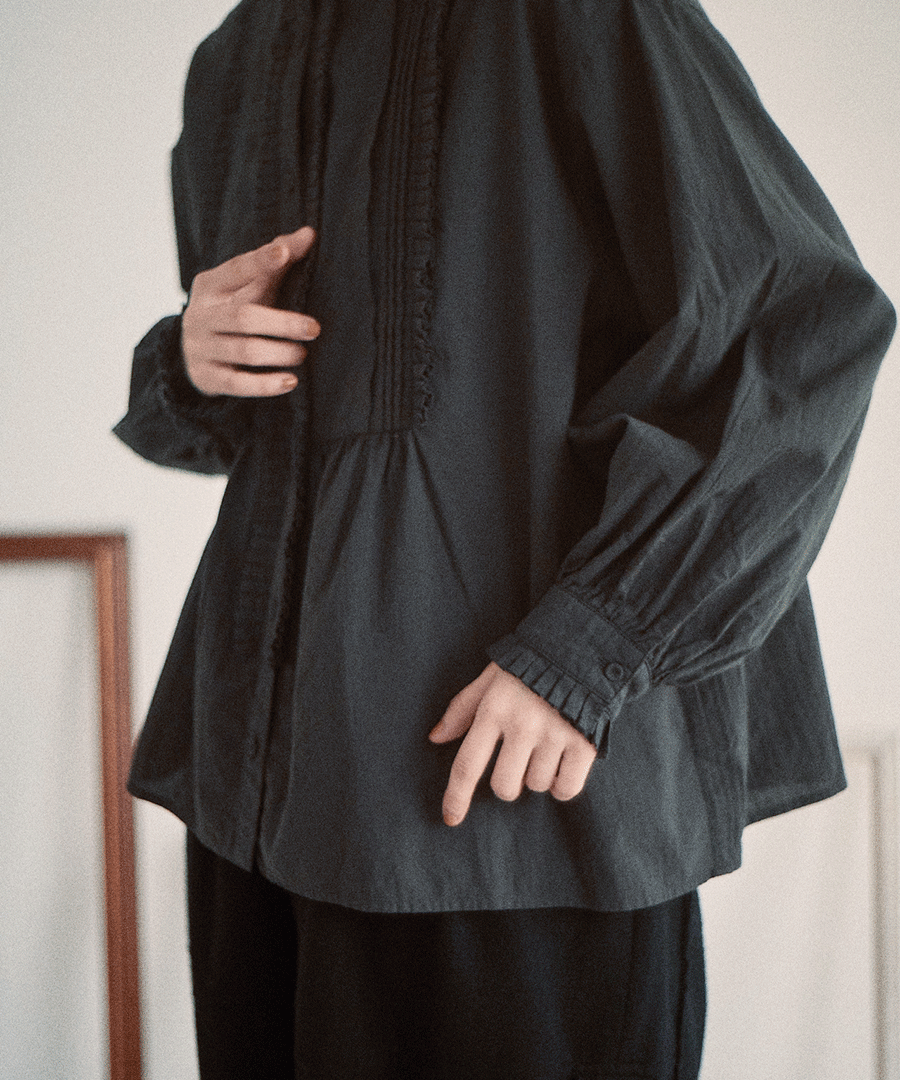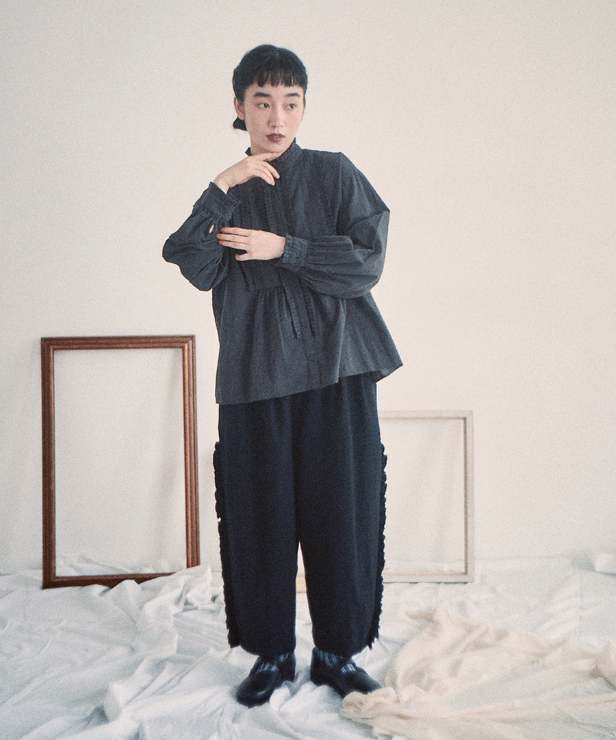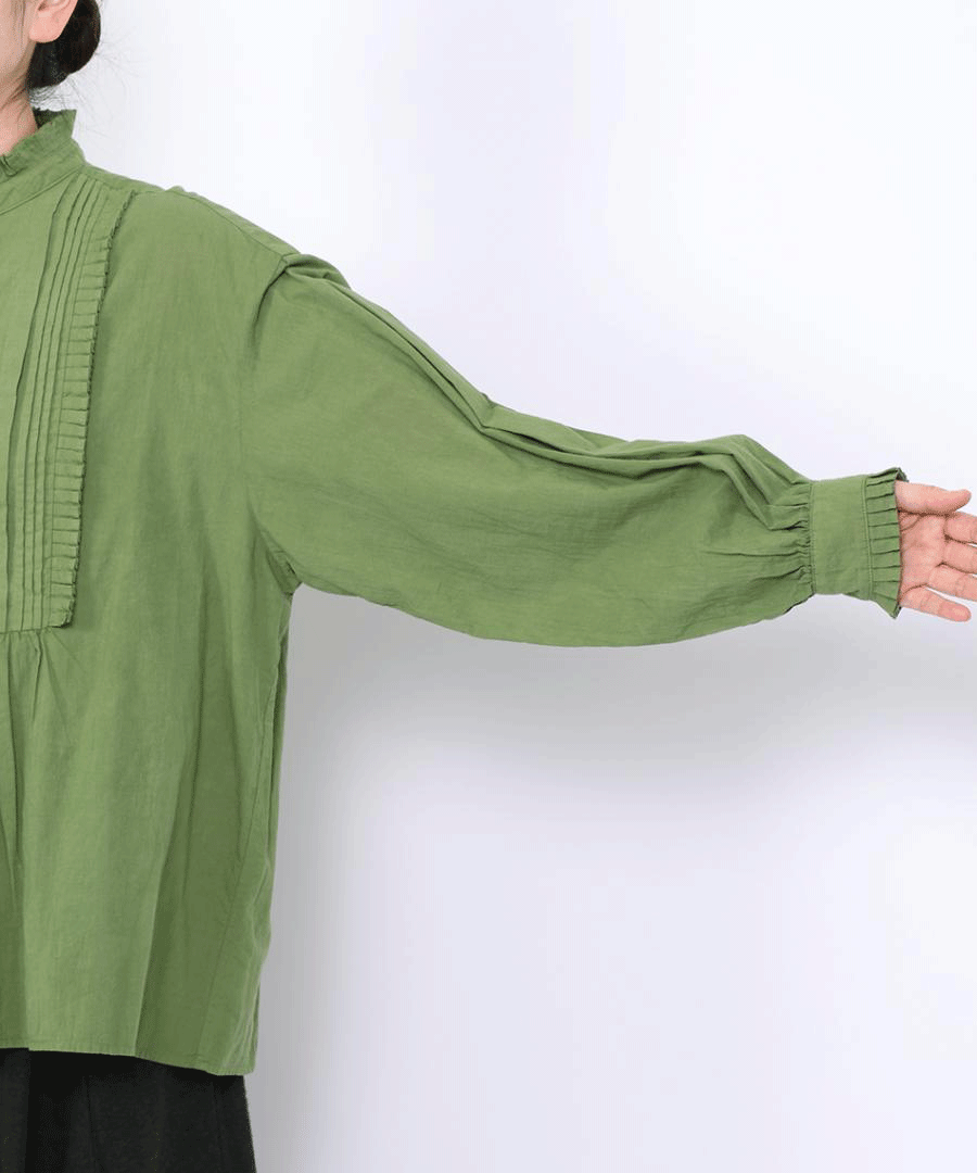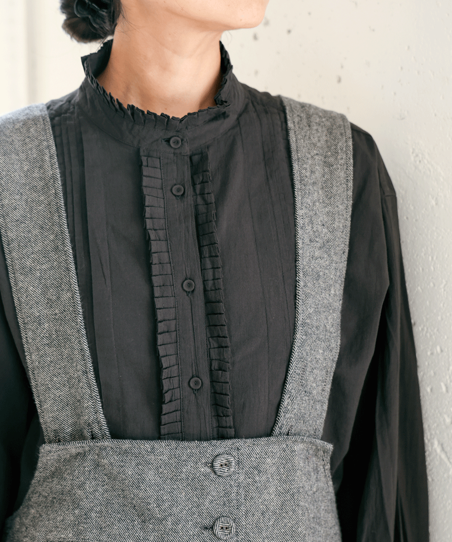 高めのスタンドカラーがきちんと感がありながらも、フロントに施された細かいタックとフリルで華やかに。