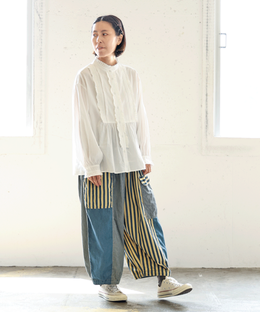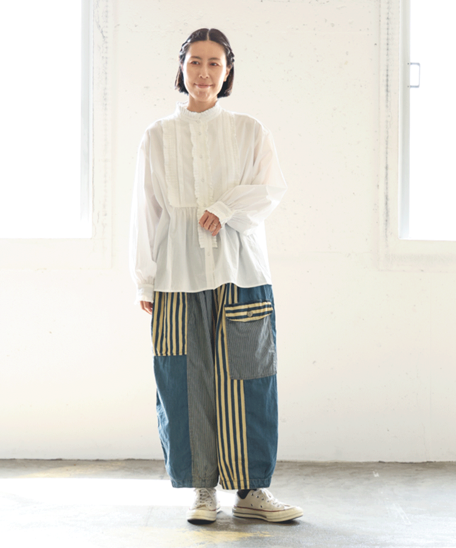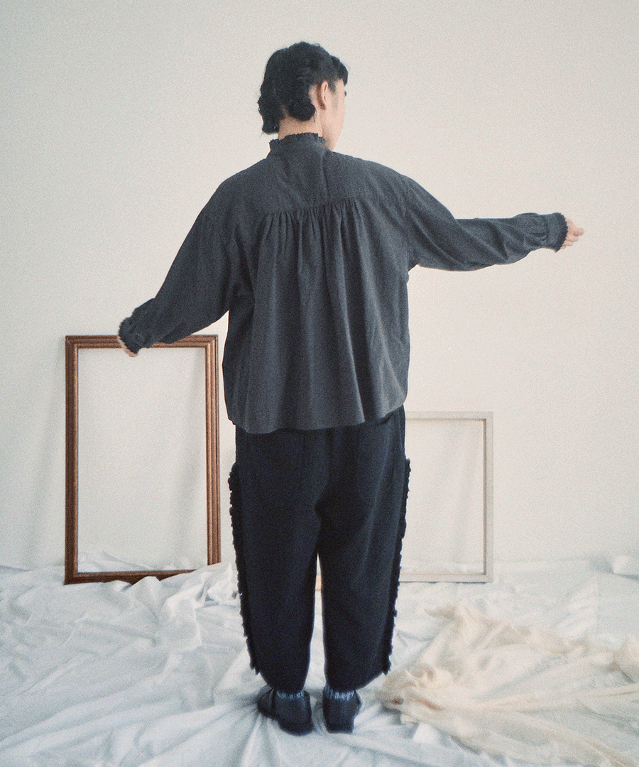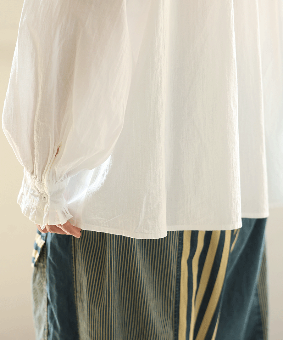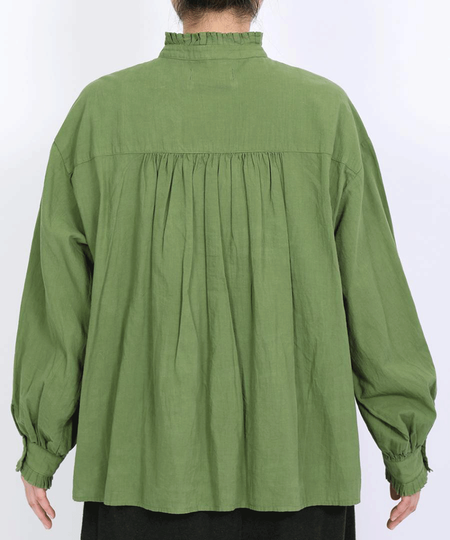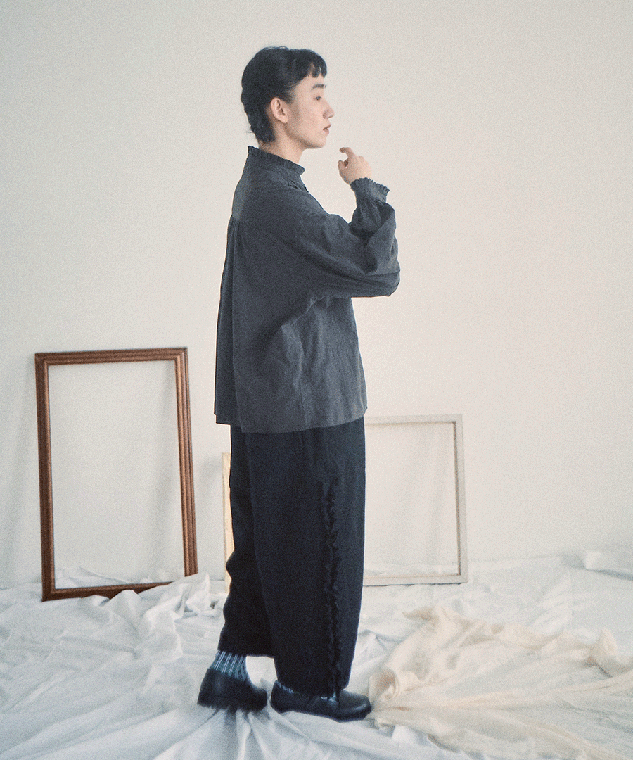 高めのスタンドカラーがきちんと感がありながらも、フロントに施された細かいタックとフリルで華やかに。