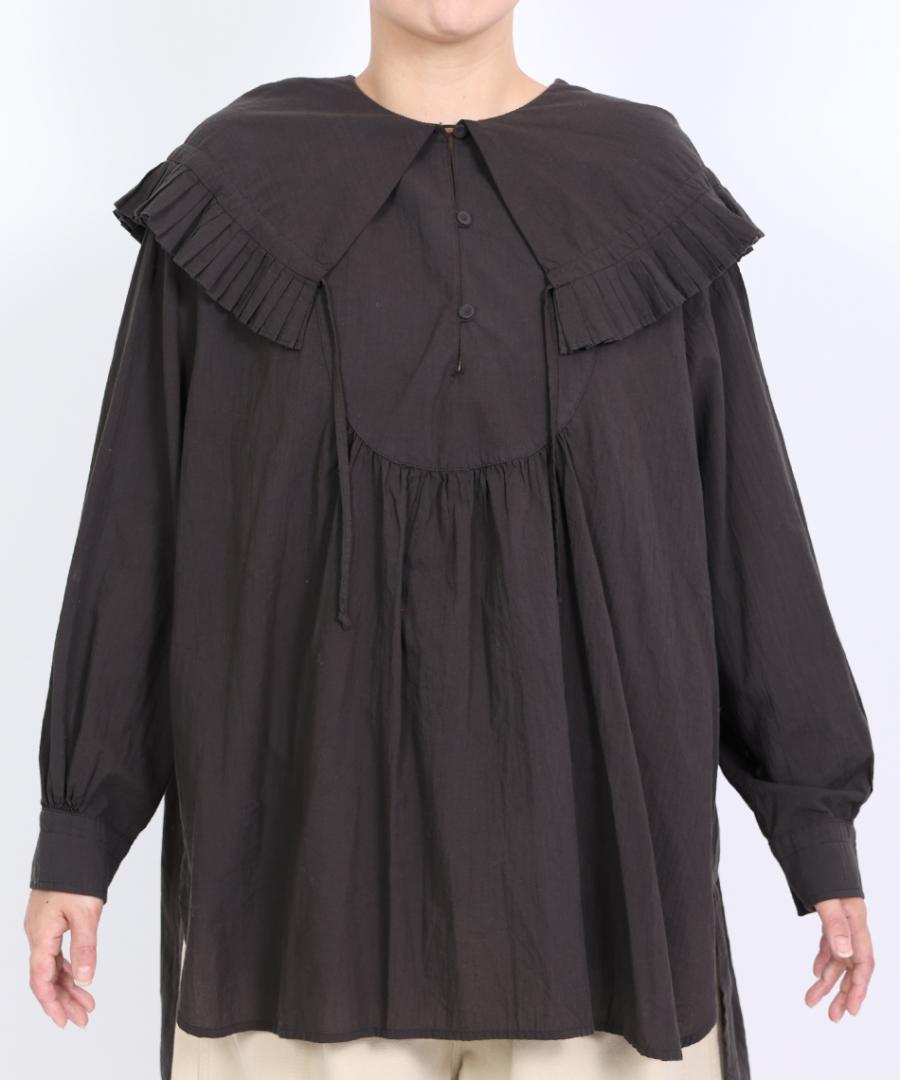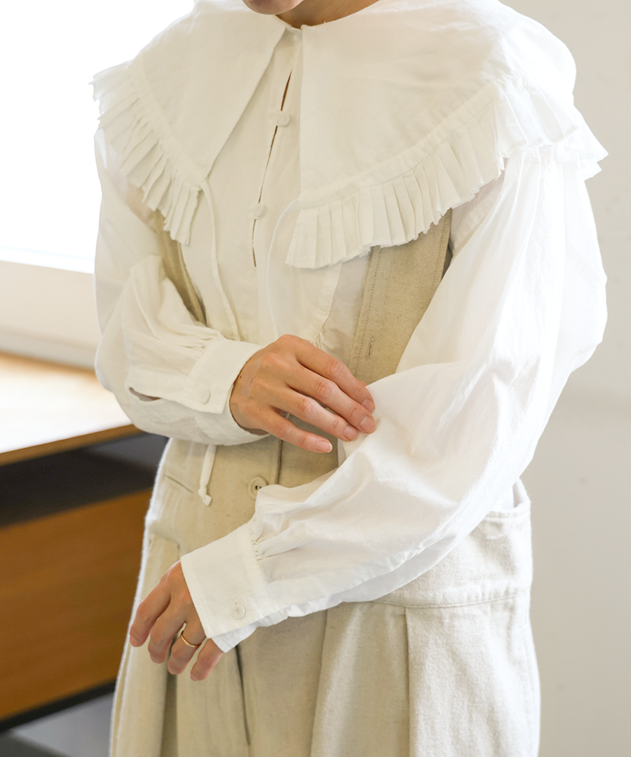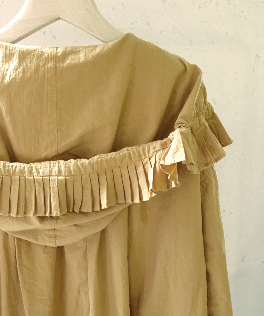 ビッグカラーの縁には細かなプリーツフリルを施し、バックスタイルはフードになっていて華やかに。