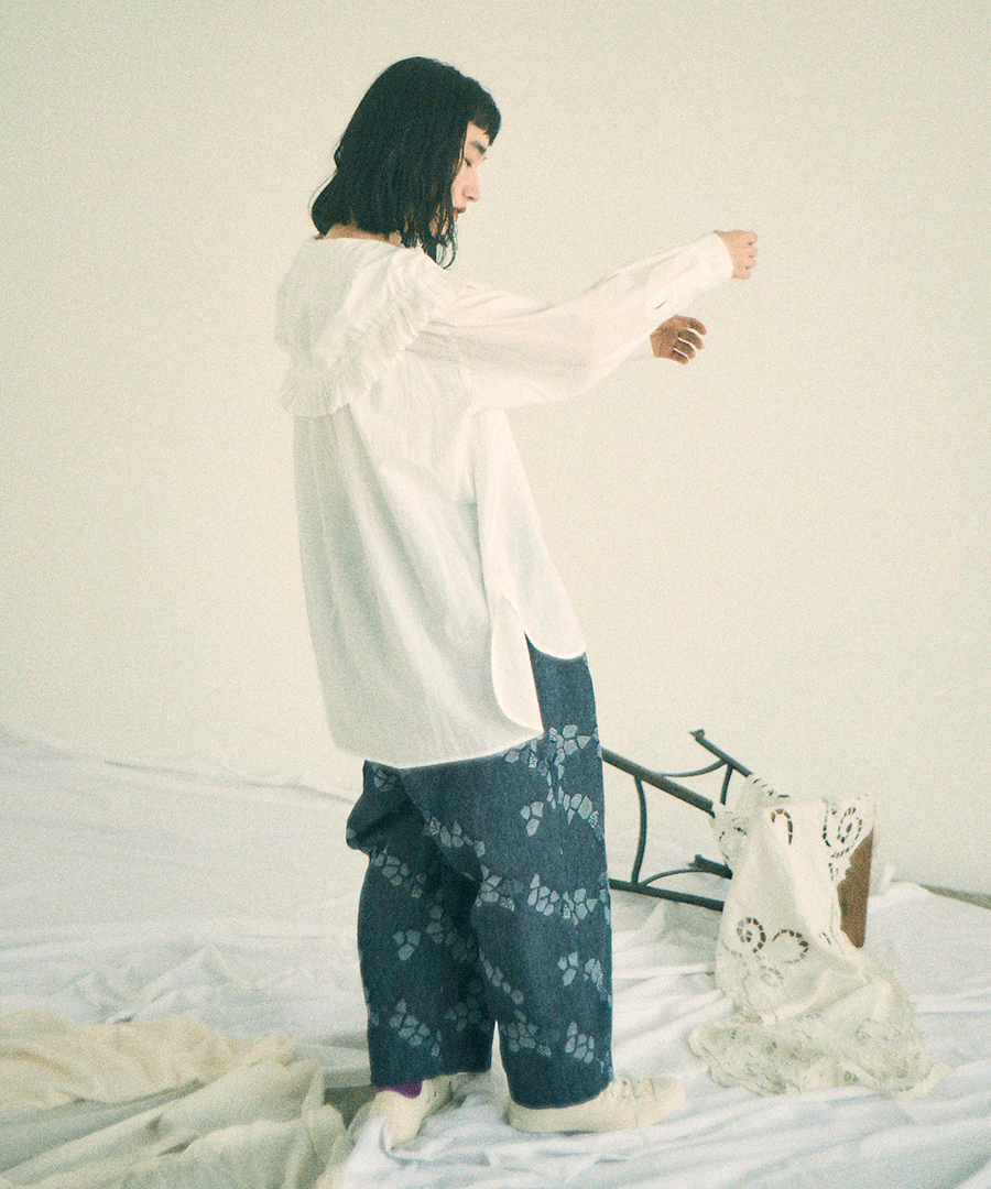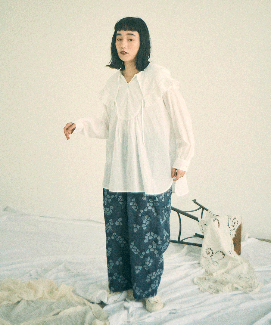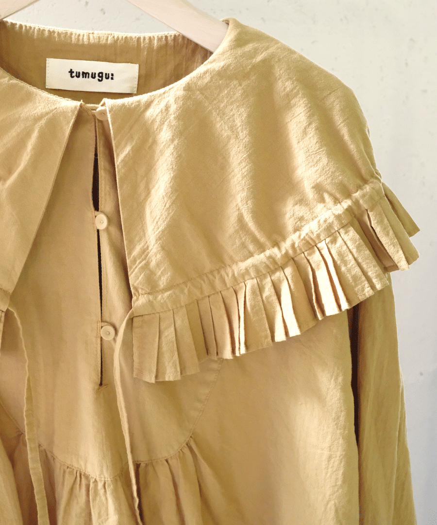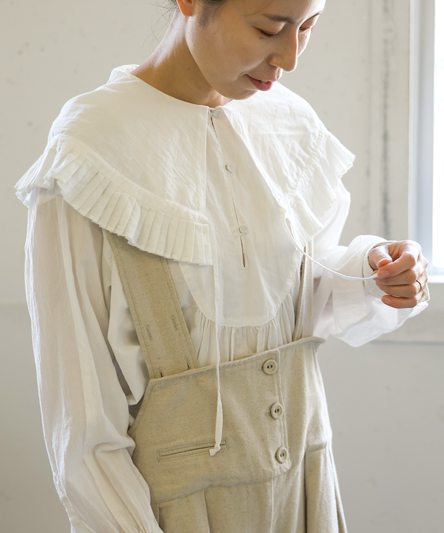 襟先の紐を絞ることで、フリルをブラウジングすることができます。