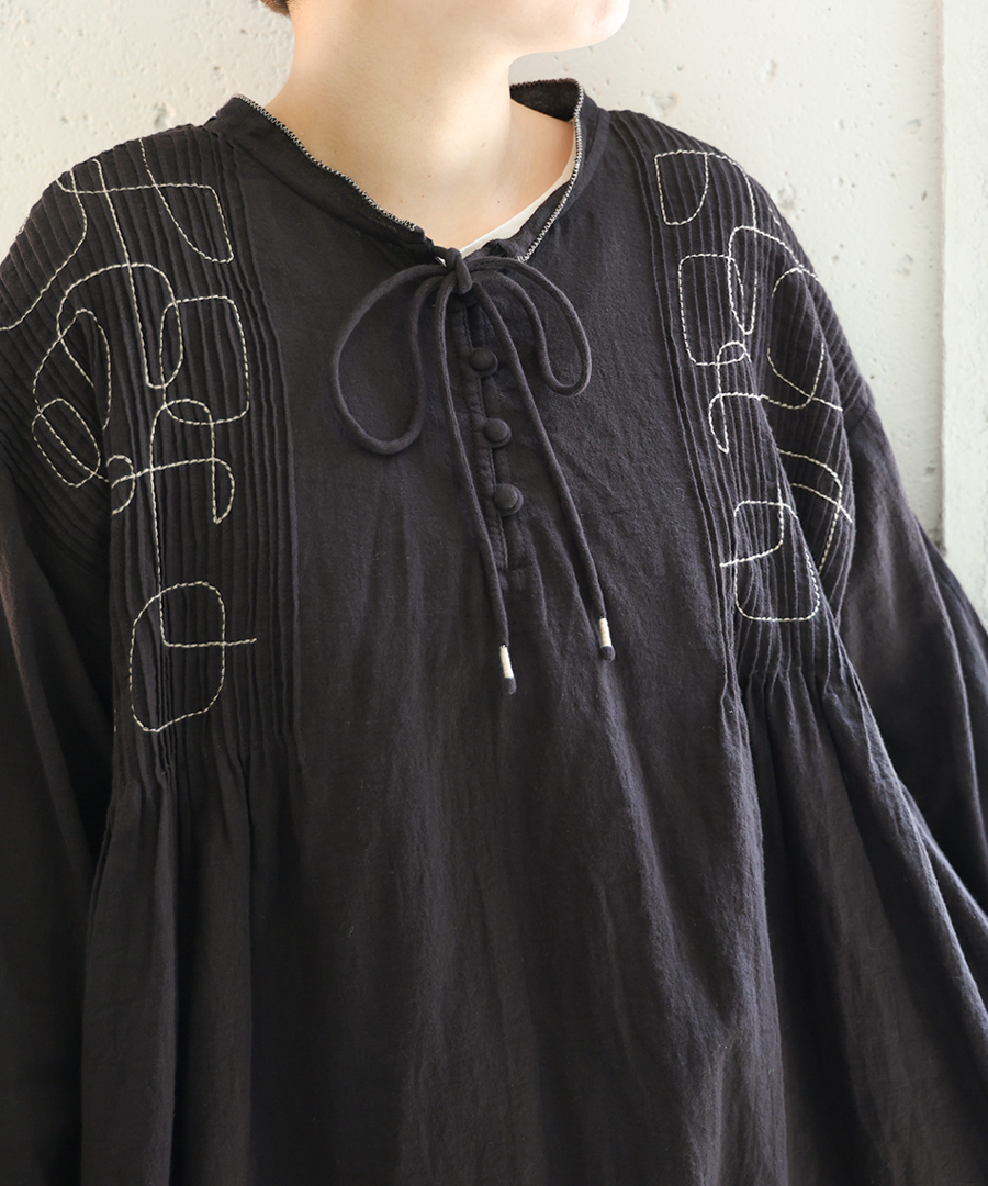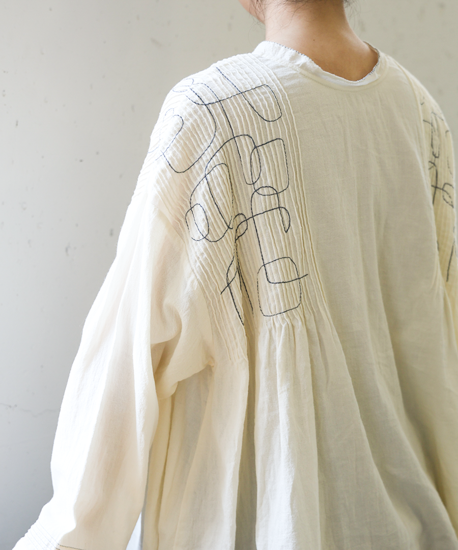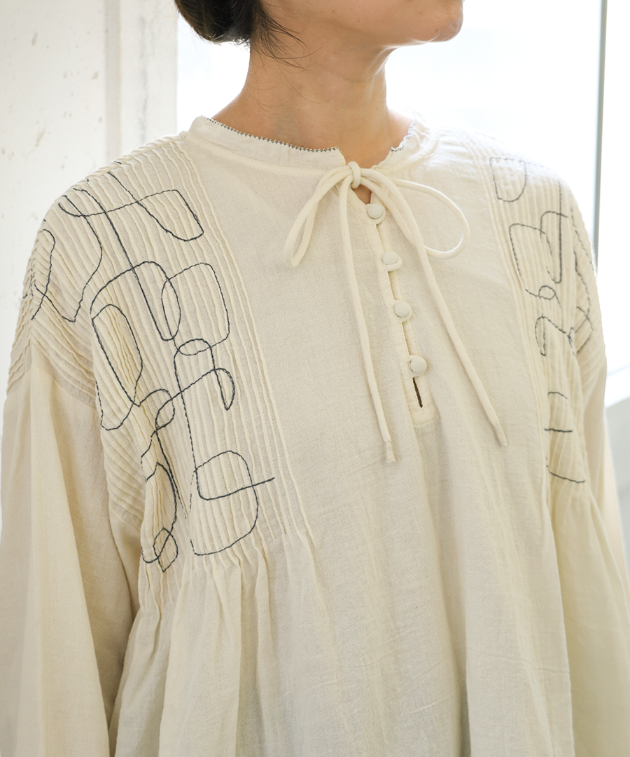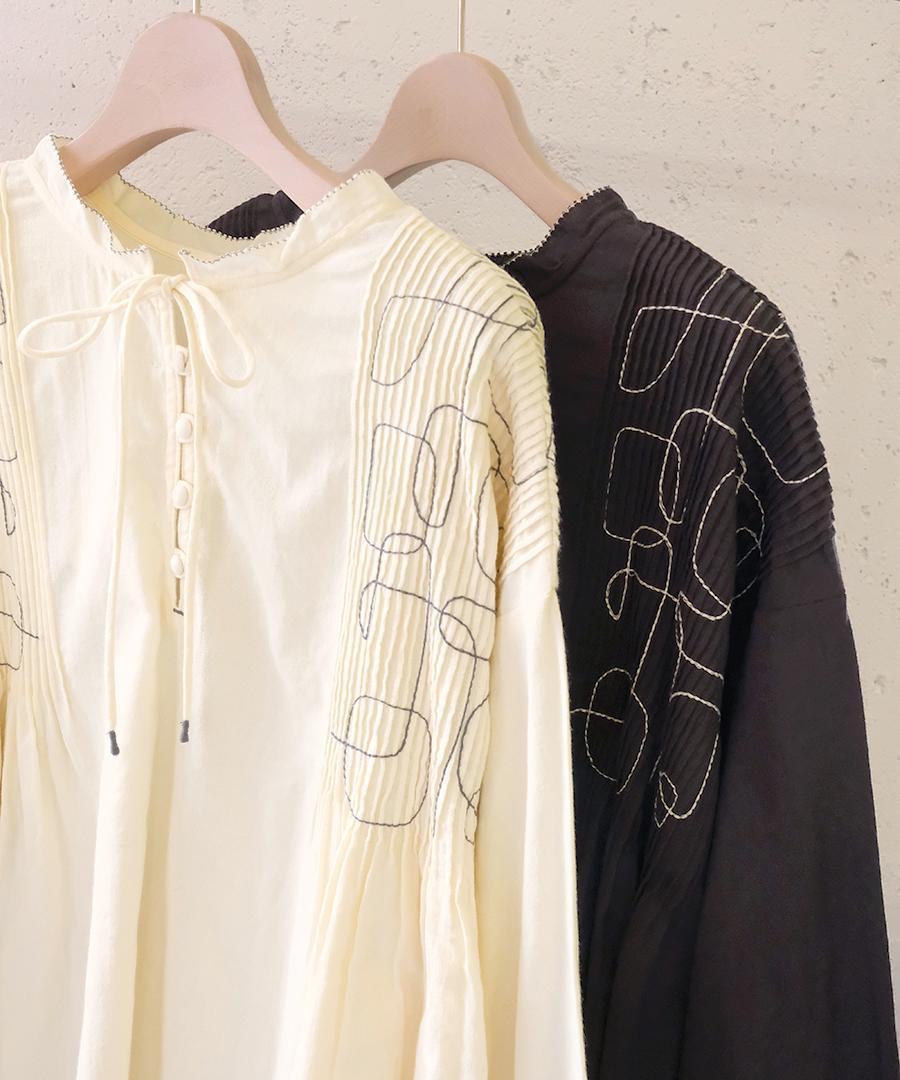 幾何学模様の刺繍とタックが、シンプルながらも存在感を放ちます。