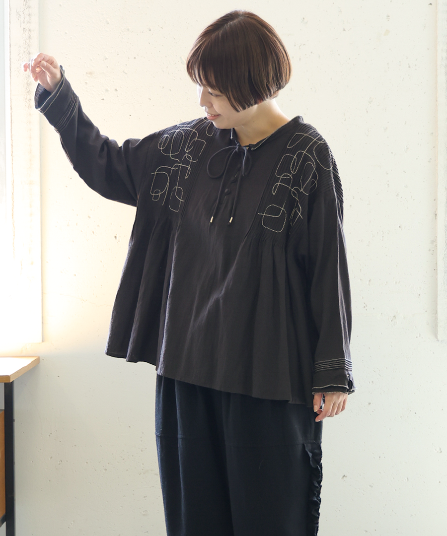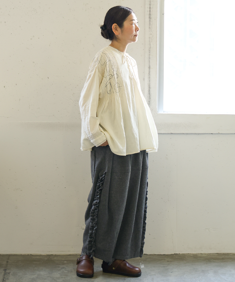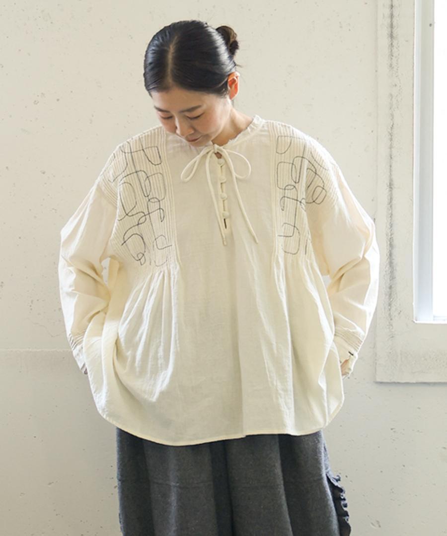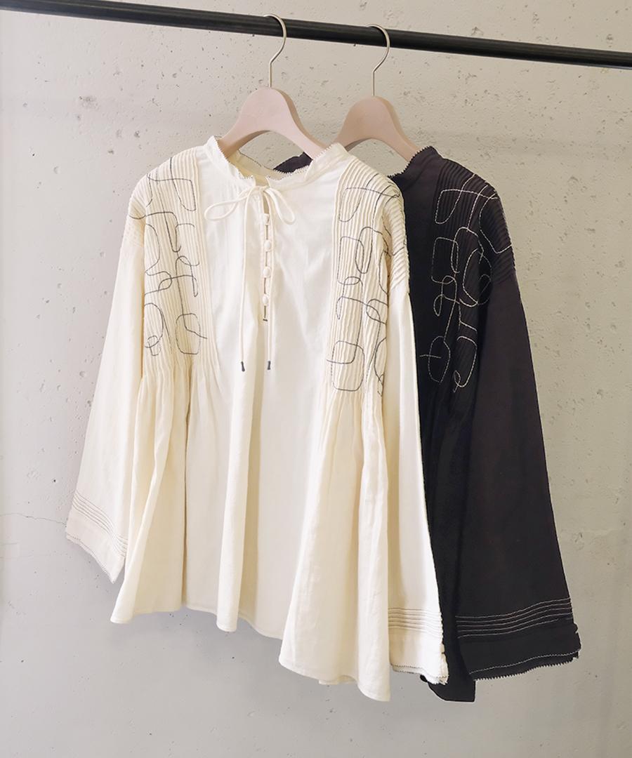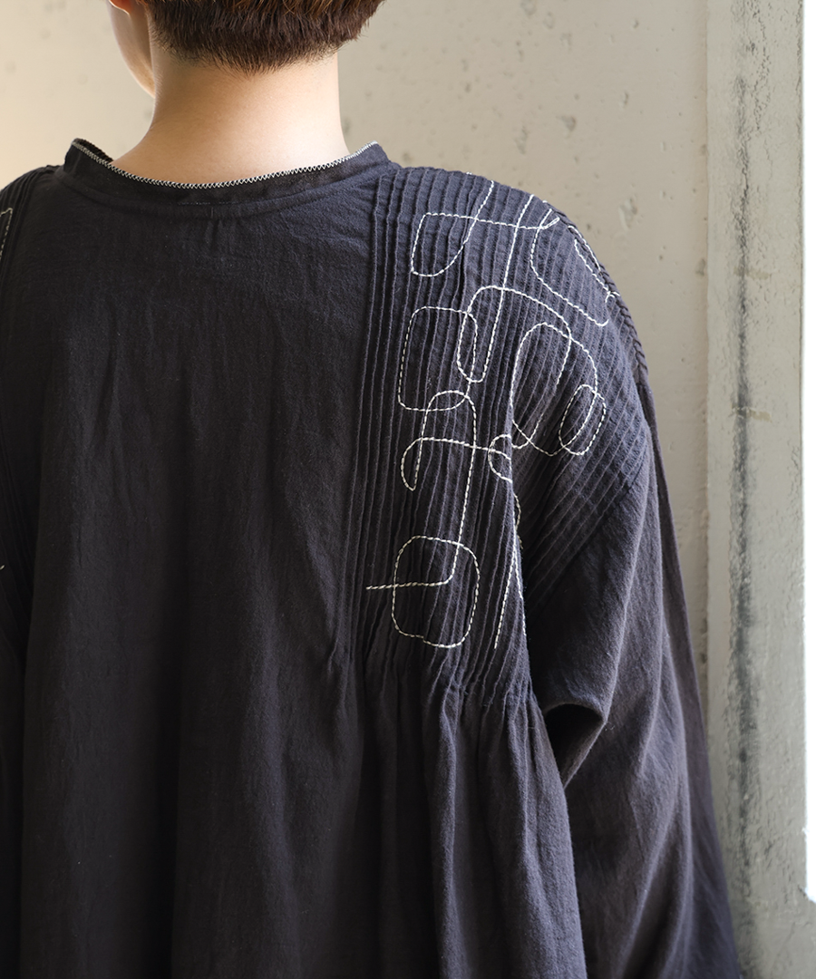 幾何学模様の刺繍とタックが、シンプルながらも存在感を放ちます。