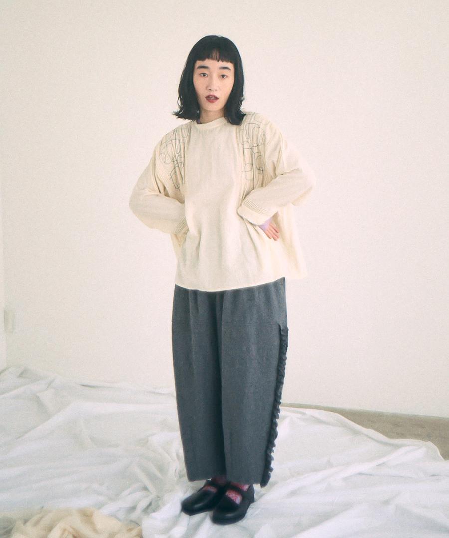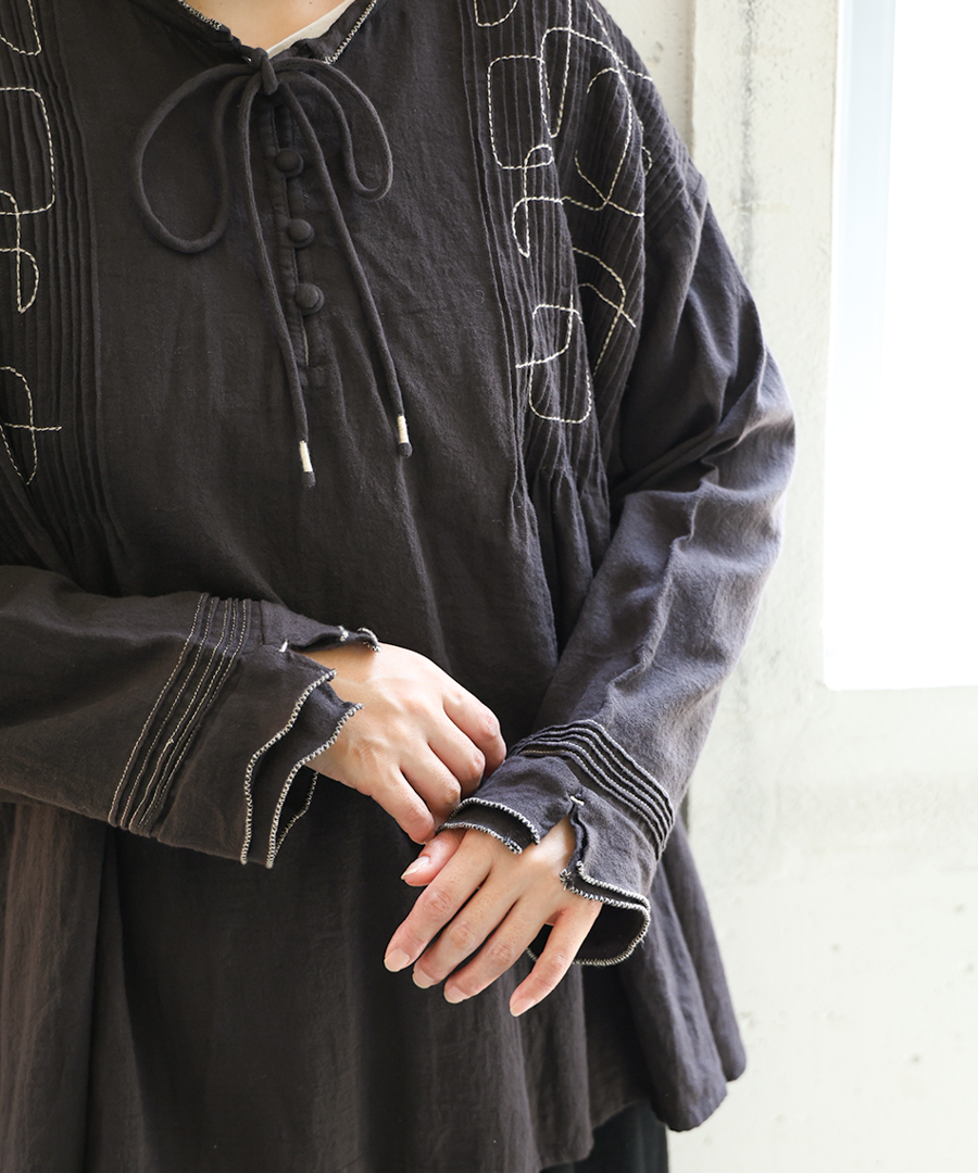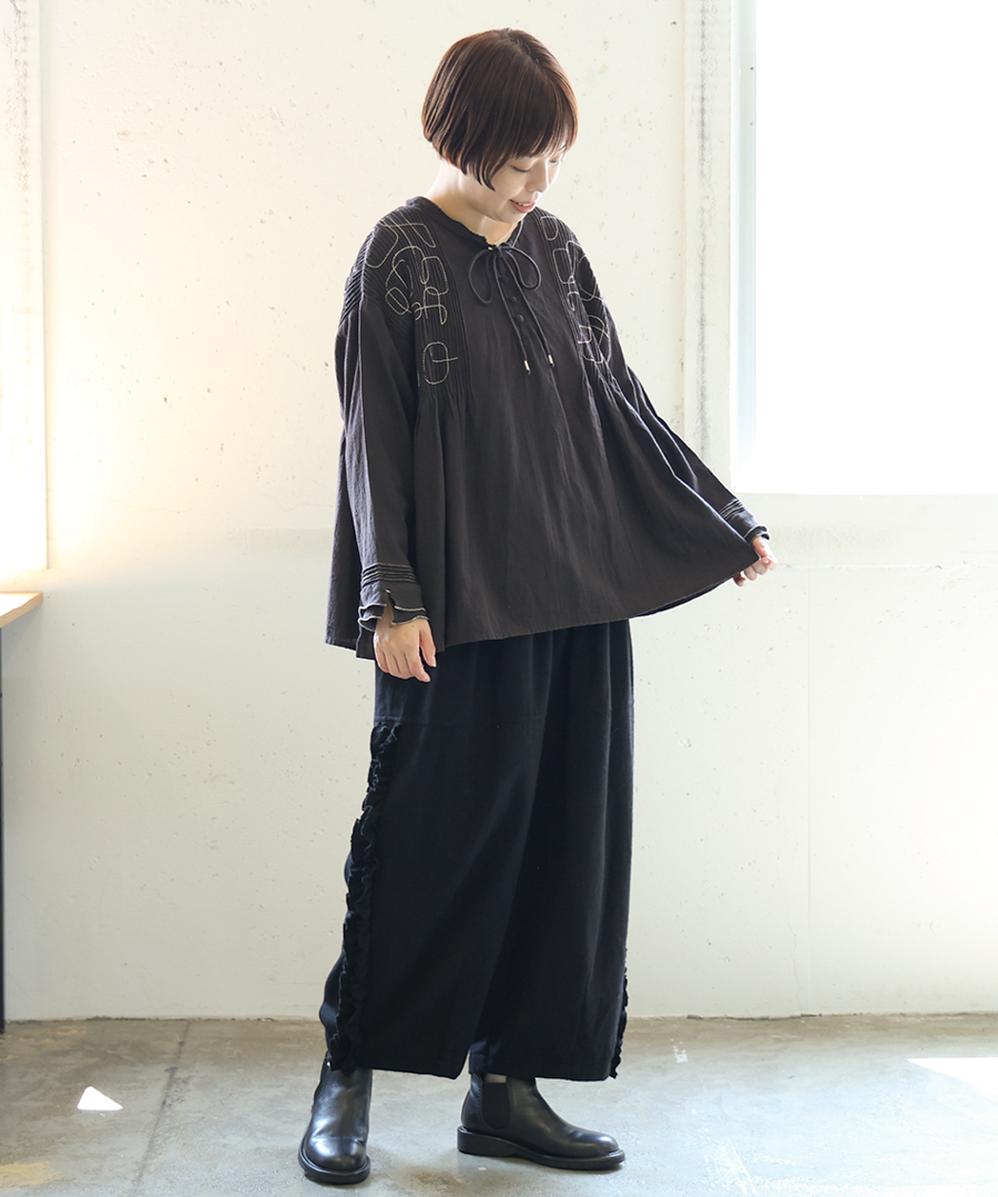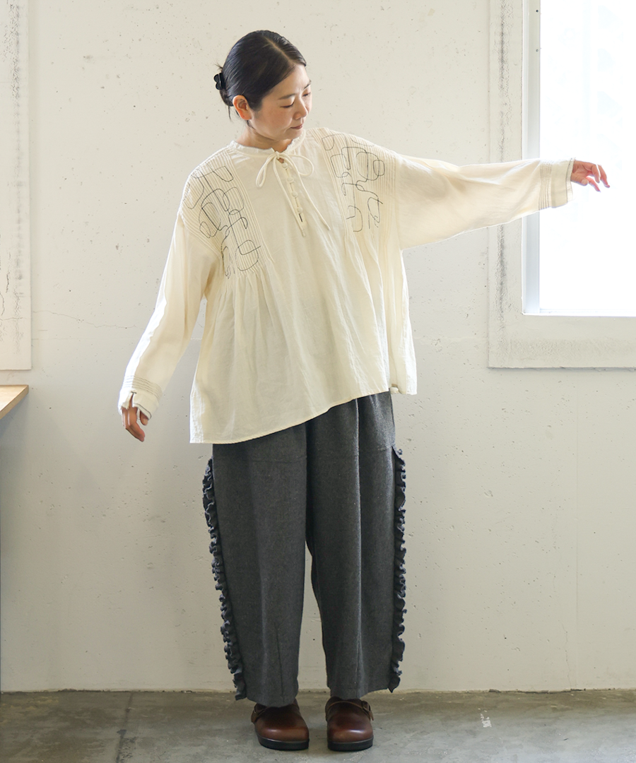 幾何学模様の刺繍とタックが、シンプルながらも存在感を放ちます。
