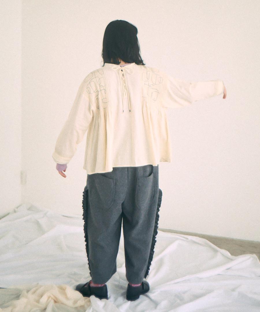細やかに入れたピンタックやピコ刺繍とステッチ、ボタンにはくるみ釦を施し、細部までこだわりを感じられるデザインが特徴です。