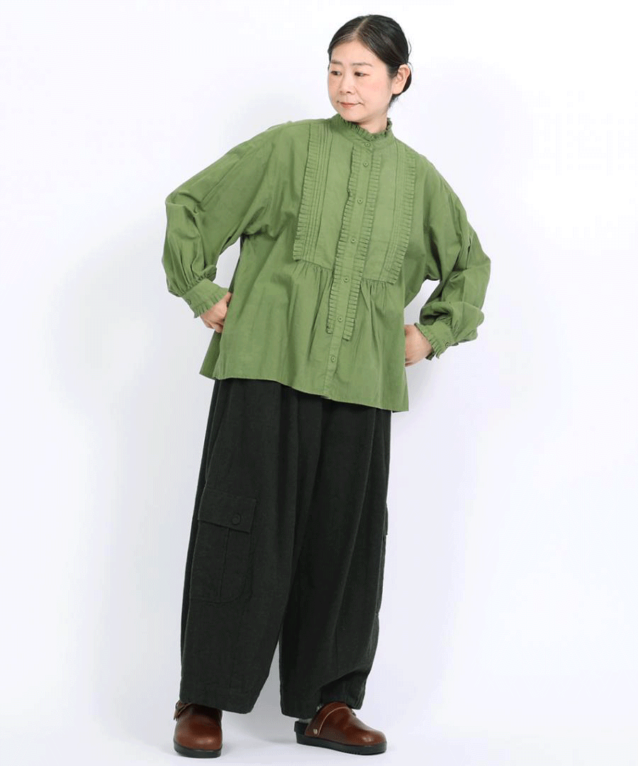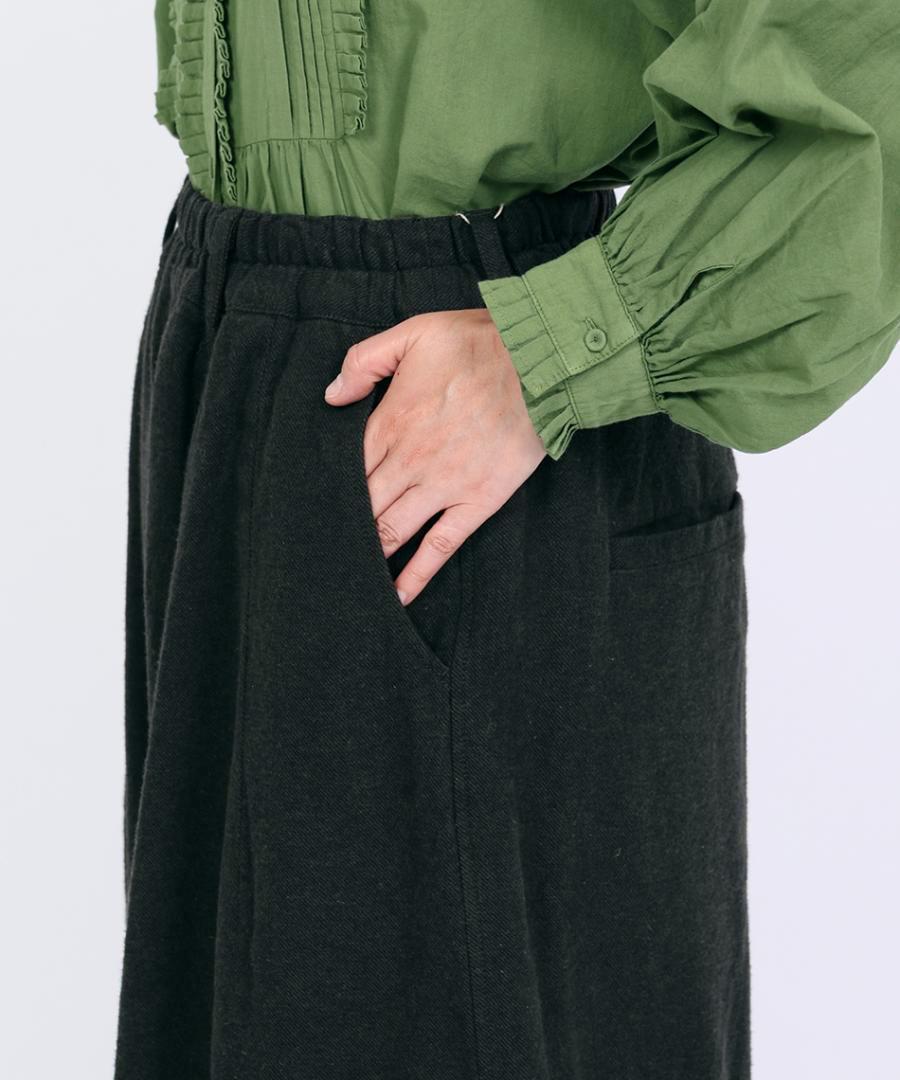 ウエスト周りに入ったタックが、腰回りにゆとりを持たせ、立体的なシルエットを作っています。