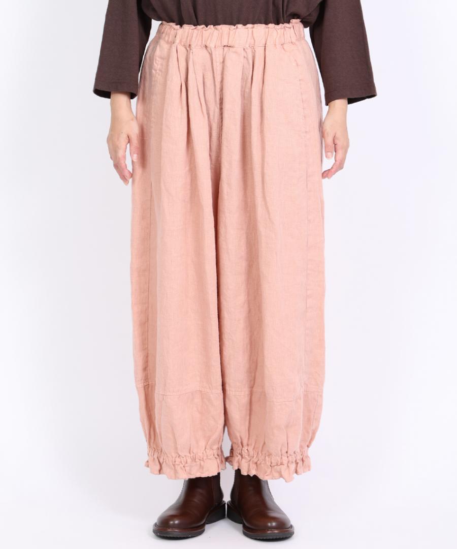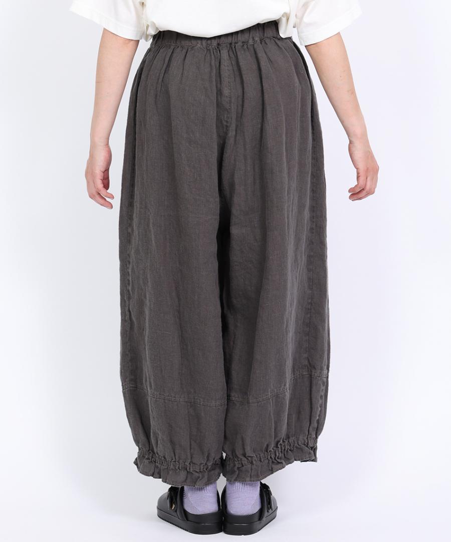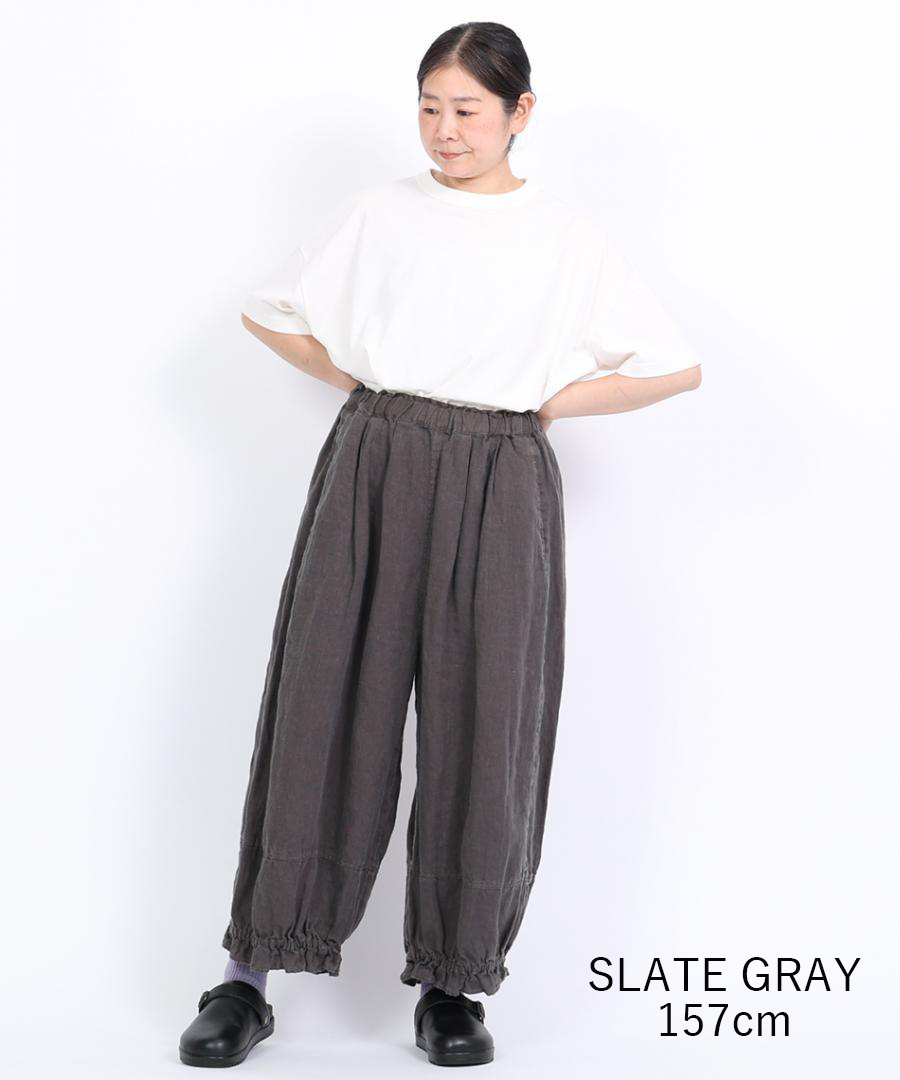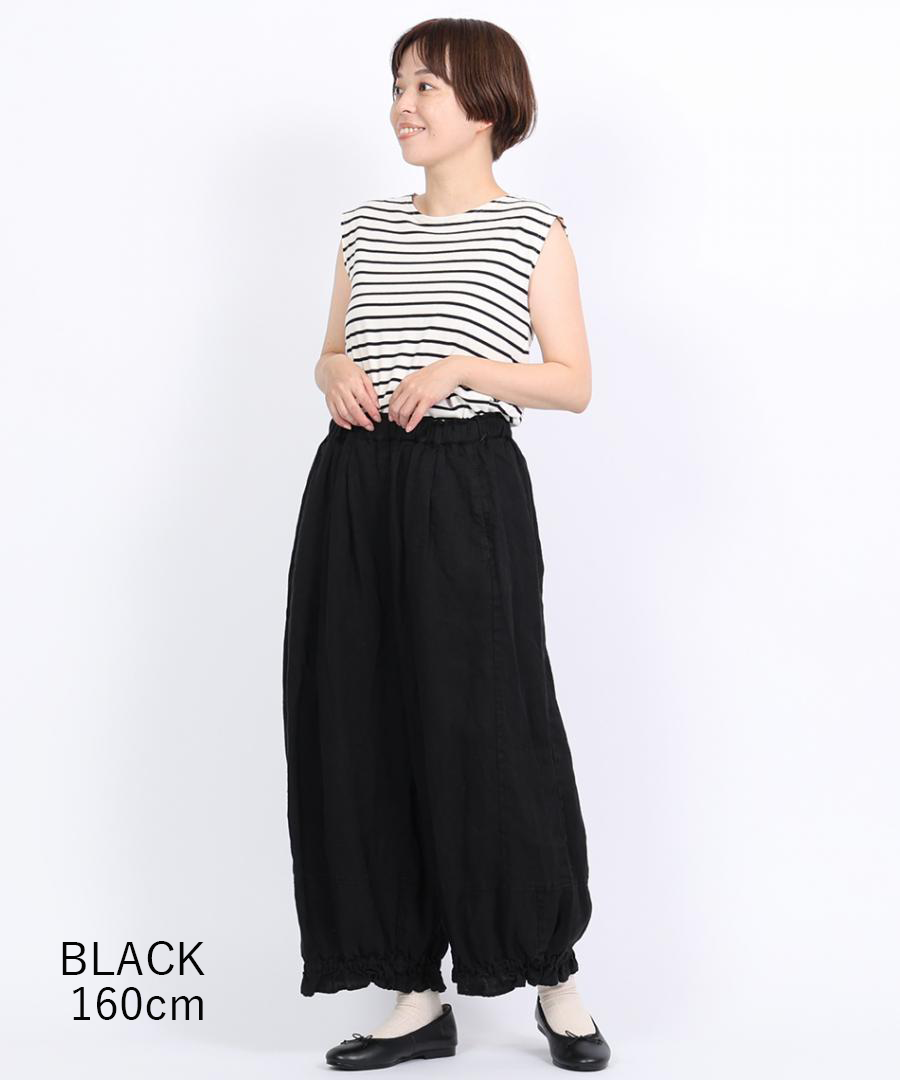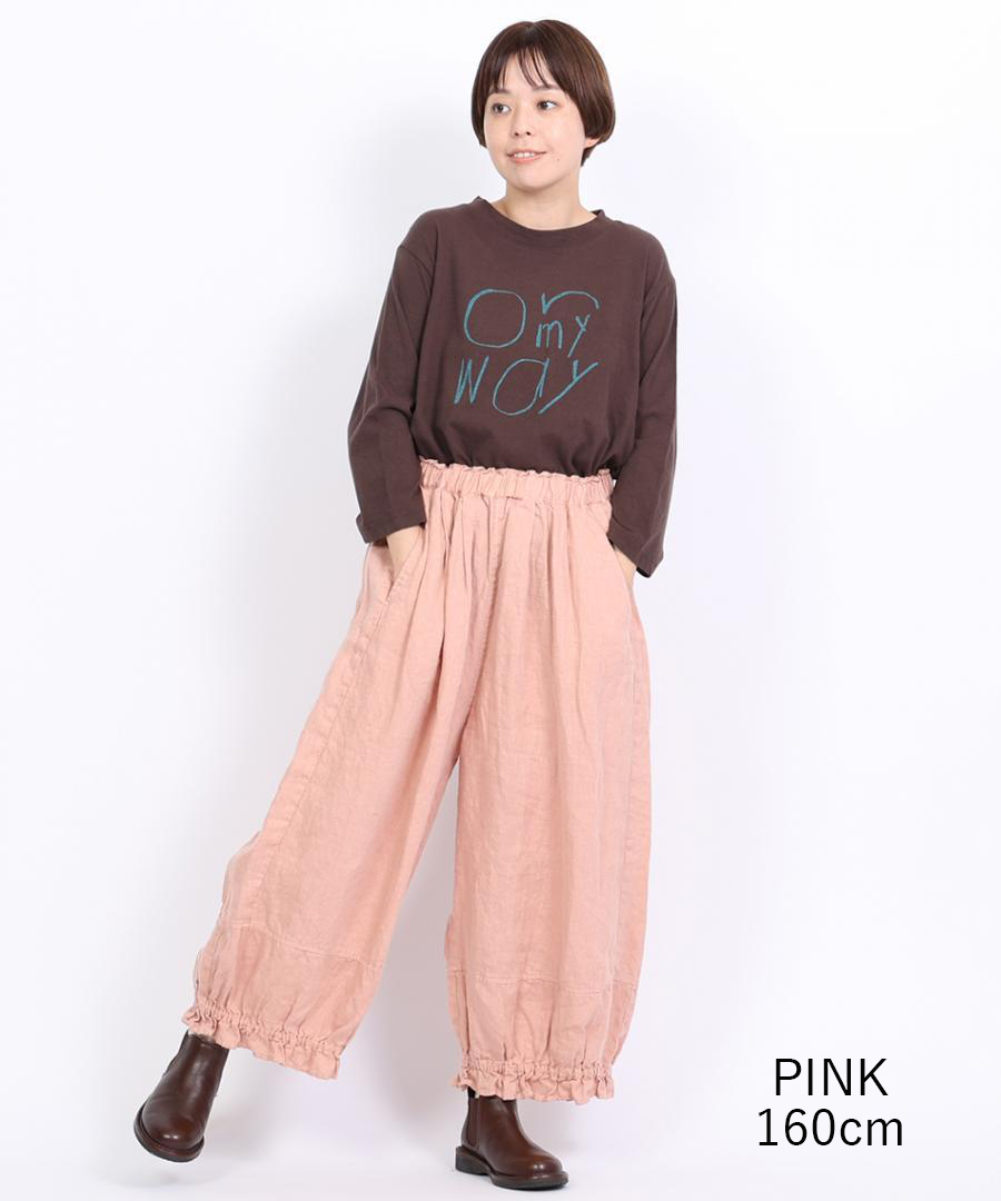 股上深めのワイドでゆったりとした着心地とウエストはゴム仕様で締め付け感がなく、ストレスフリーな履き心地です。