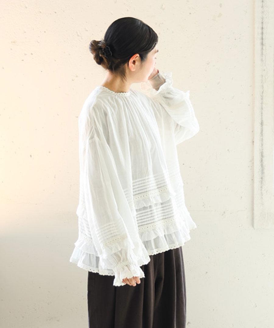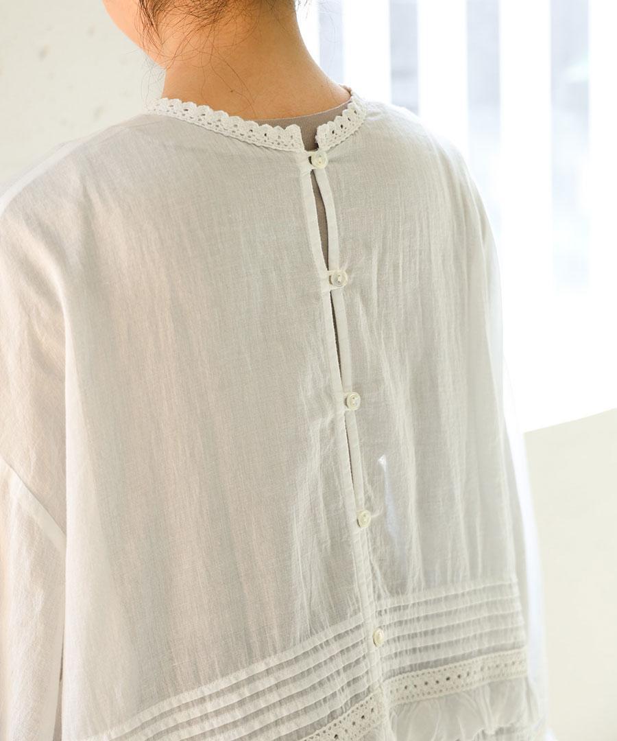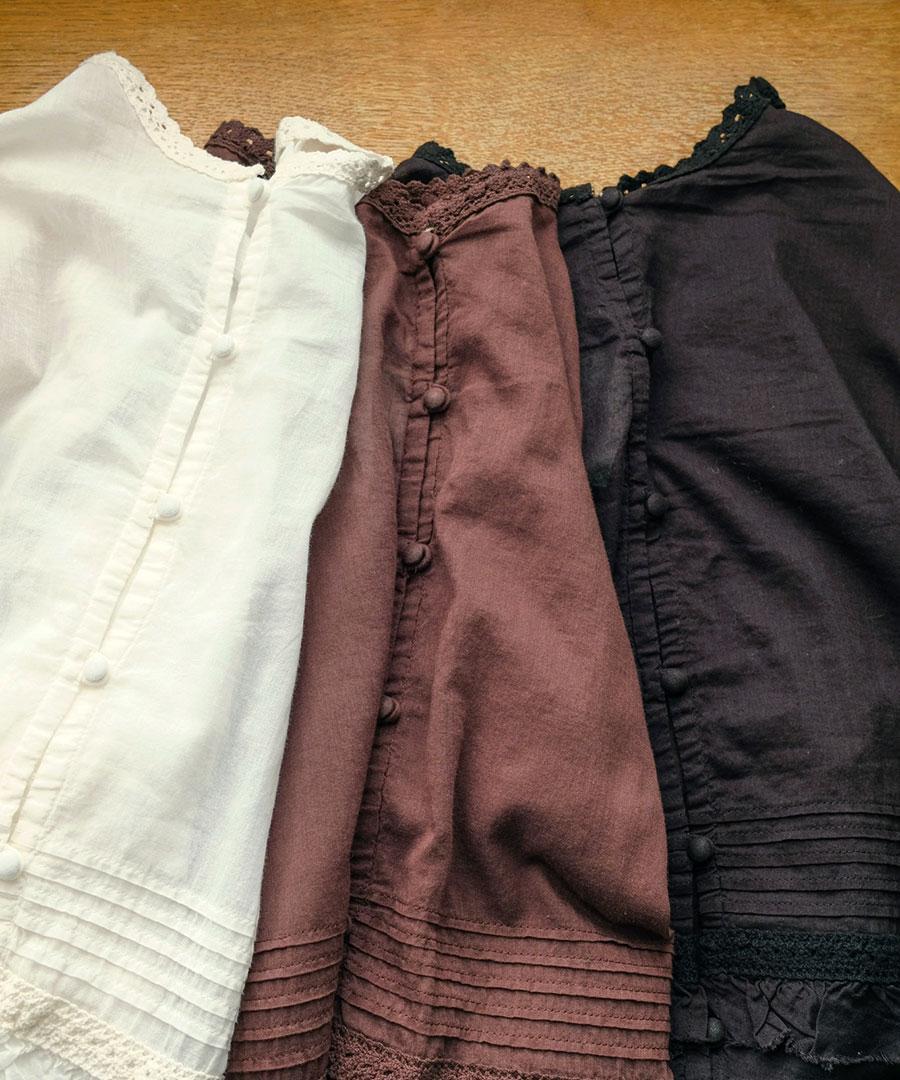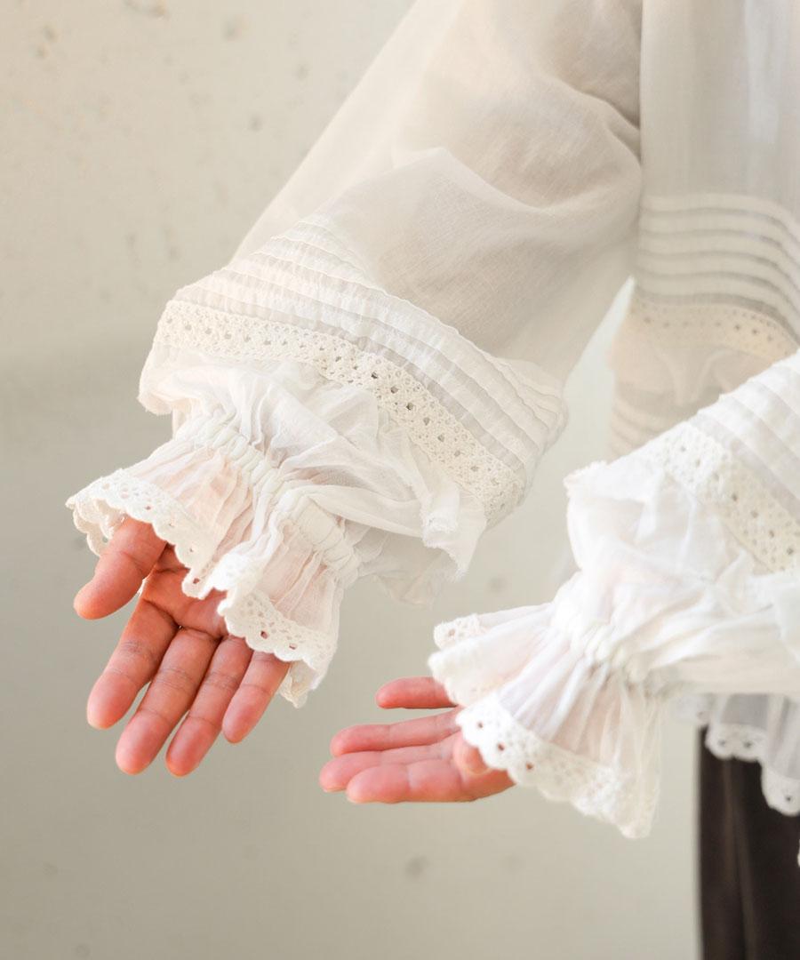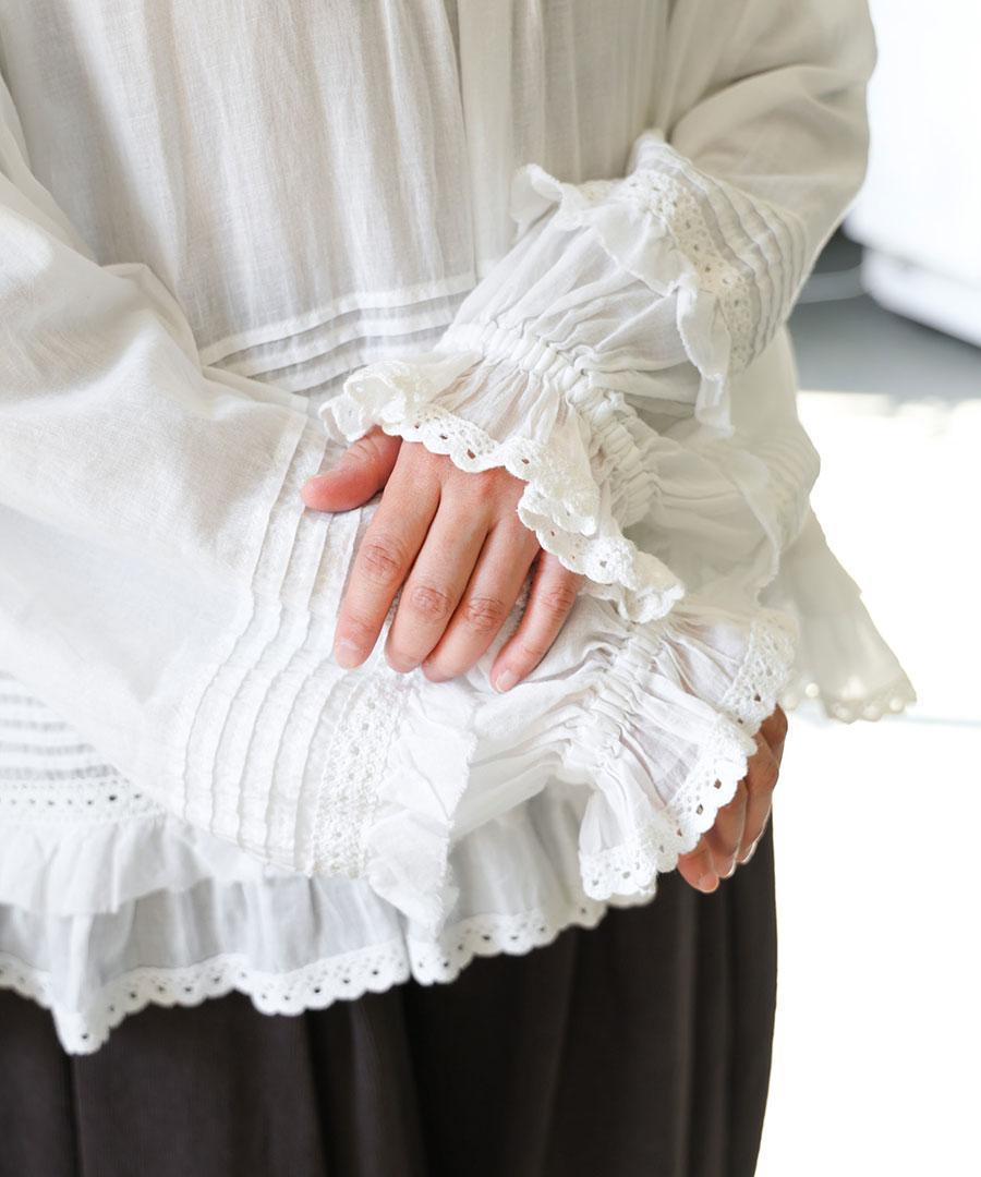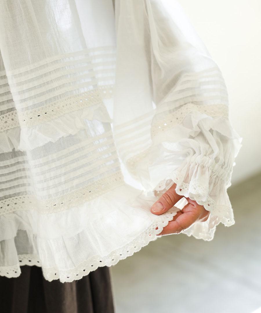 袖や裾の細部にまで施されたピンタックやレースの装飾やクルミ釦など、ナチュラルな雰囲気に上品なアクセントを加えています。