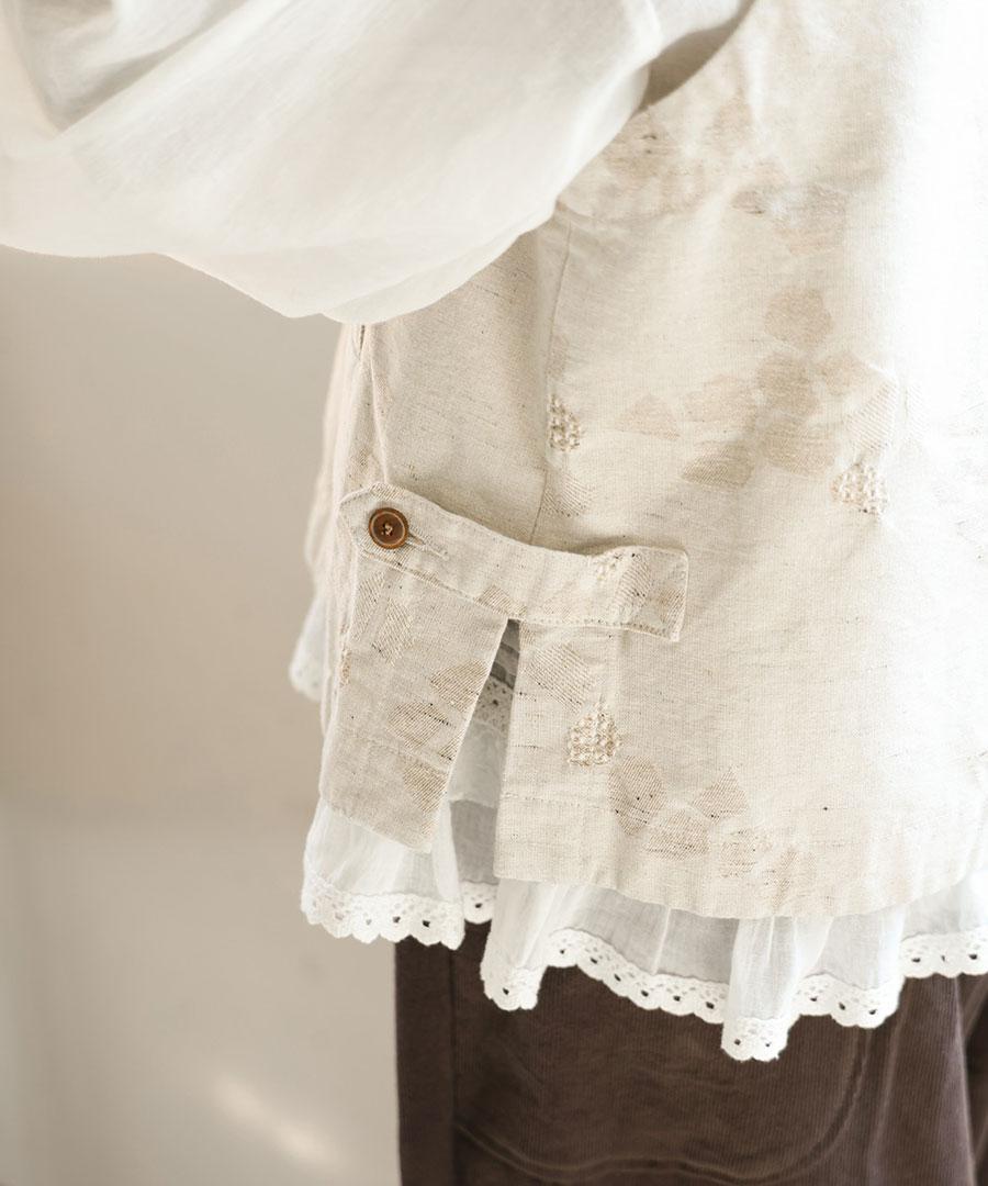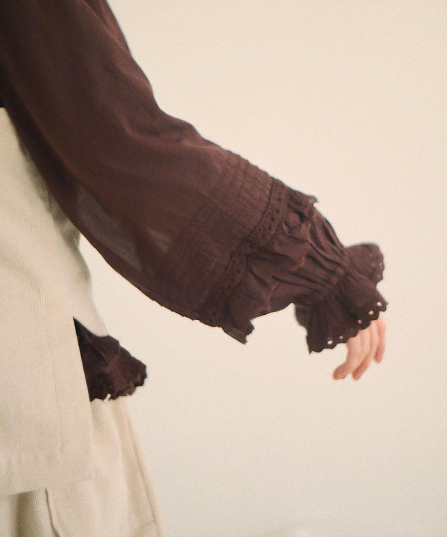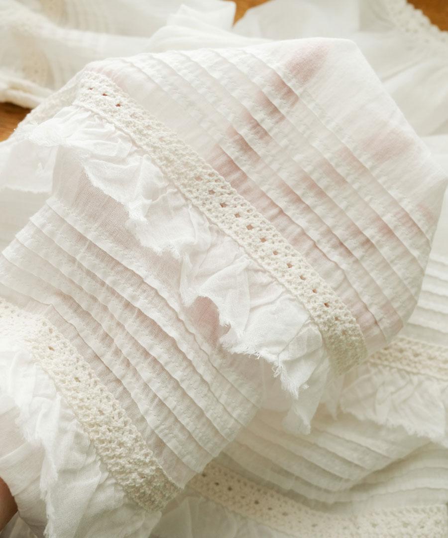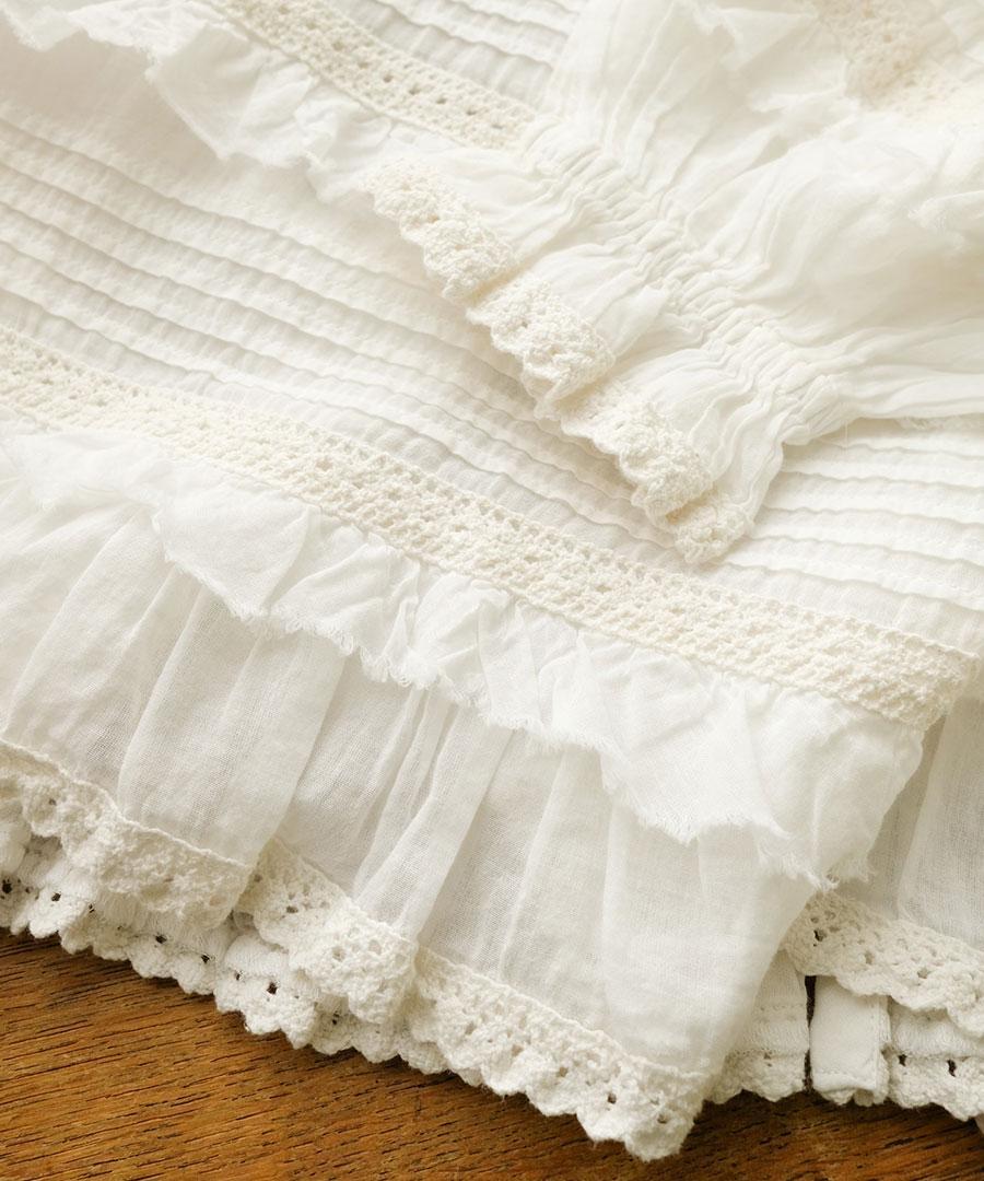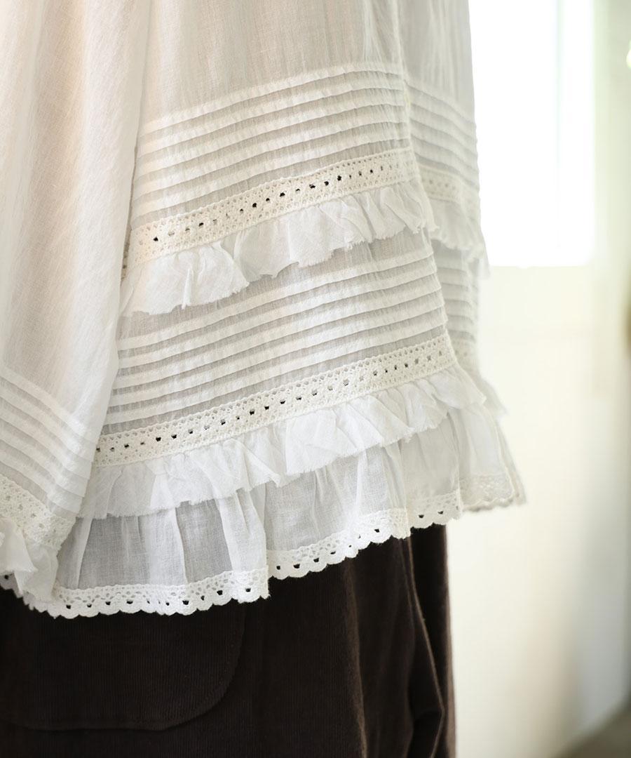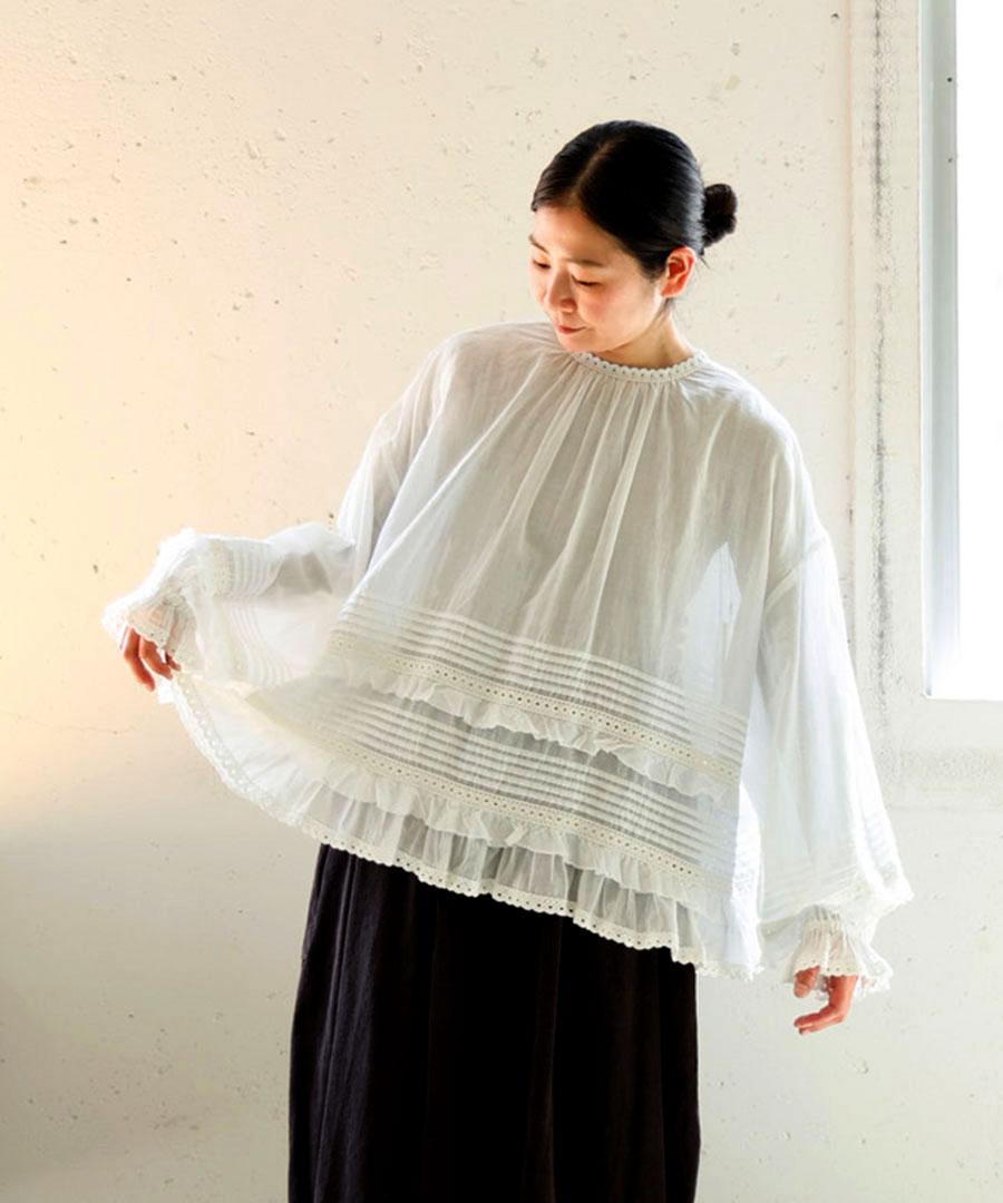 袖や裾の細部にまで施されたピンタックやレースの装飾やクルミ釦など、ナチュラルな雰囲気に上品なアクセントを加えています。