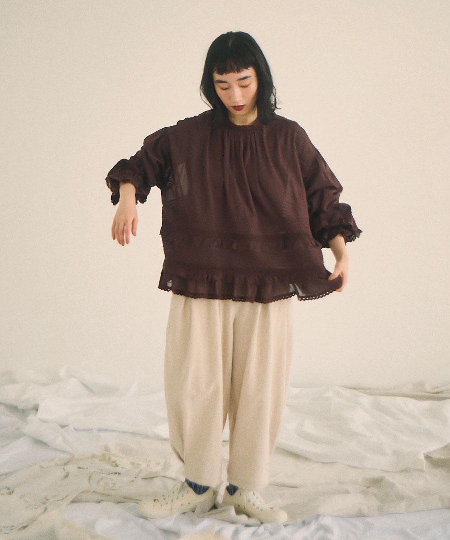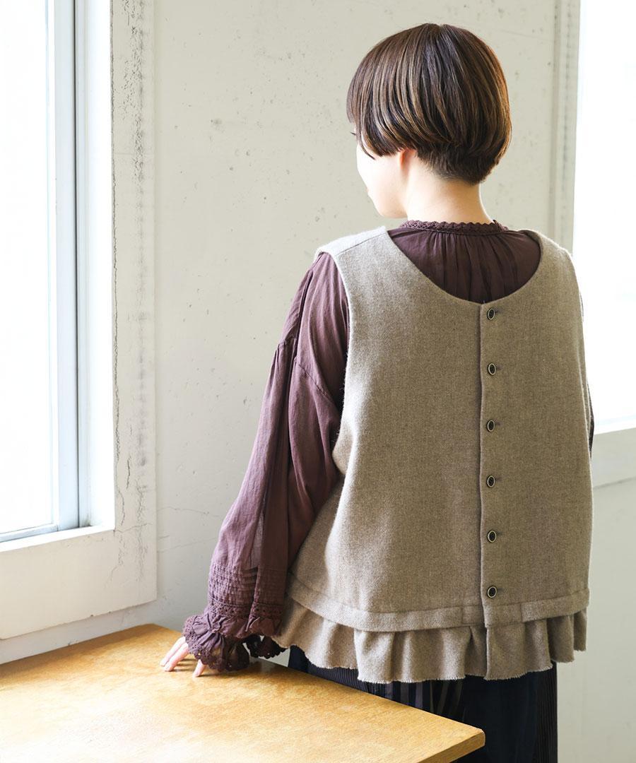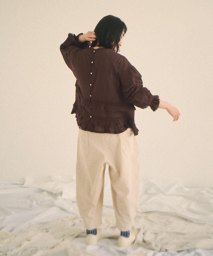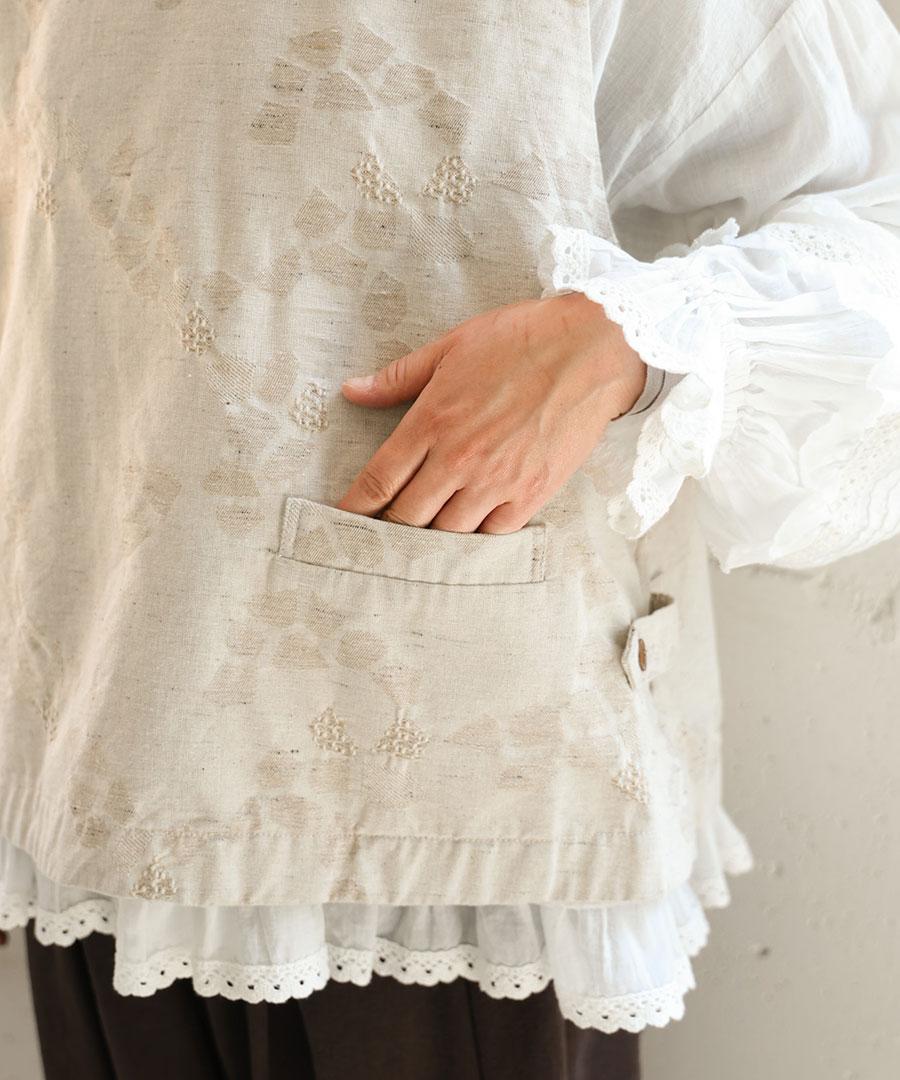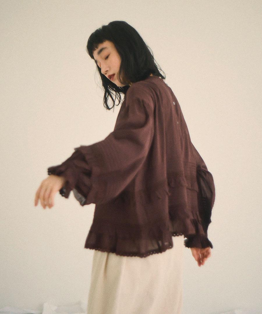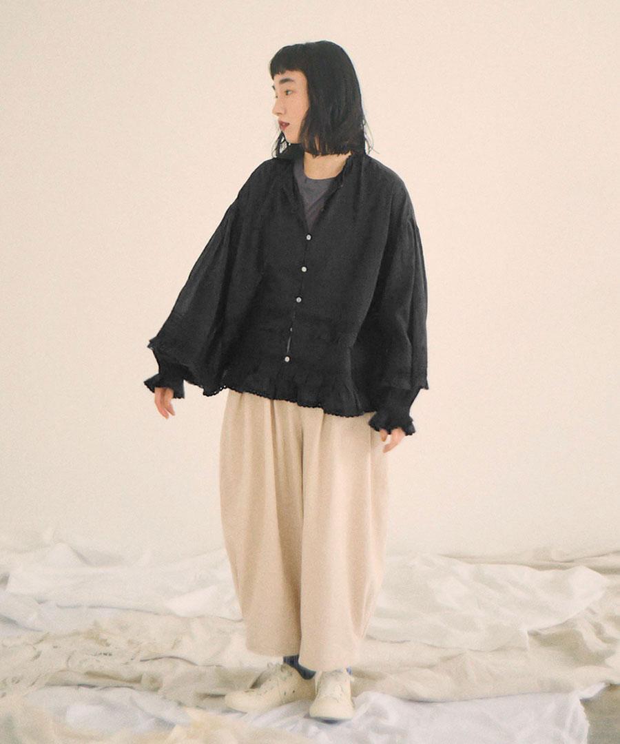 袖や裾の細部にまで施されたピンタックやレースの装飾やクルミ釦など、ナチュラルな雰囲気に上品なアクセントを加えています。