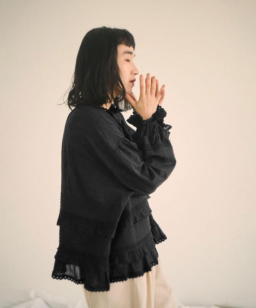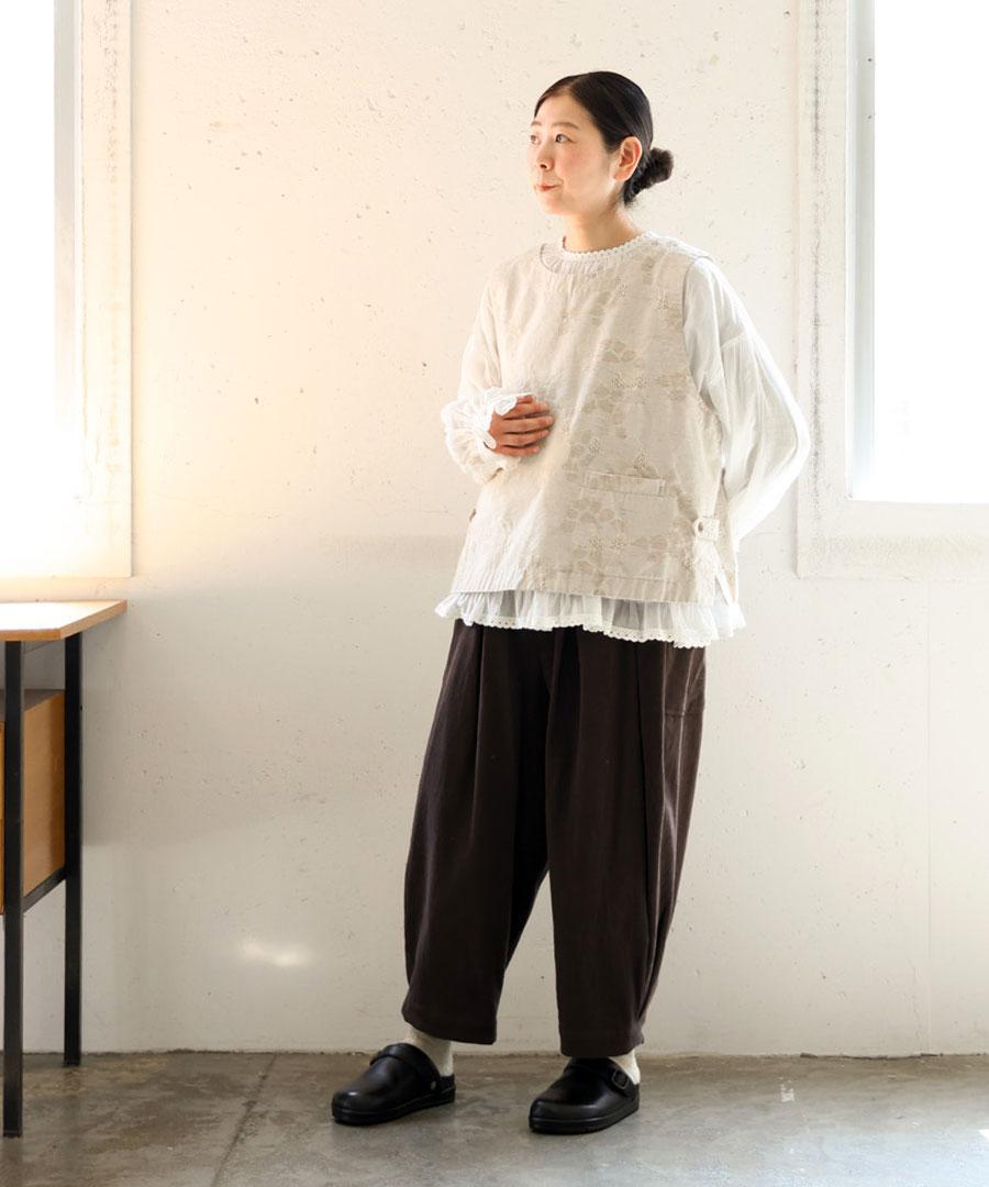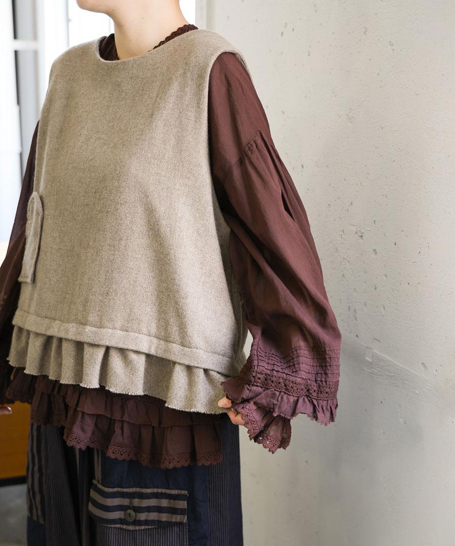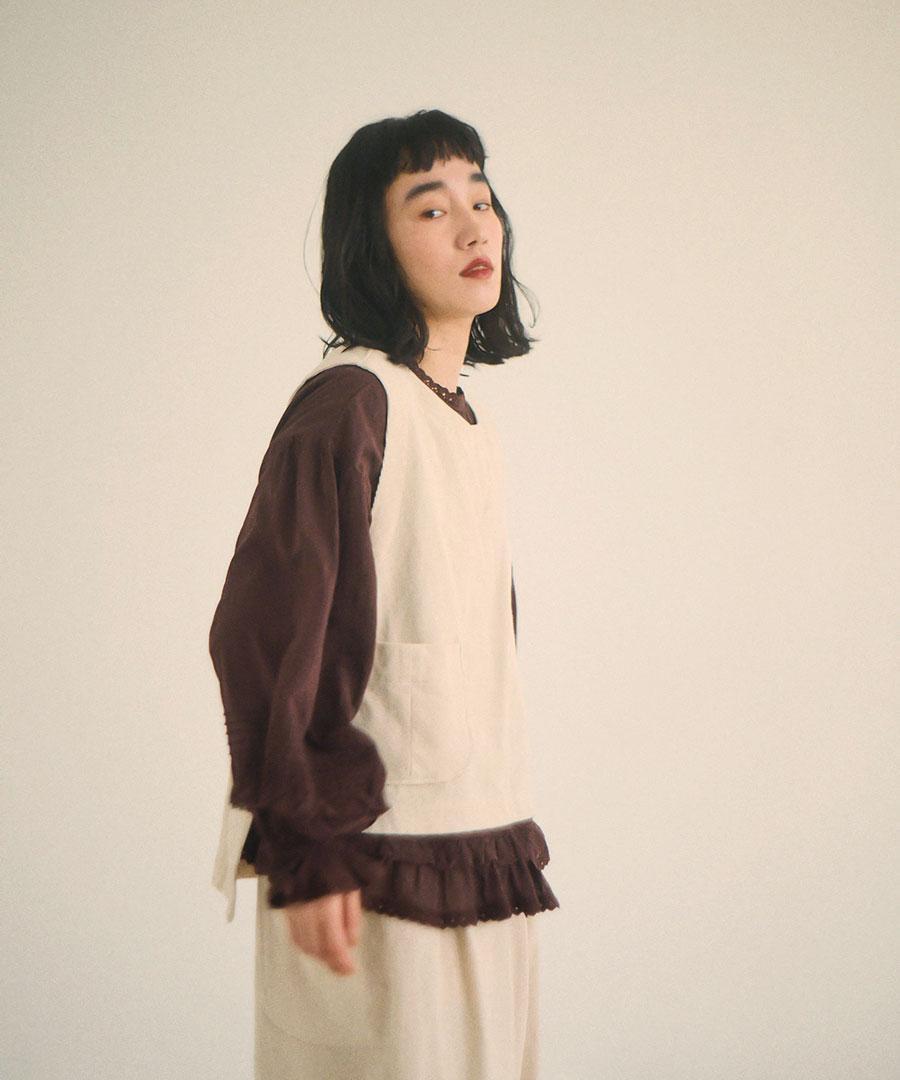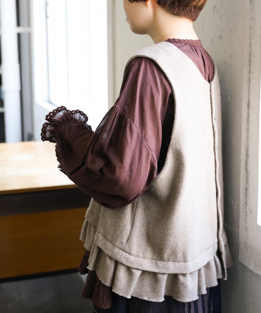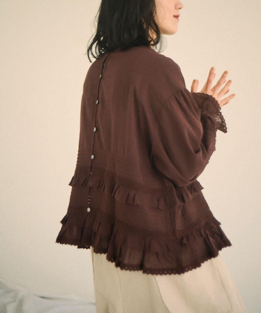 袖や裾の細部にまで施されたピンタックやレースの装飾やクルミ釦など、ナチュラルな雰囲気に上品なアクセントを加えています。