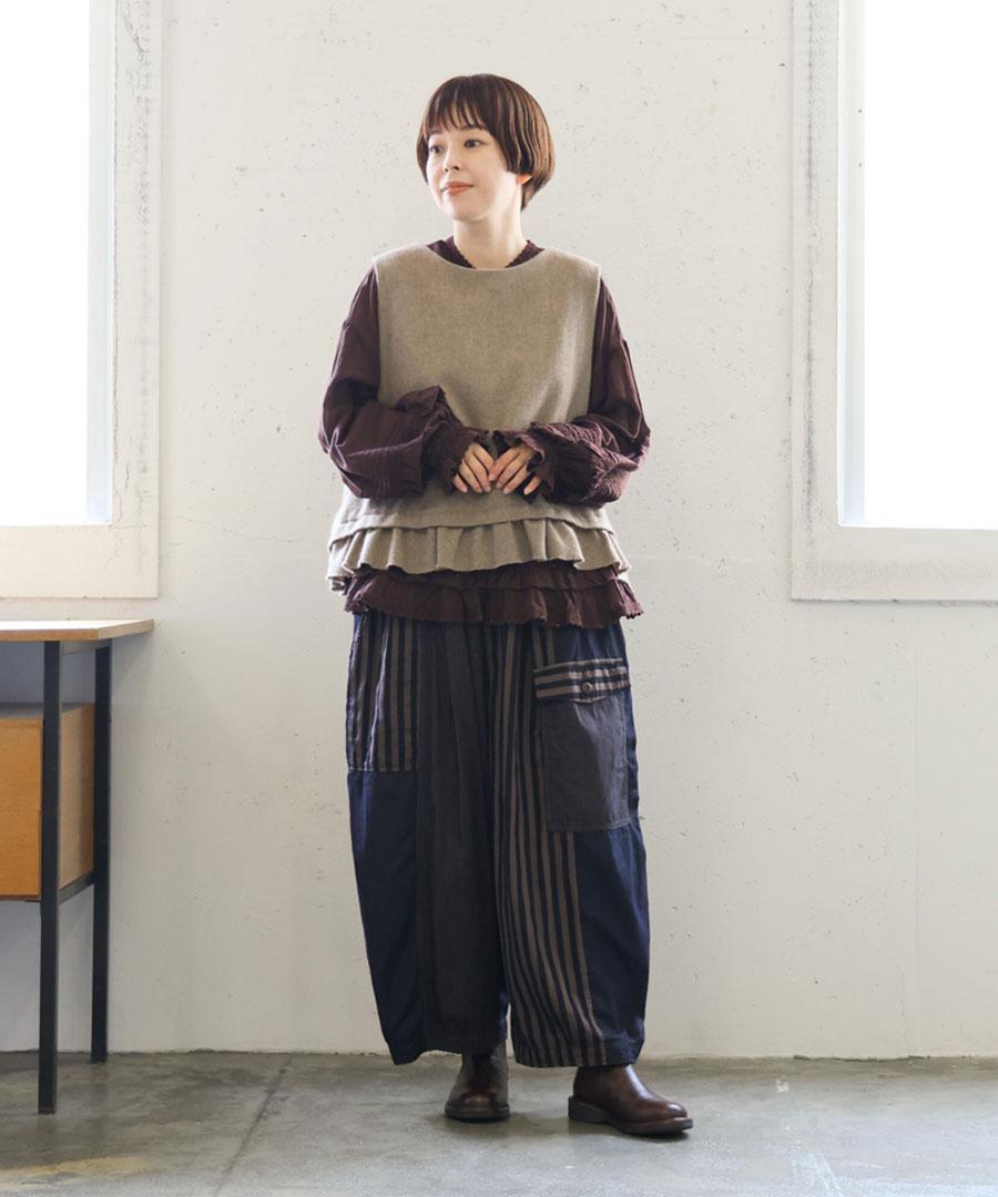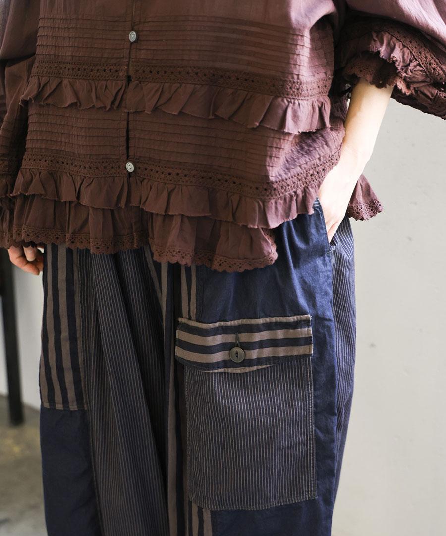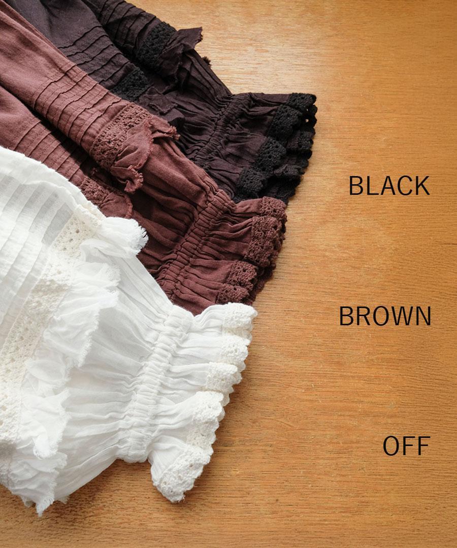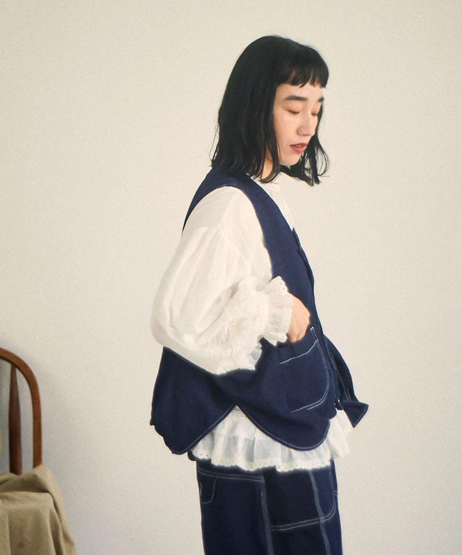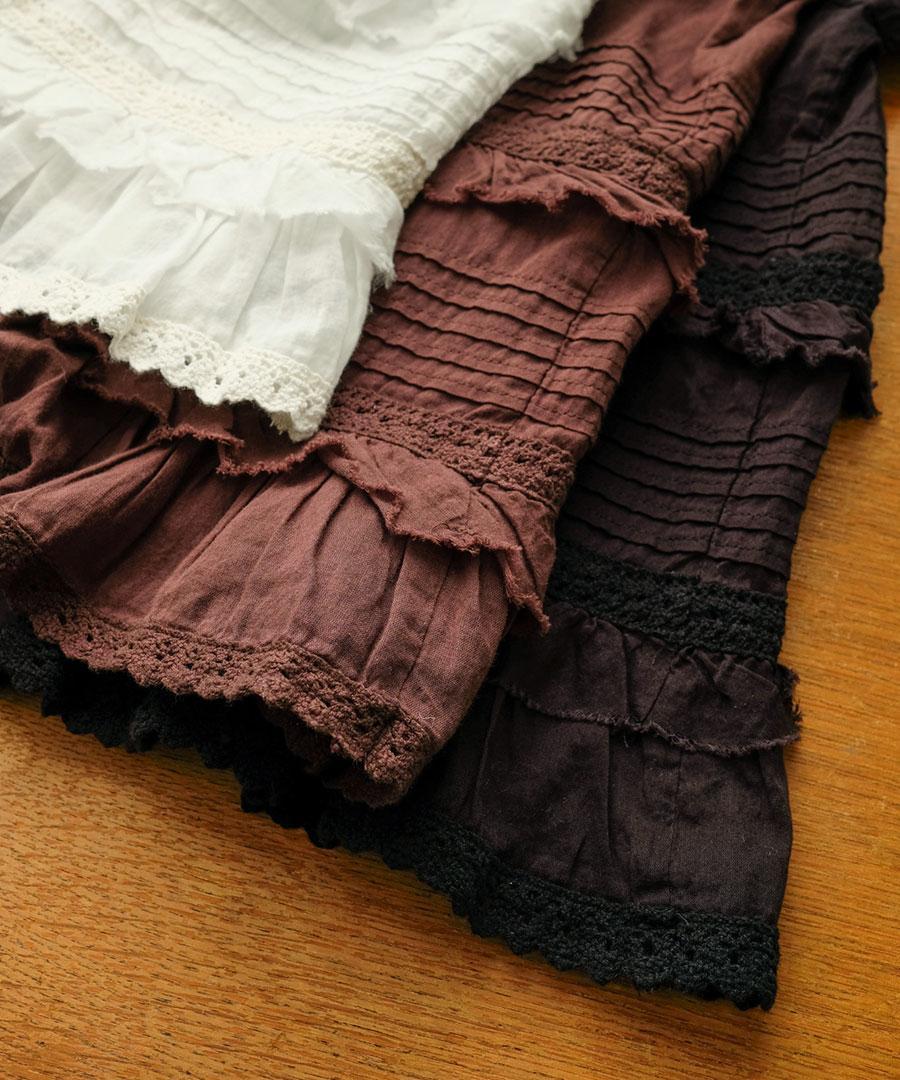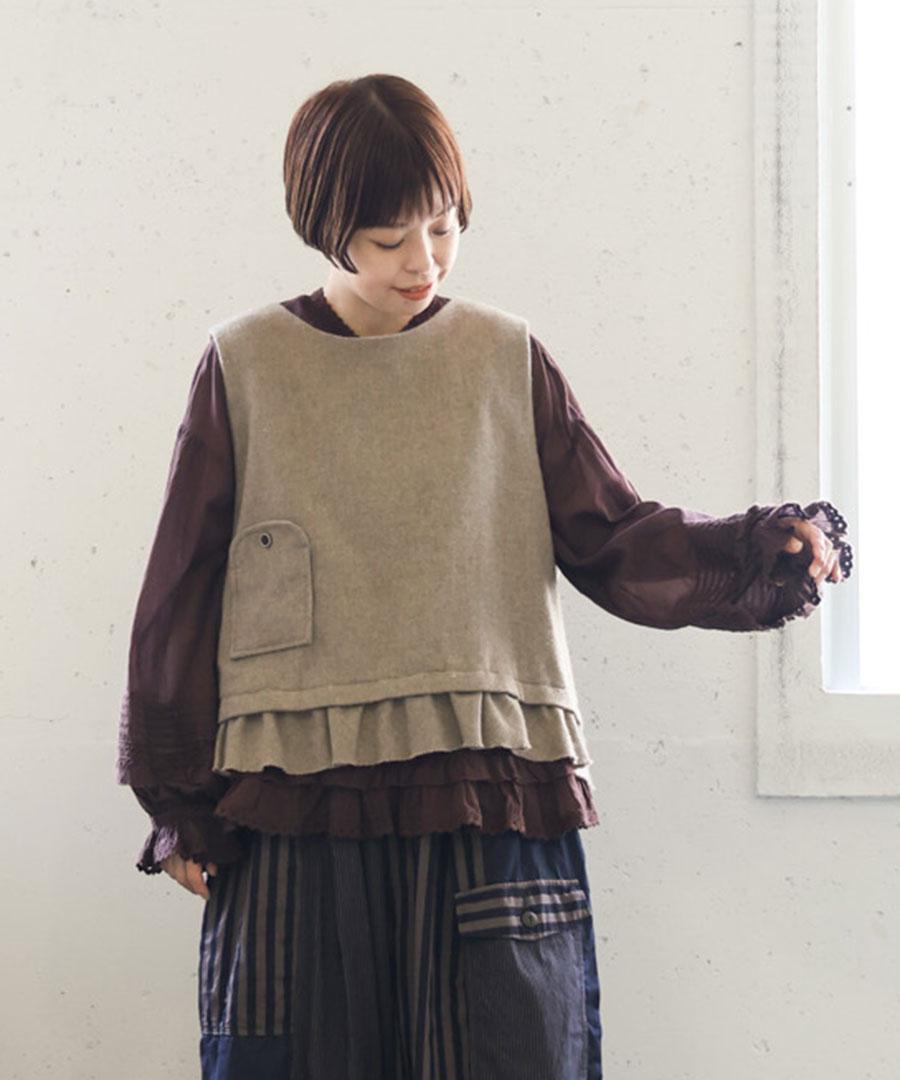 袖や裾の細部にまで施されたピンタックやレースの装飾やクルミ釦など、ナチュラルな雰囲気に上品なアクセントを加えています。