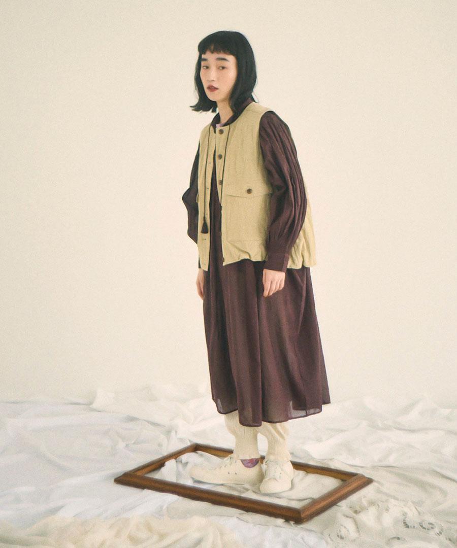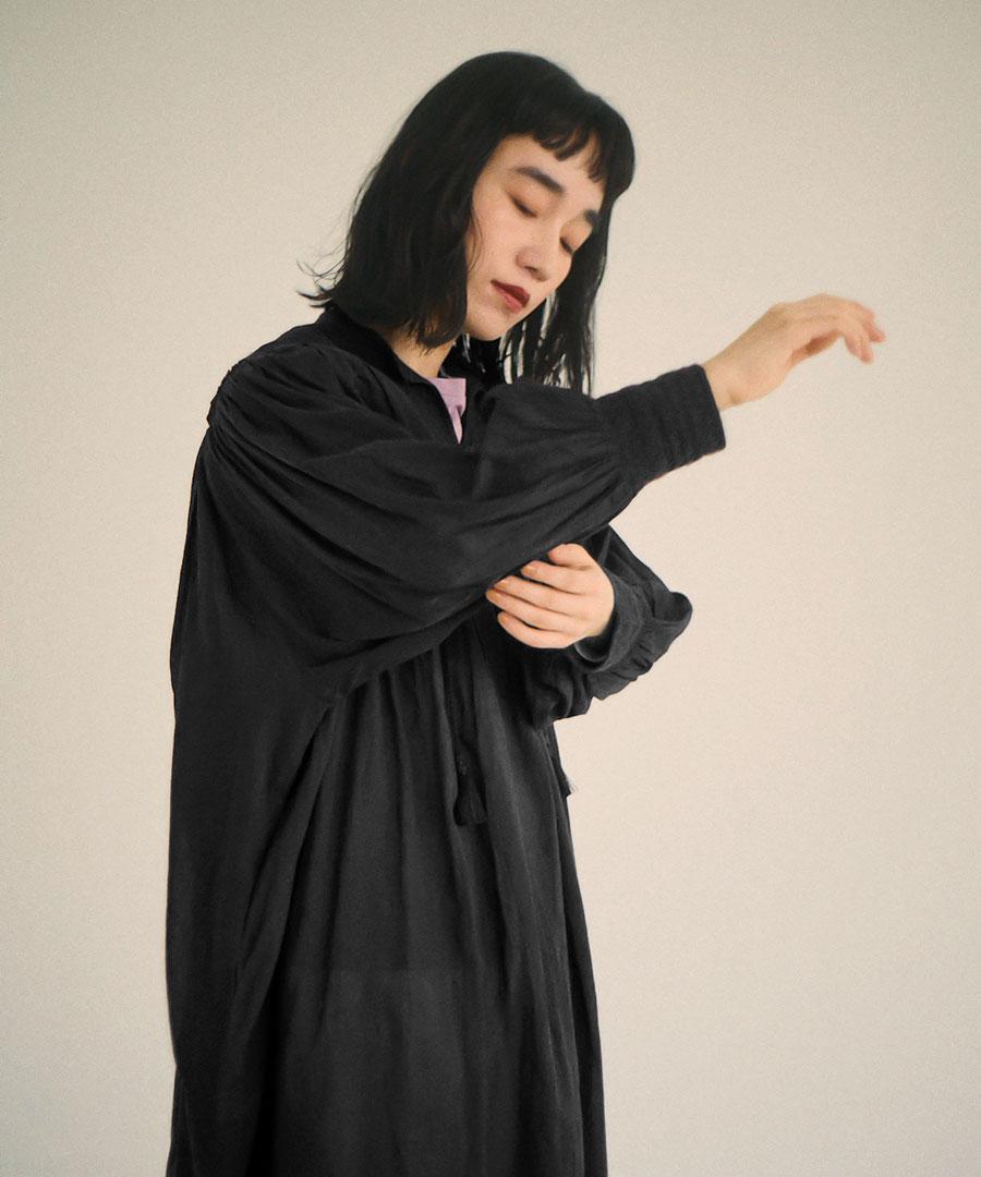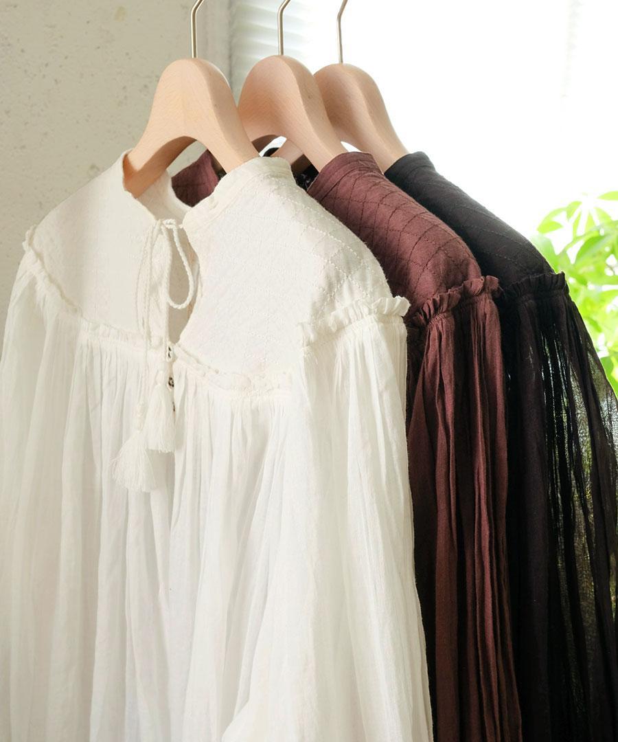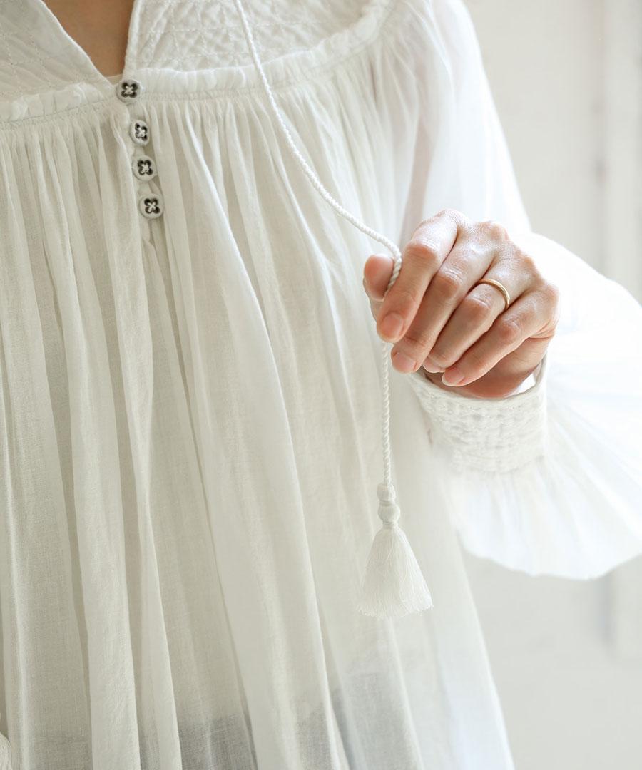 さらに、フロントには生地と同素材の共布のボタン、バンドカラーの先にはタッセル付きのコードが配され、素朴さの中にさりげない遊び心と上品さを加えています。