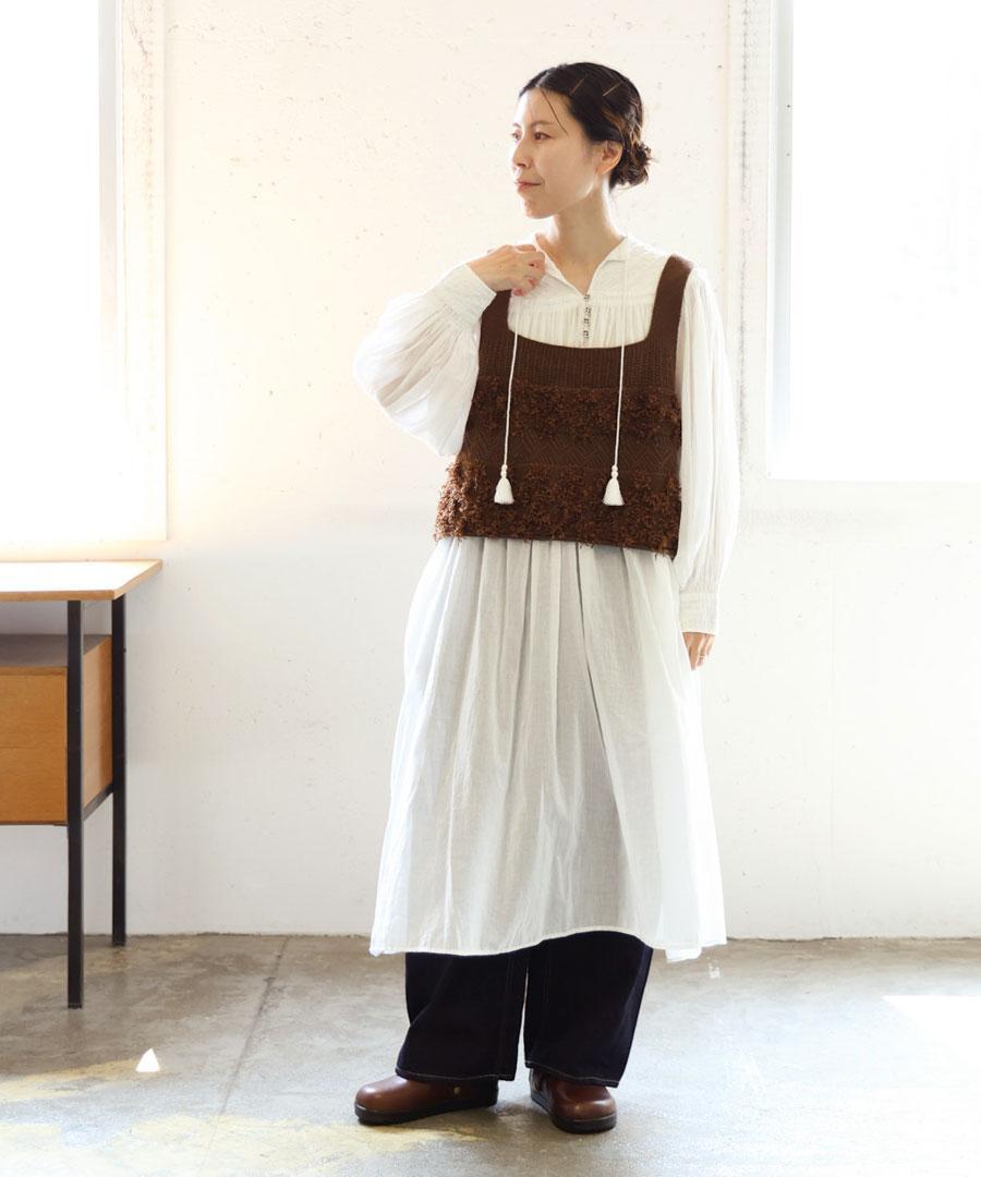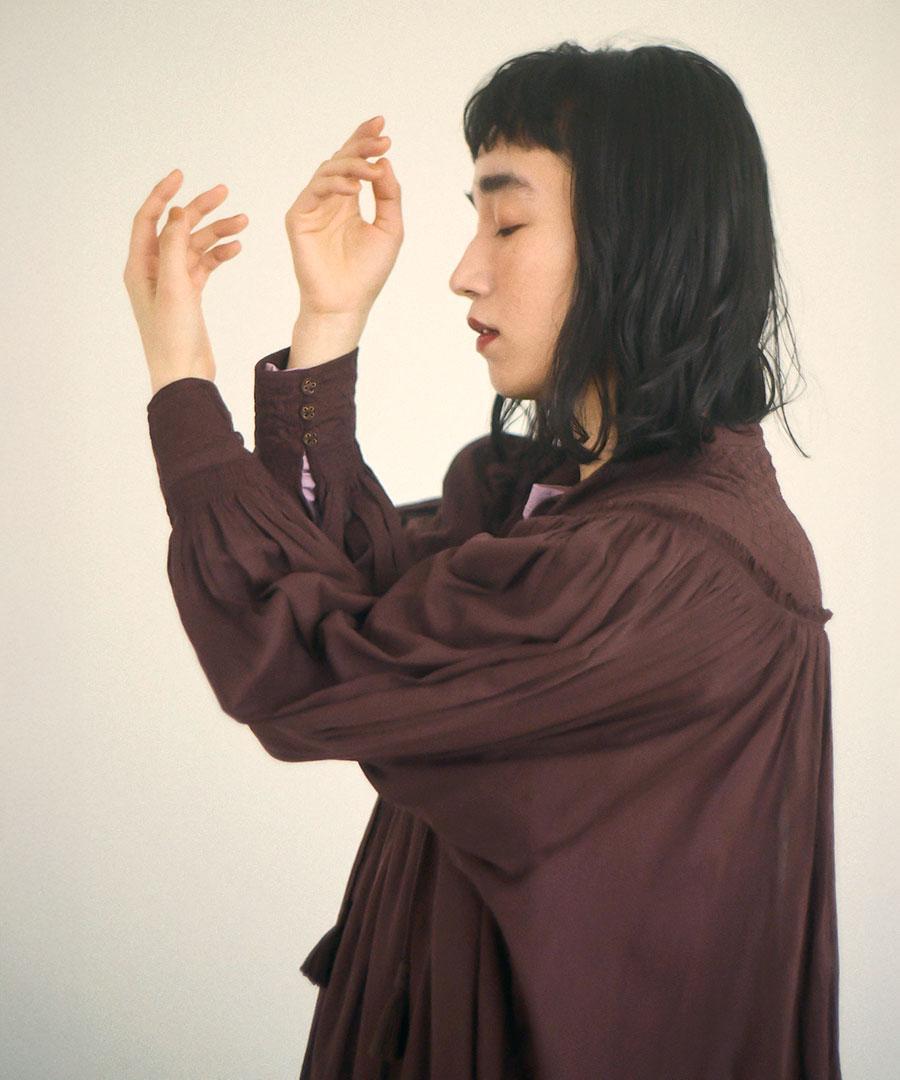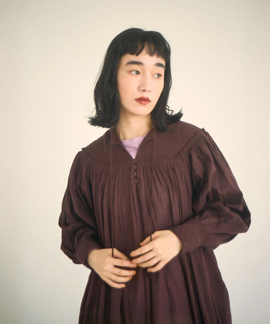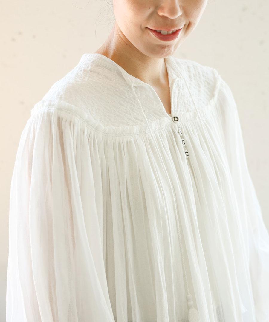 さらに、フロントには生地と同素材の共布のボタン、バンドカラーの先にはタッセル付きのコードが配され、素朴さの中にさりげない遊び心と上品さを加えています。