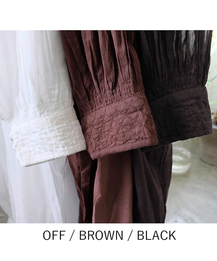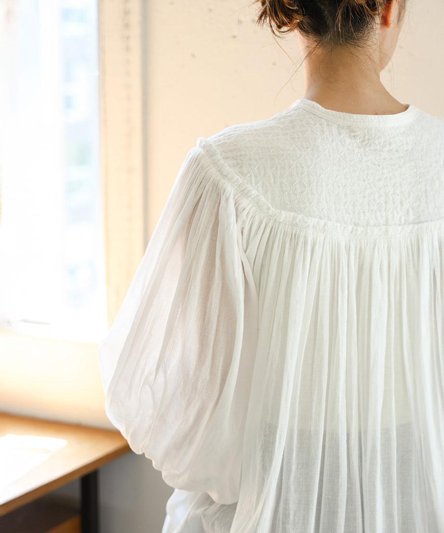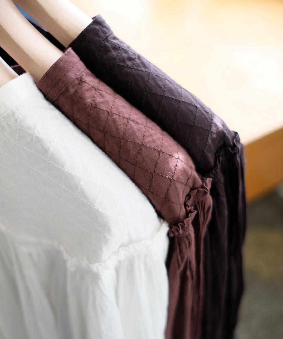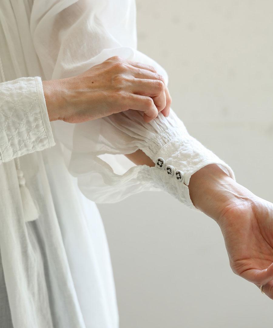 首元やカフス(袖口)には、クロスステッチが施されており、シンプルな生地に奥行きとアンティークのような温もりを添えています。