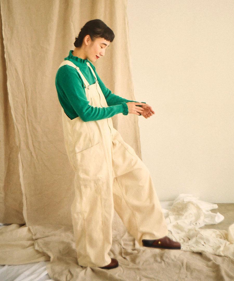表情豊かな素材と大胆な切り替えが魅力。大人のリラックスサロペット。