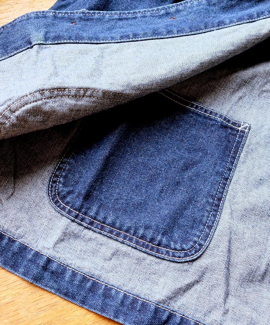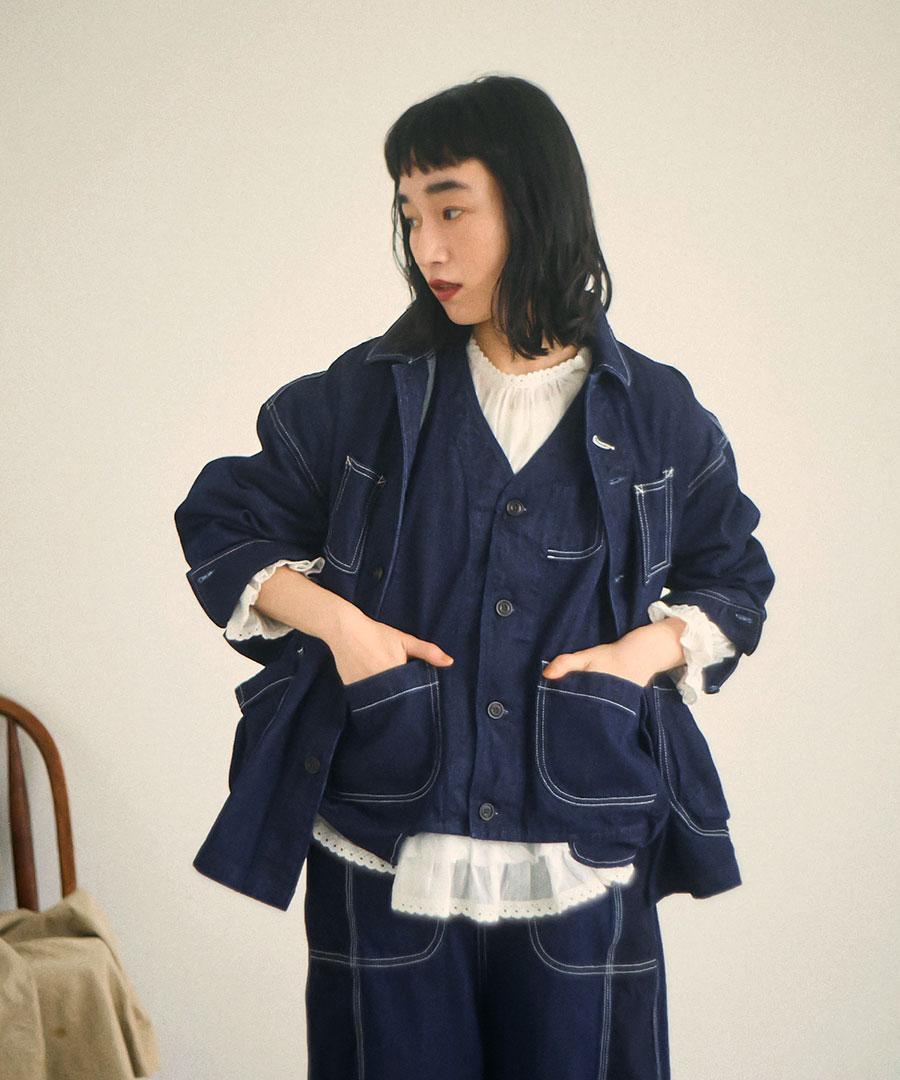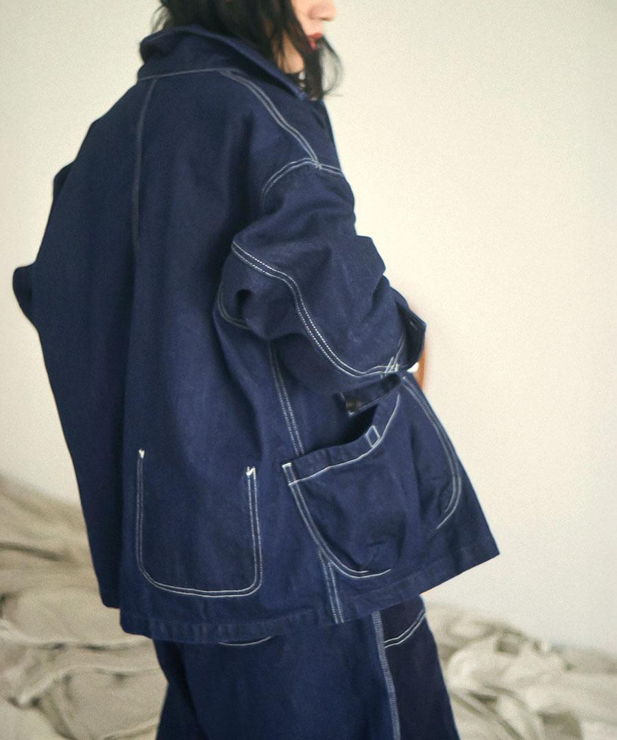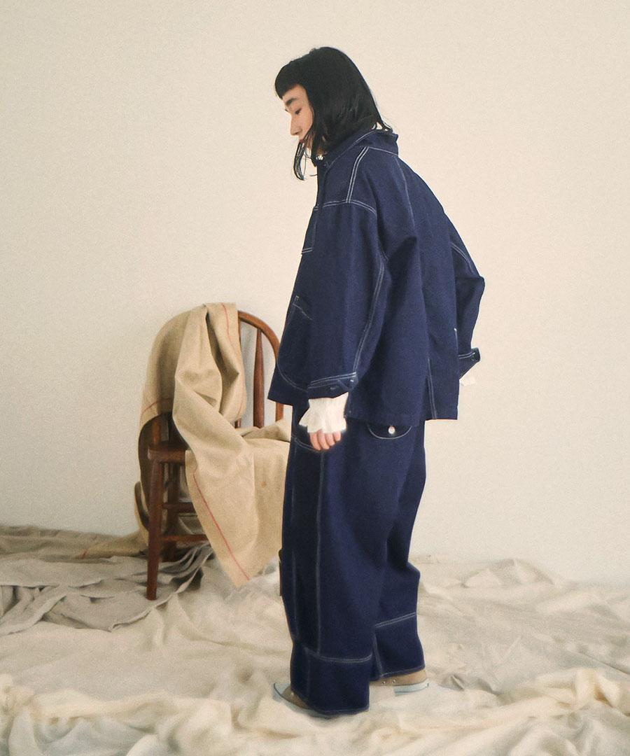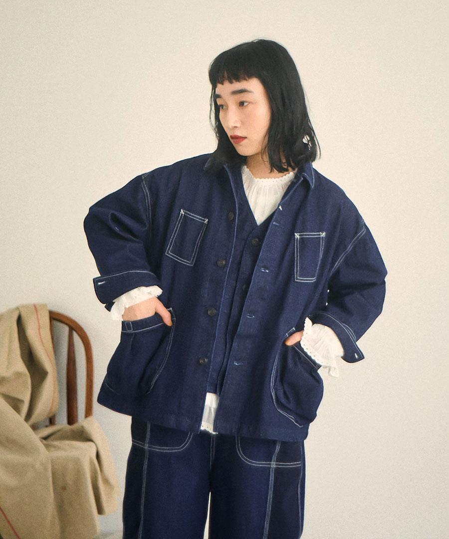 ・INDIGO / FADE BLUEカラーは、程よい厚みの10オンスデニム生地を使用。コントラストの効いた白いステッチを随所に施し、ワークウェア特有のタフさとデザイン性を両立。丈夫で着るほどに馴染み、経年変化も楽しめます。