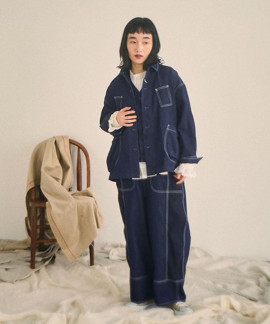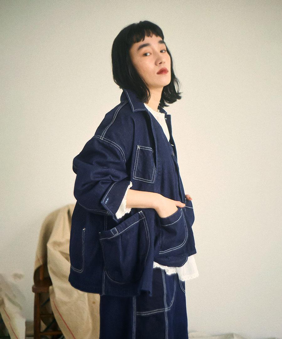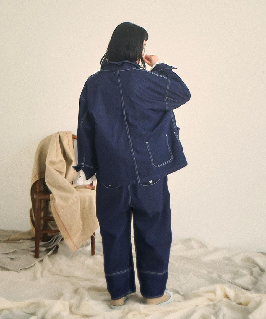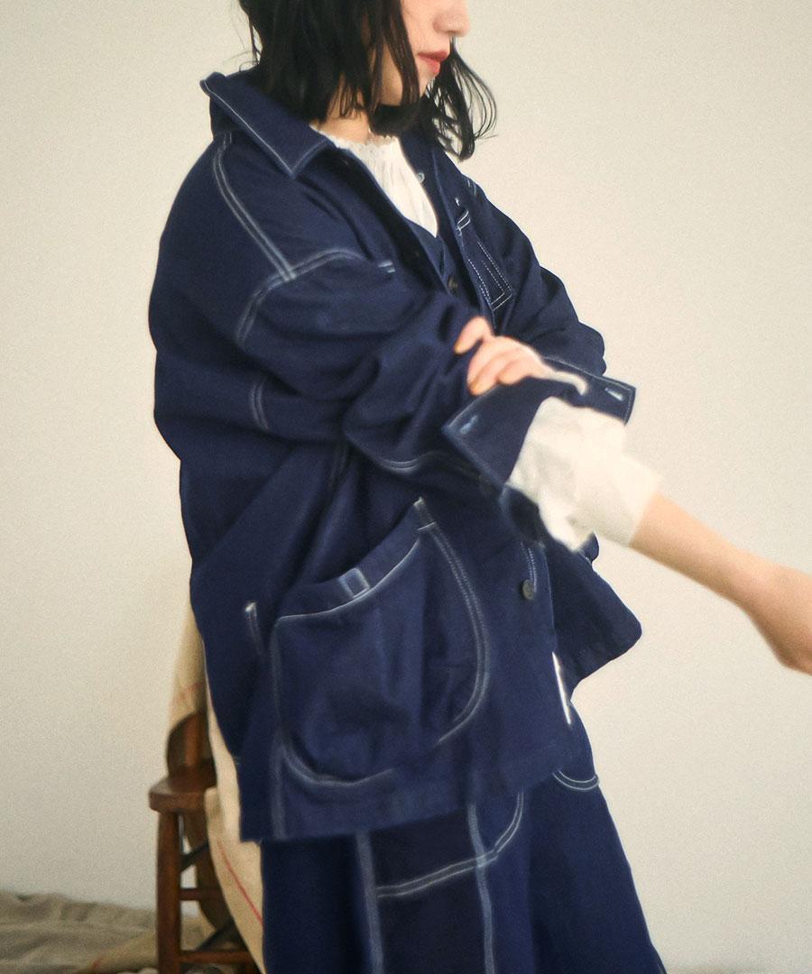 ・INDIGO / FADE BLUEカラーは、程よい厚みの10オンスデニム生地を使用。コントラストの効いた白いステッチを随所に施し、ワークウェア特有のタフさとデザイン性を両立。丈夫で着るほどに馴染み、経年変化も楽しめます。