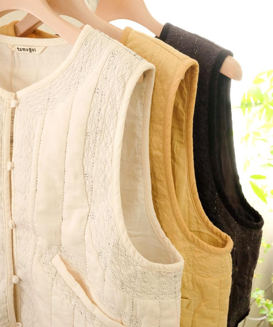 コーデュロイのパイピングと随所に施した配色カラーのステッチ刺繍、クルミ釦などtumugu:のこだわりが詰まったデザインに仕上げました。