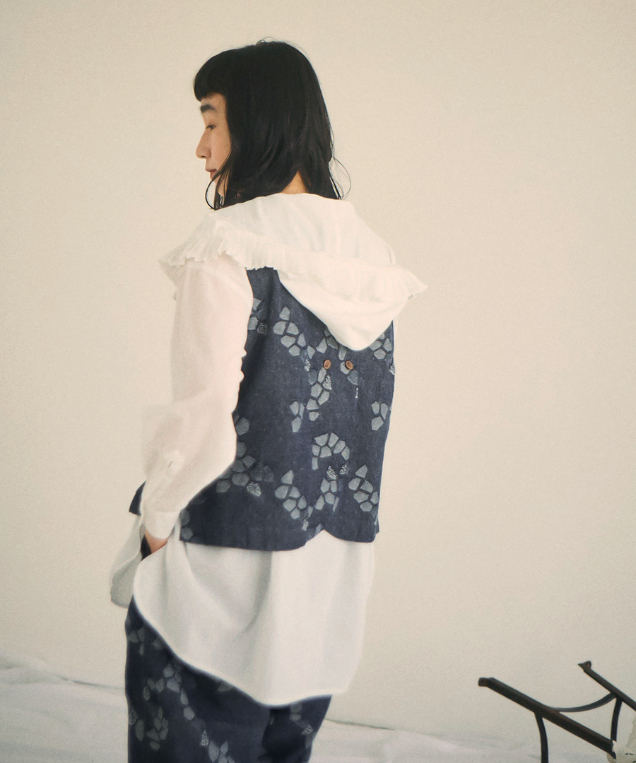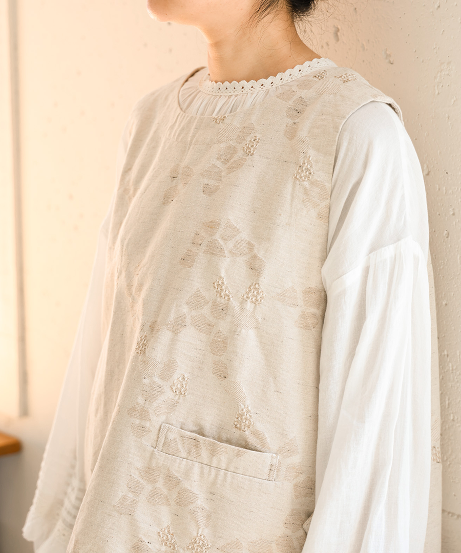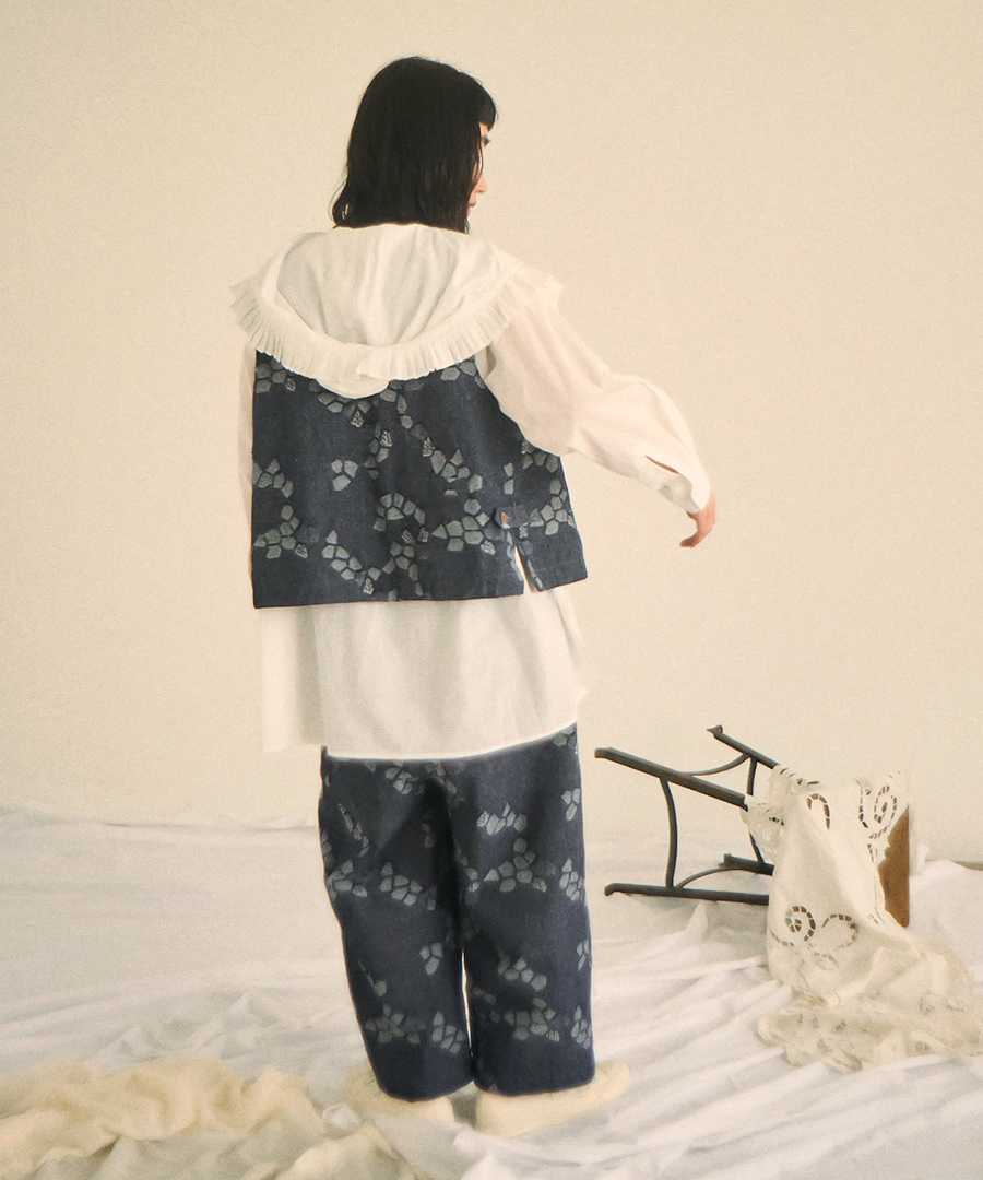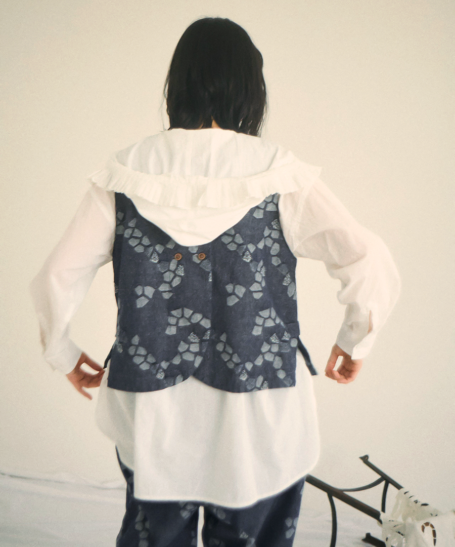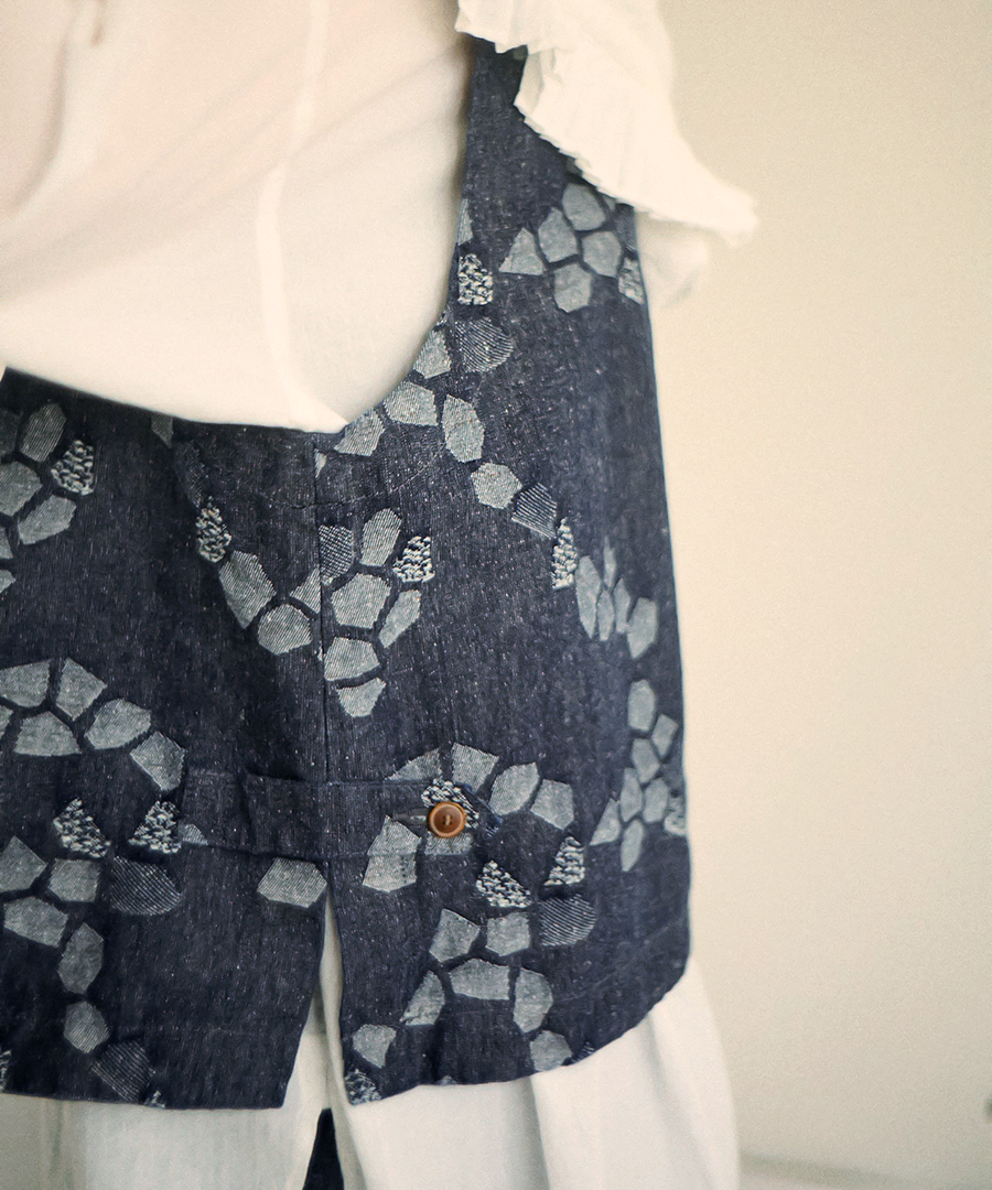 3種の織り柄を組み合わせ、ジャガード織りで幾何学柄を表現したデザインベスト。