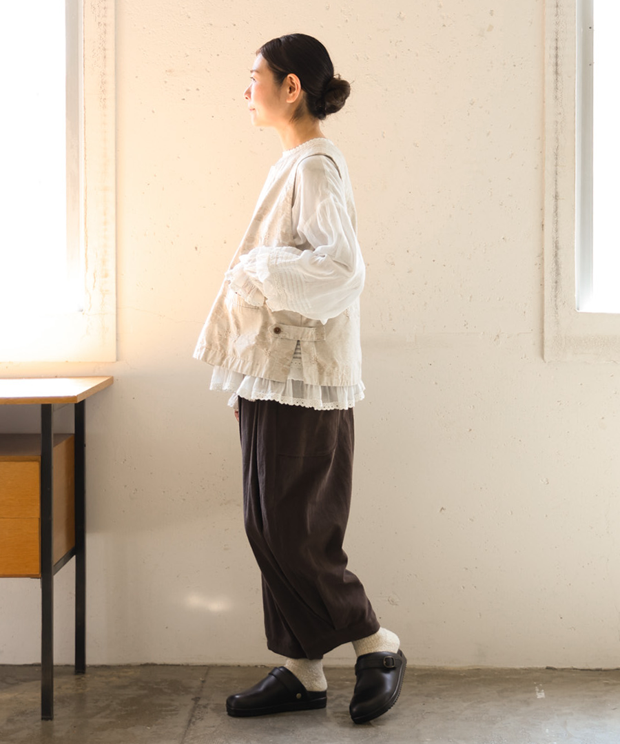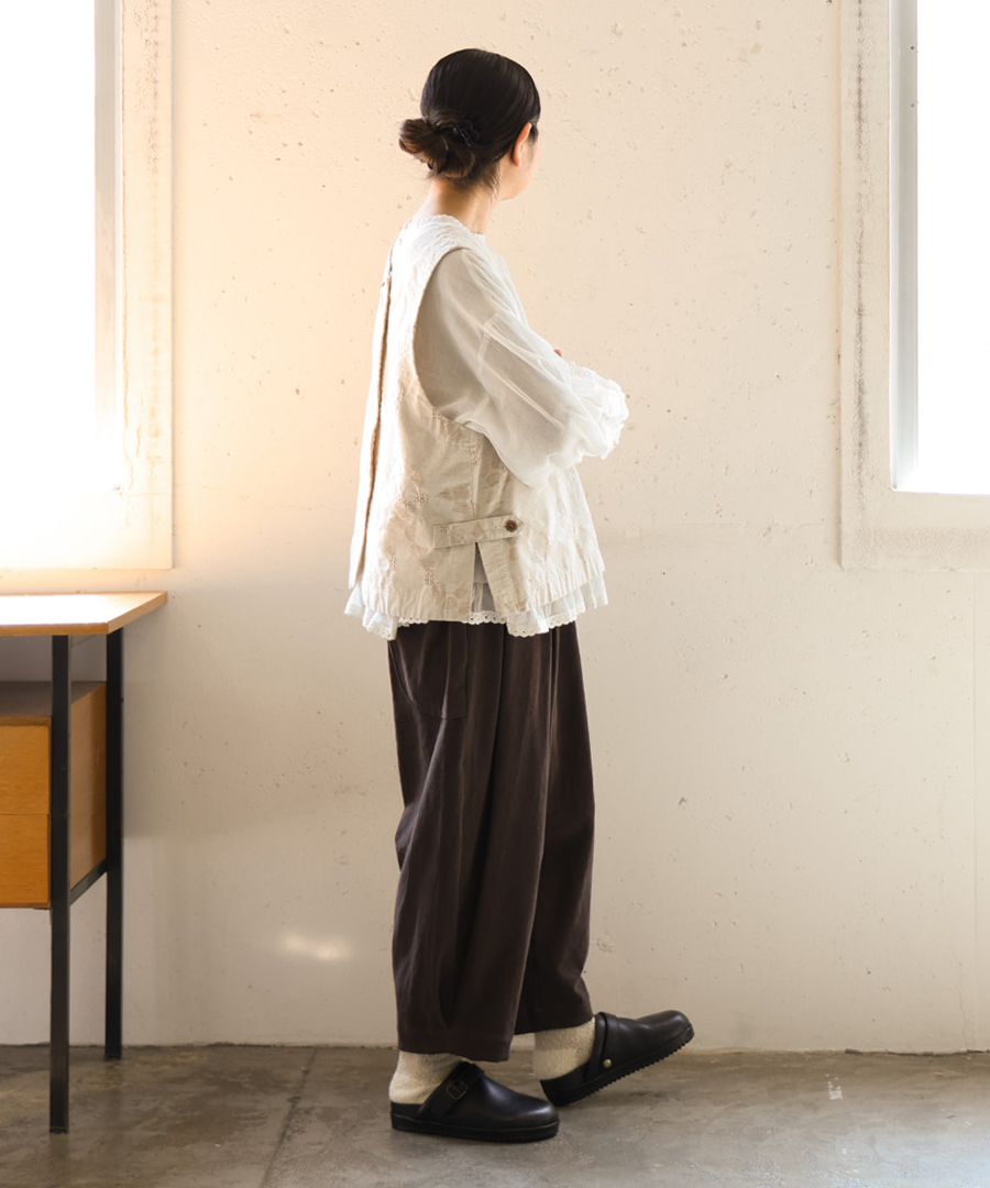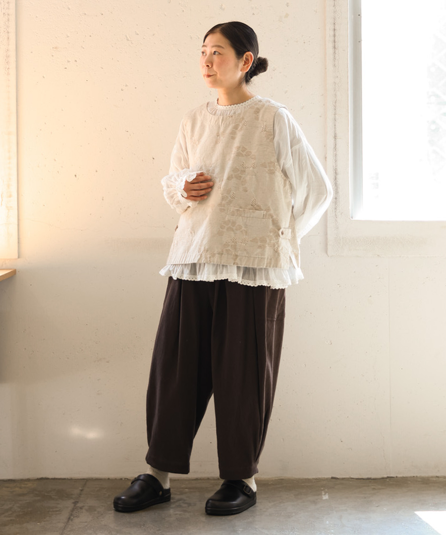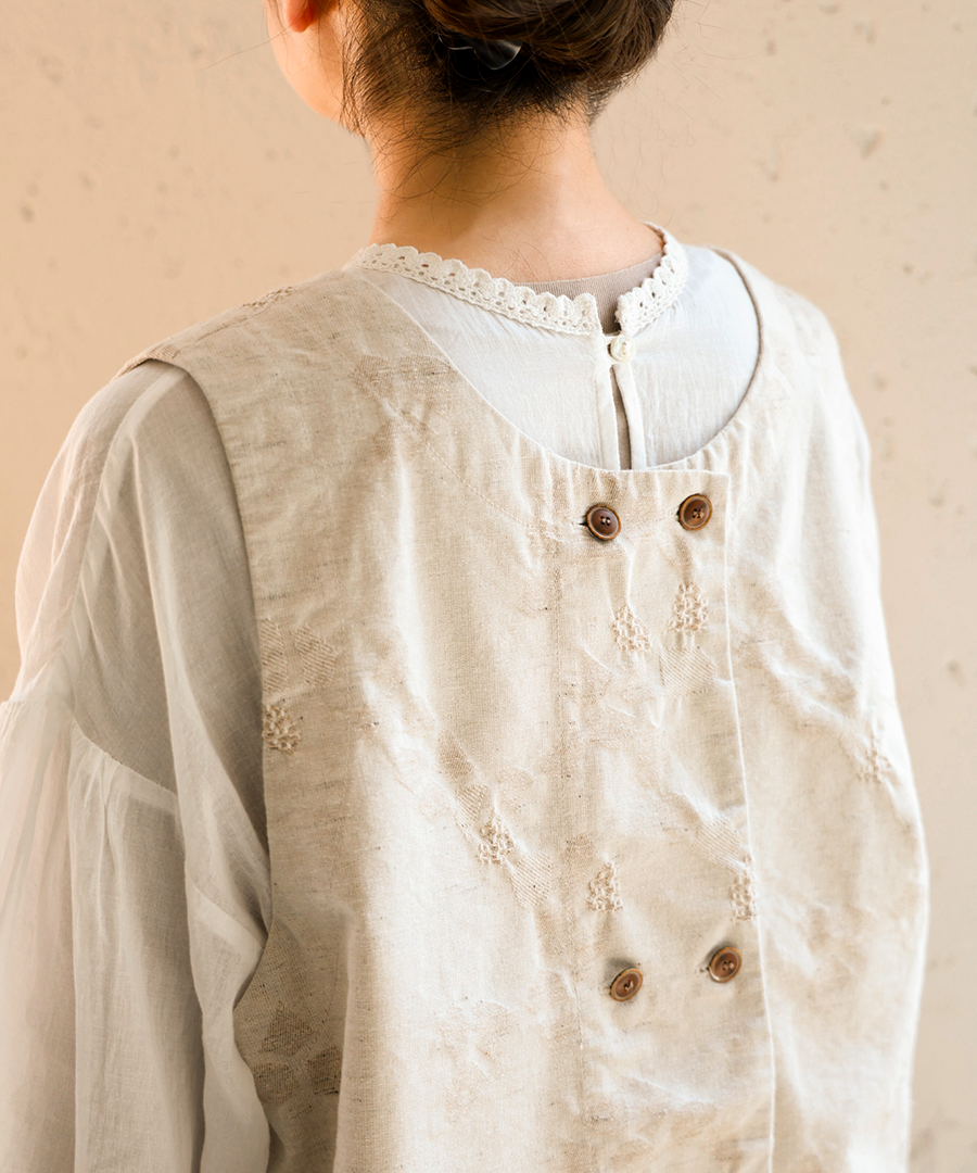 シンプルなブラウスやワンピースの上に重ねるだけで、おしゃれ度のあがるおすすめアイテムです。