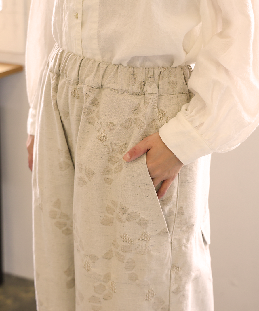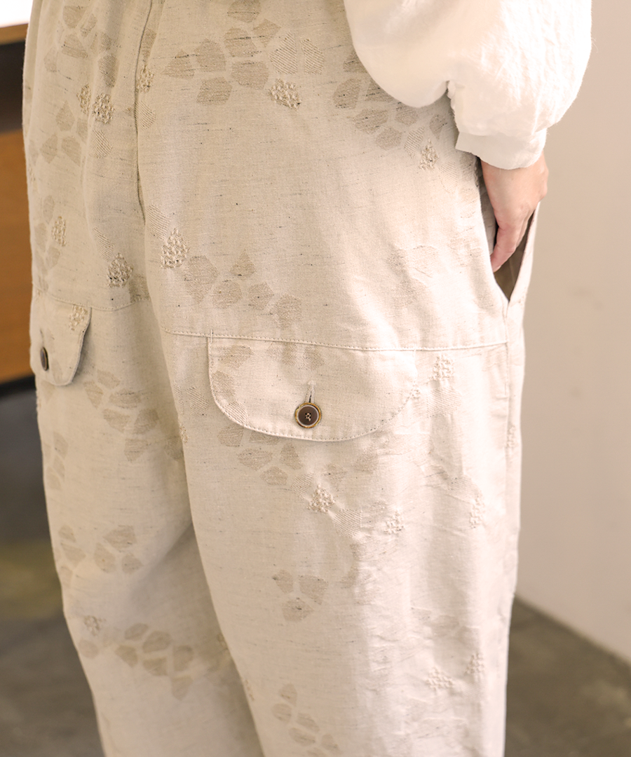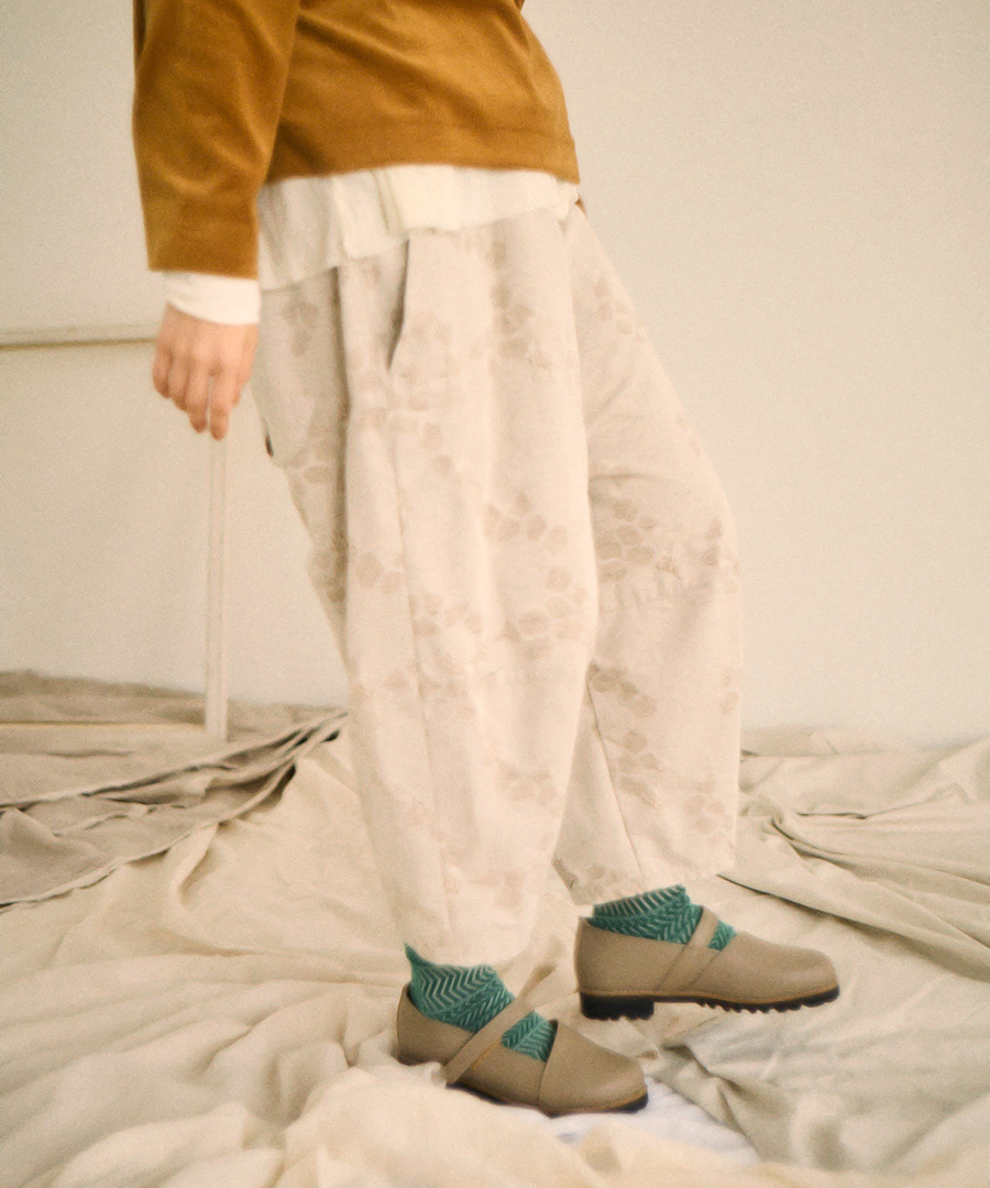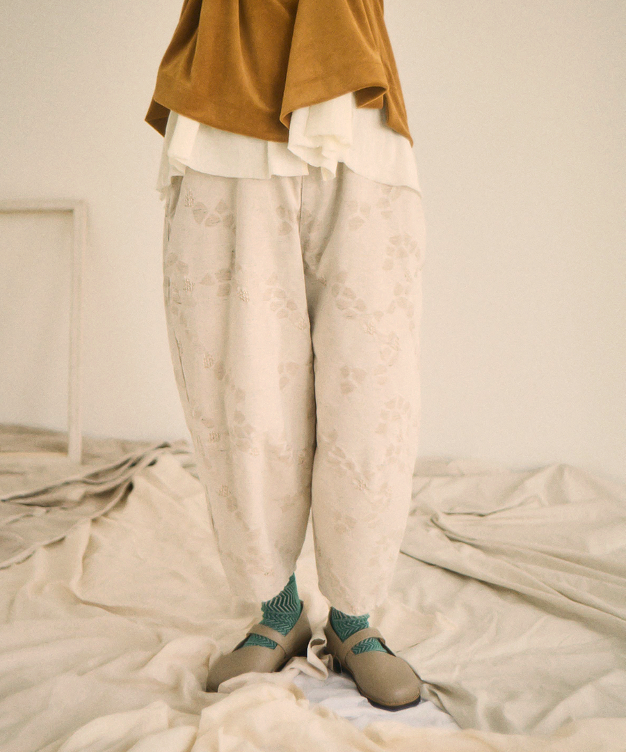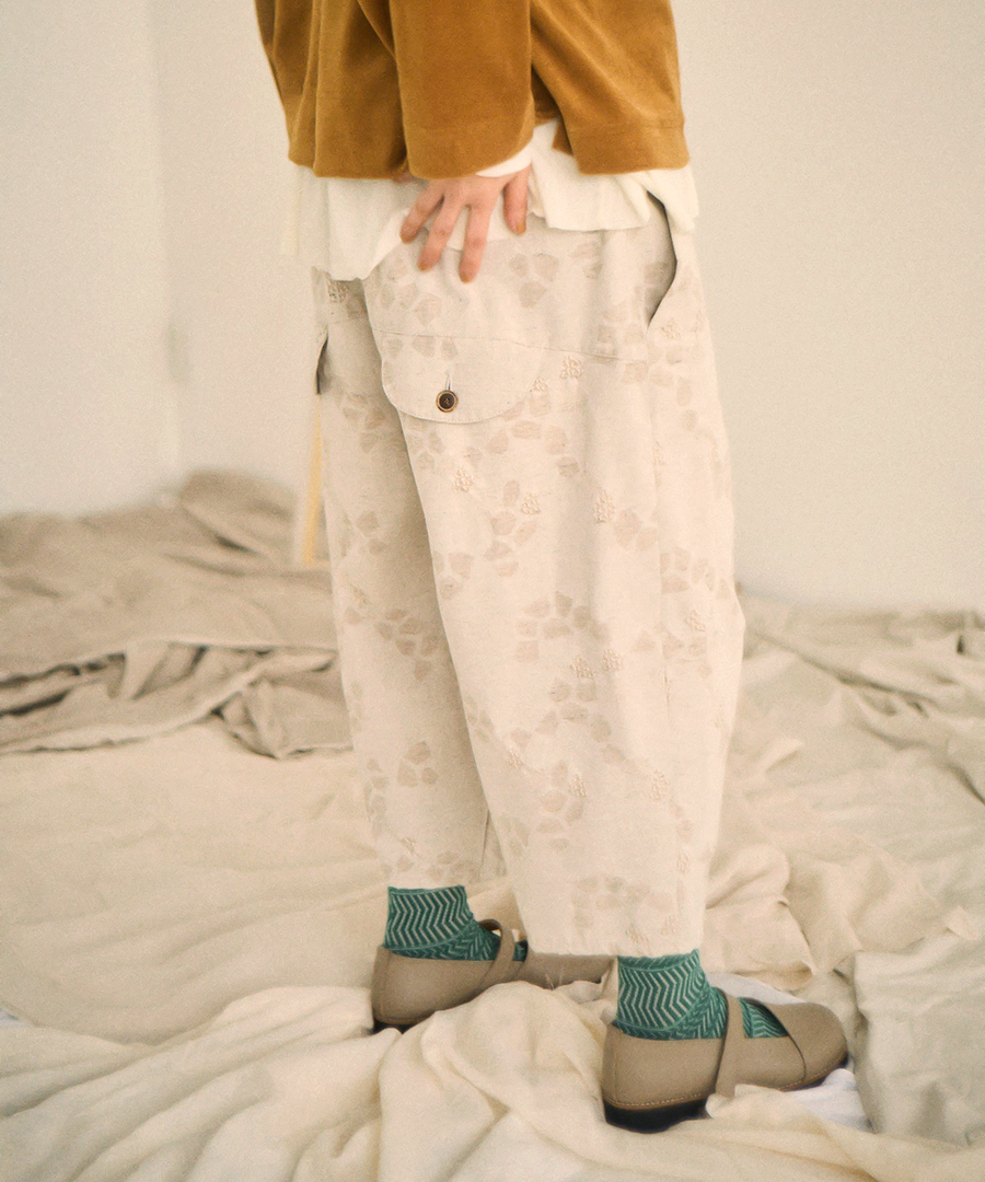 3種の織り柄を組み合わせ、ジャガード織りで幾何学柄を表現したティンカーパンツ。