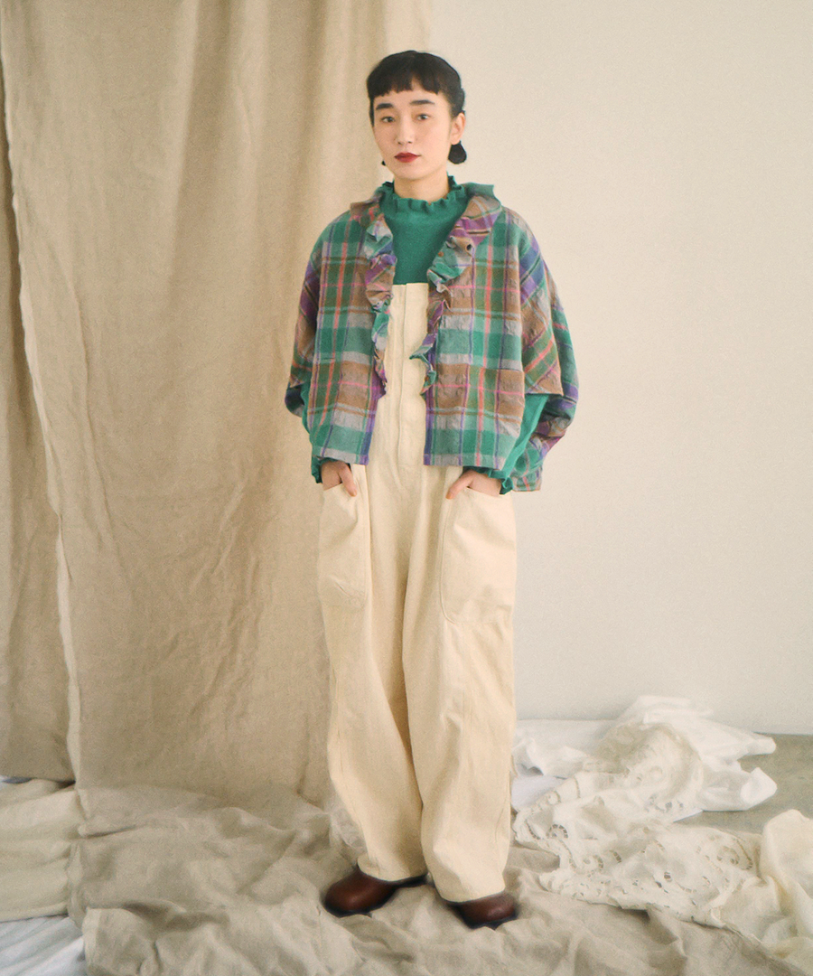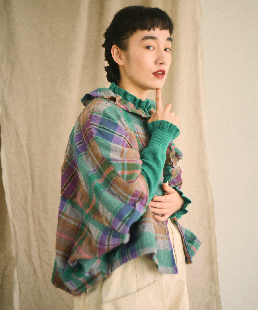 首元から前立てにかけてあしらわれたフリルと、バックの切り替えギャザーが、フェミニンで柔らかな印象を与えます。