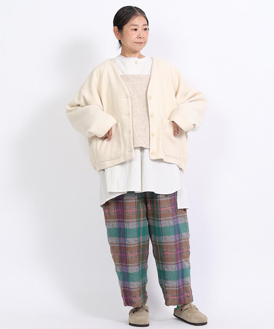 ウールの温かさとコットンの肌馴染みの良さをブレンドした素材は、軽くて暖かみのある風合いです。