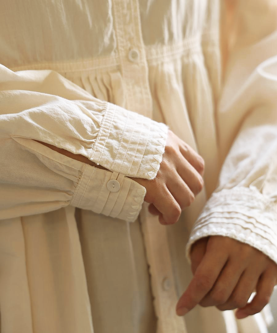 クラシカルで繊細な袖口のディテールが、手元をぐっと上品に見せてくれます。