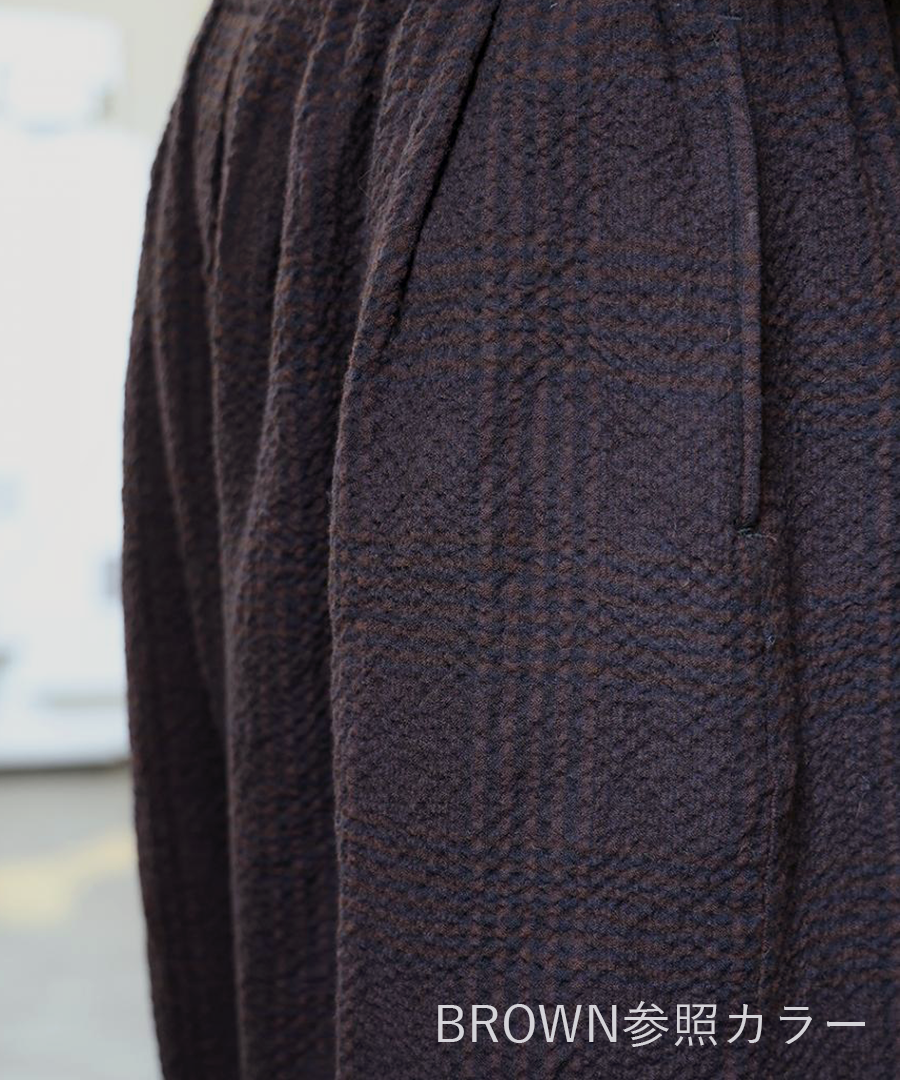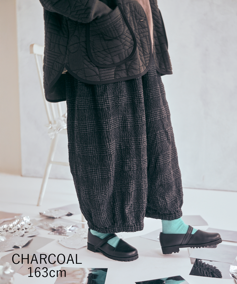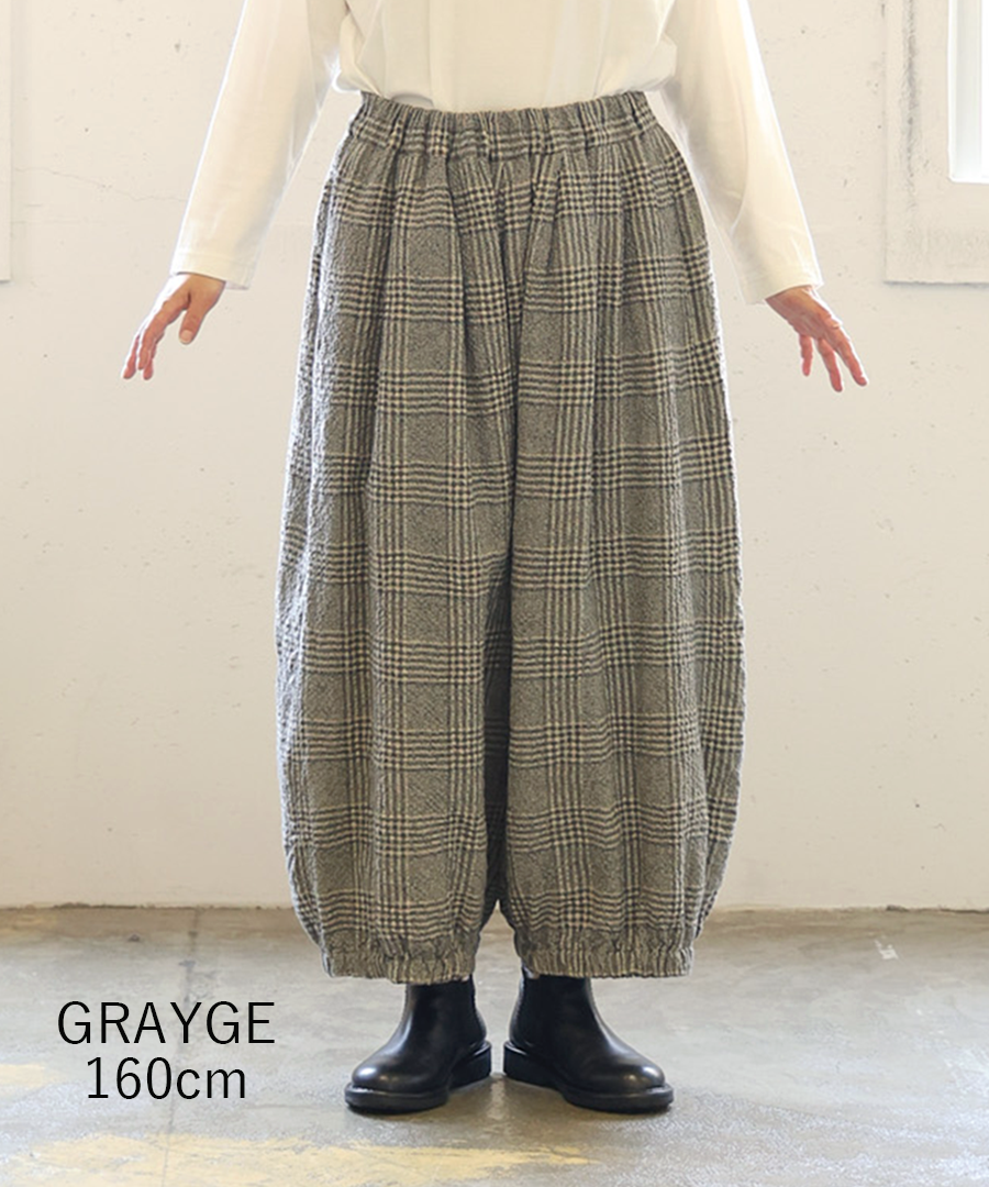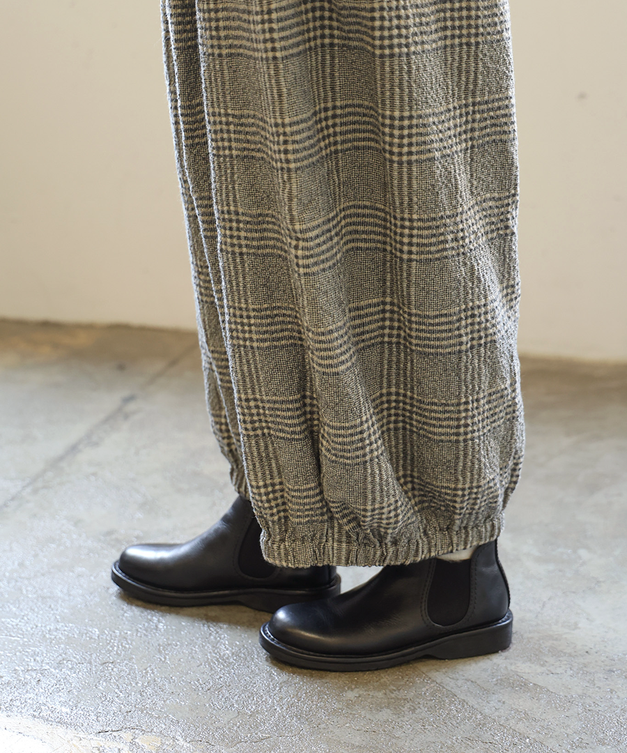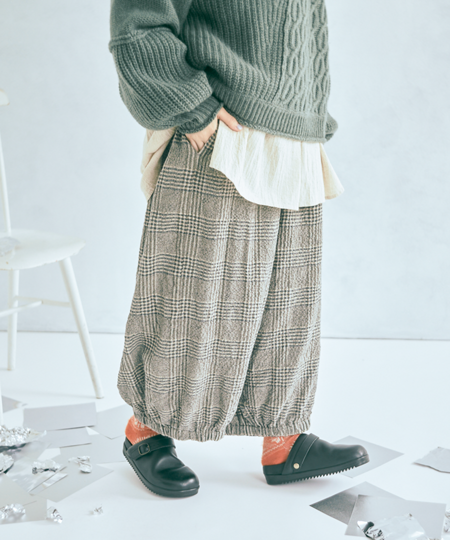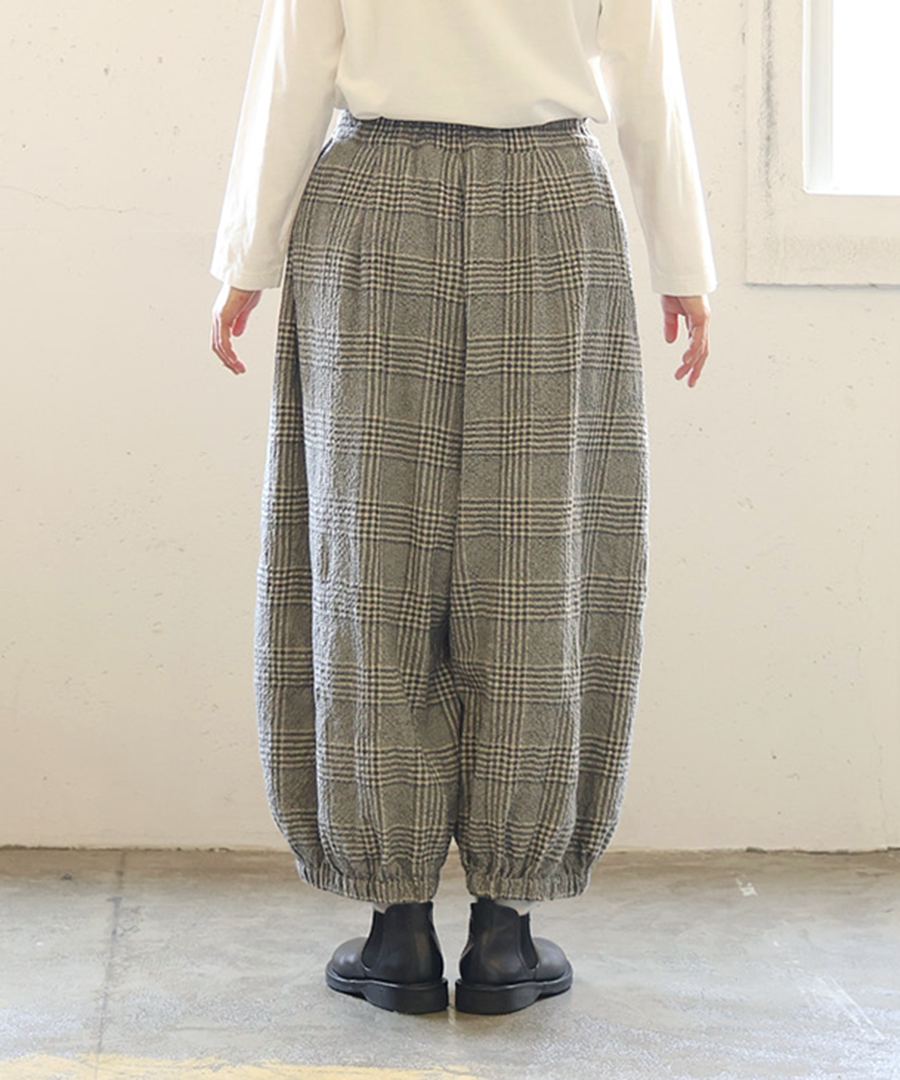 落ち着いたカラーのグレンチェック柄と立体感のある表情が魅力のバルーンパンツ。