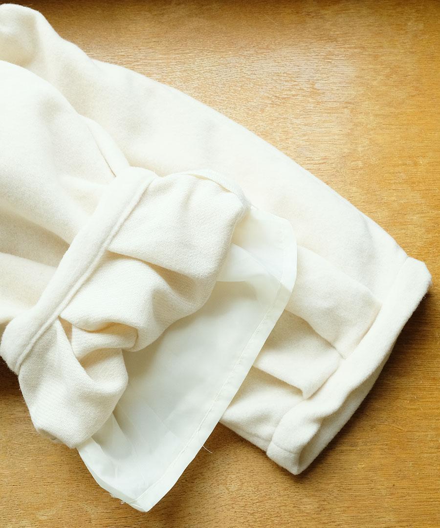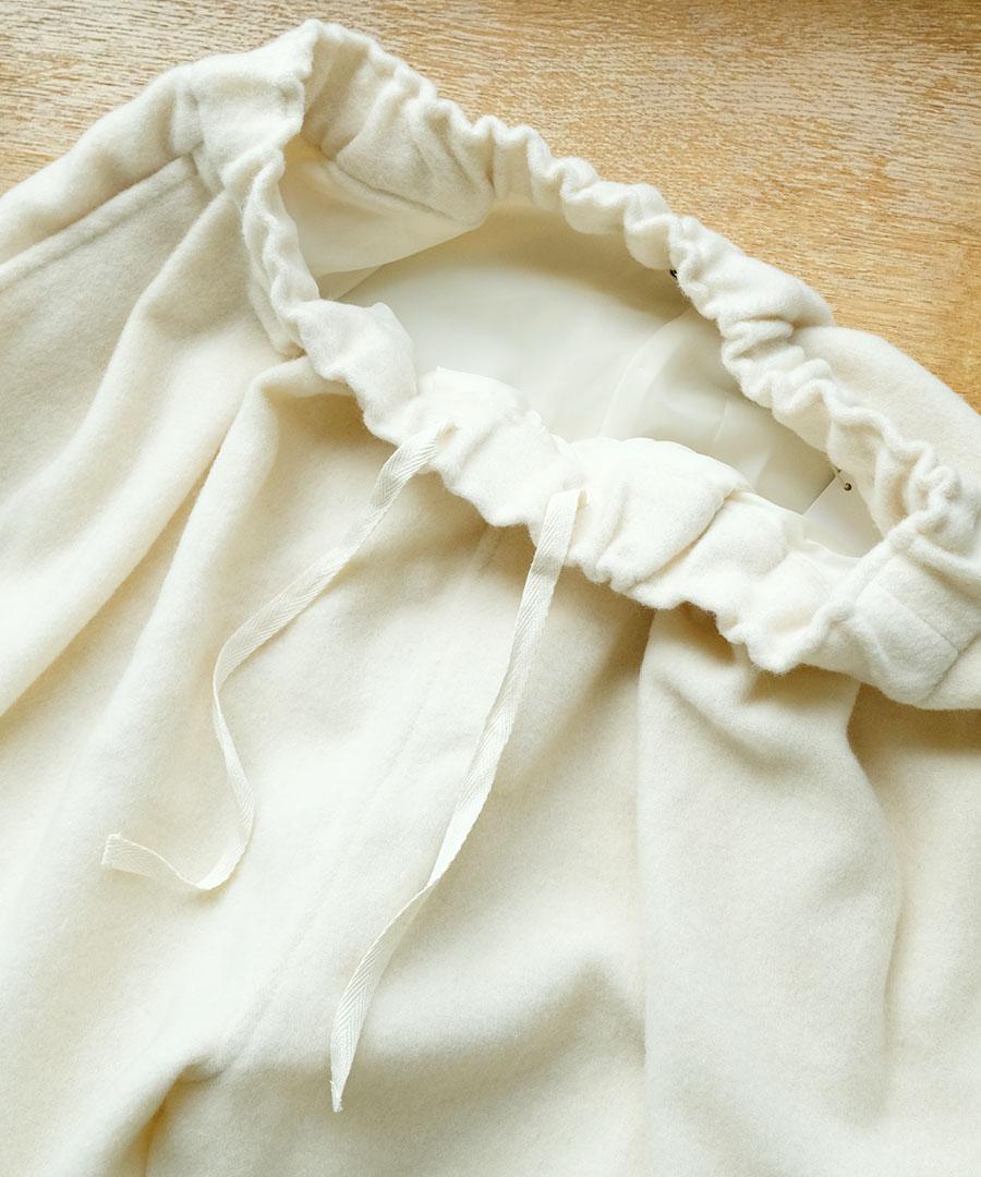 フロントのタックふんわりと丸みのあるコクーンシルエットでラインを作って
